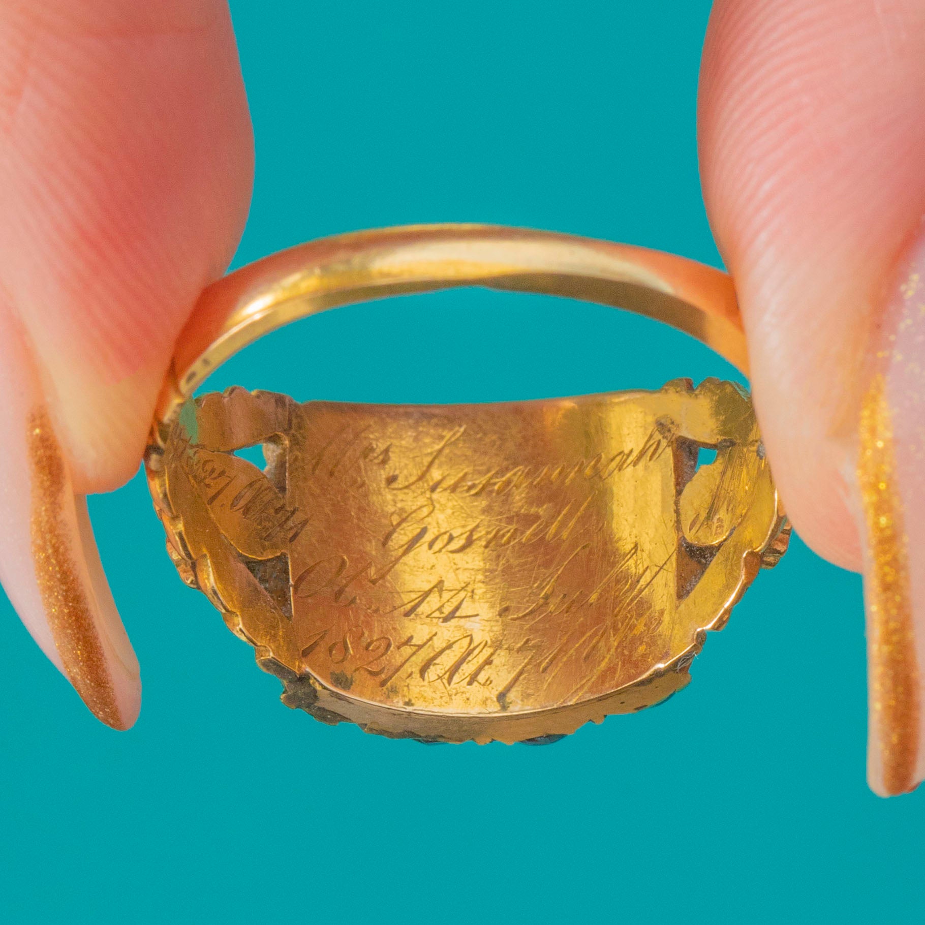 EXCELLENT: The Garnet and protective Glass top are beautifully preserved with no chips, scratches or surface wear. The Gold shank remains strong and well-shaped with minimal age-related wear. The engraved mourning inscriptions are crisp and highly legible, a testament to careful preservation over nearly two centuries.