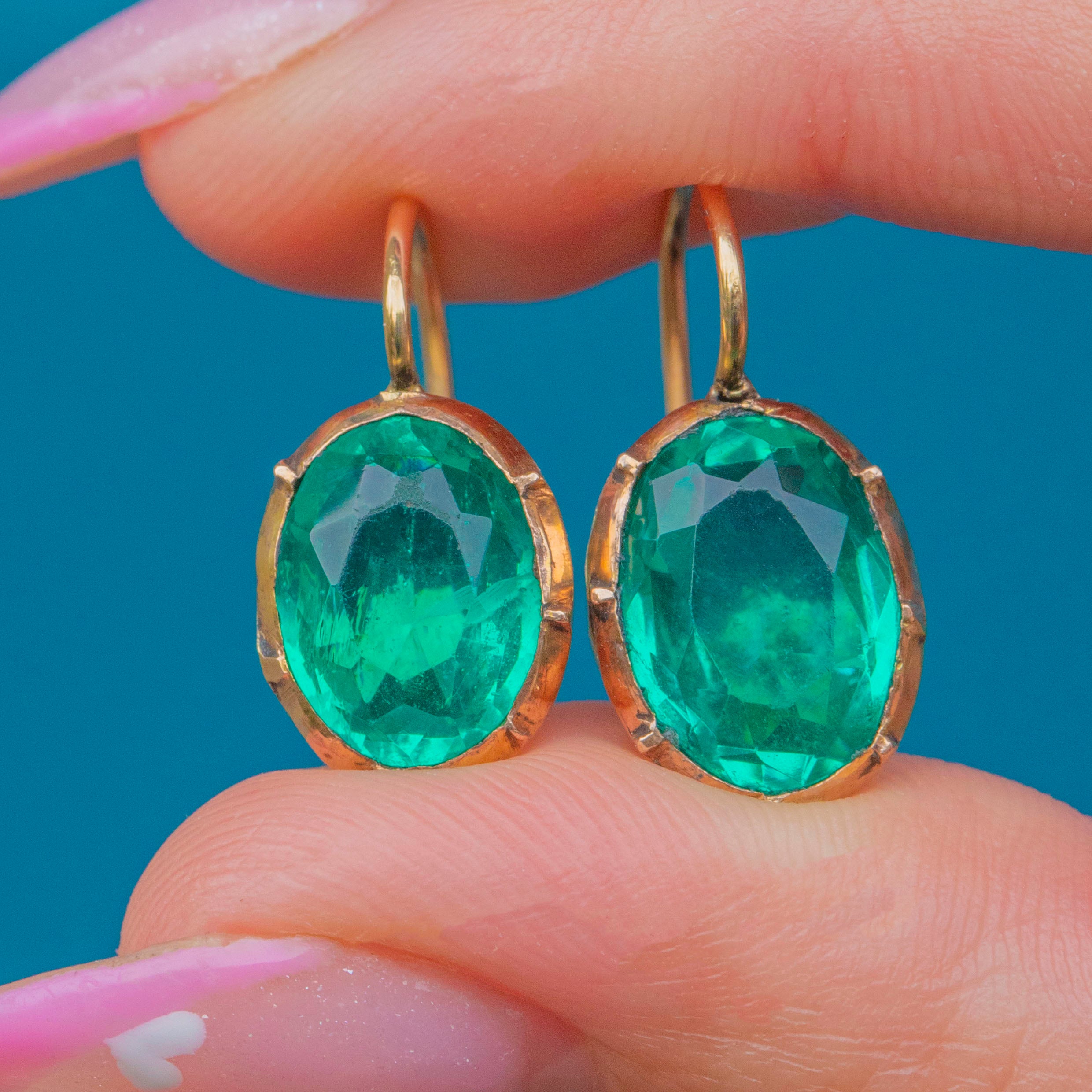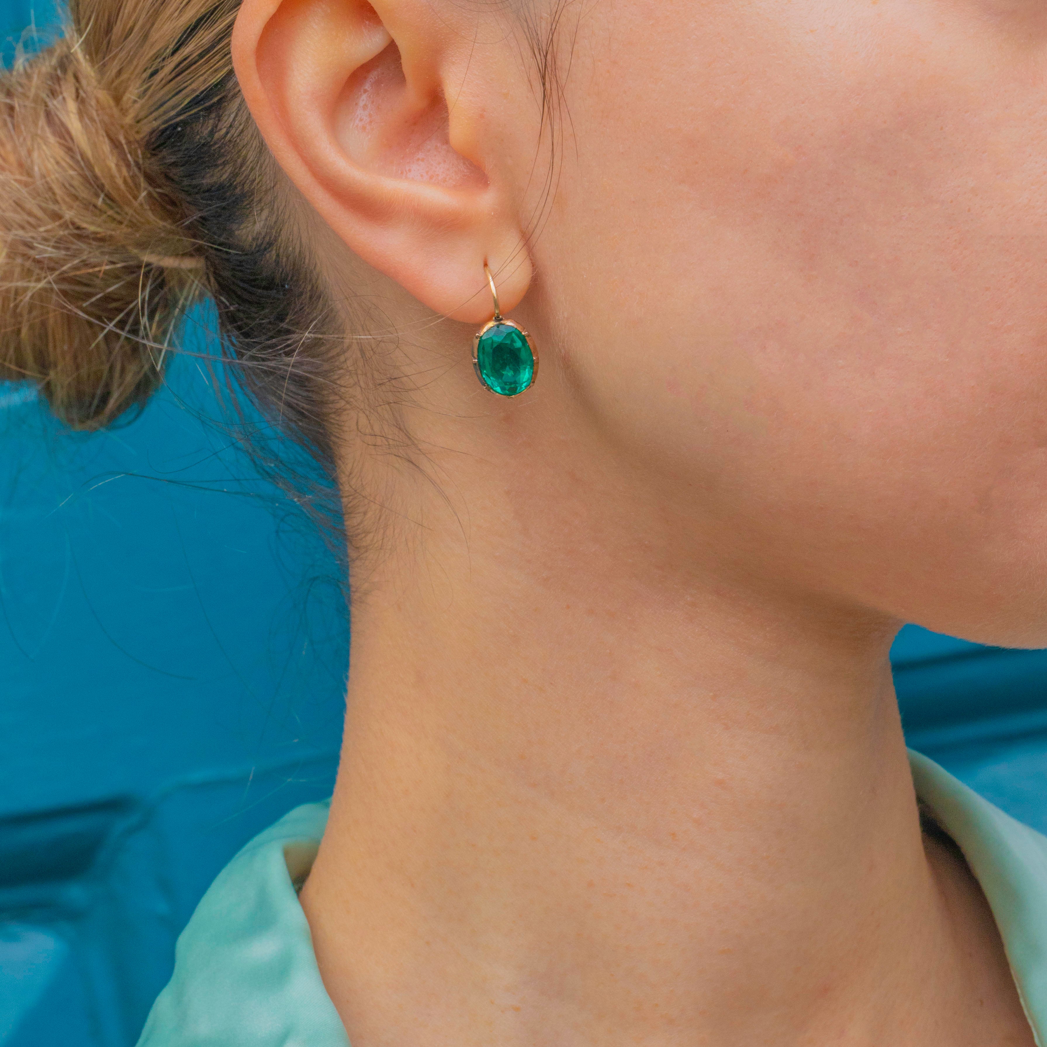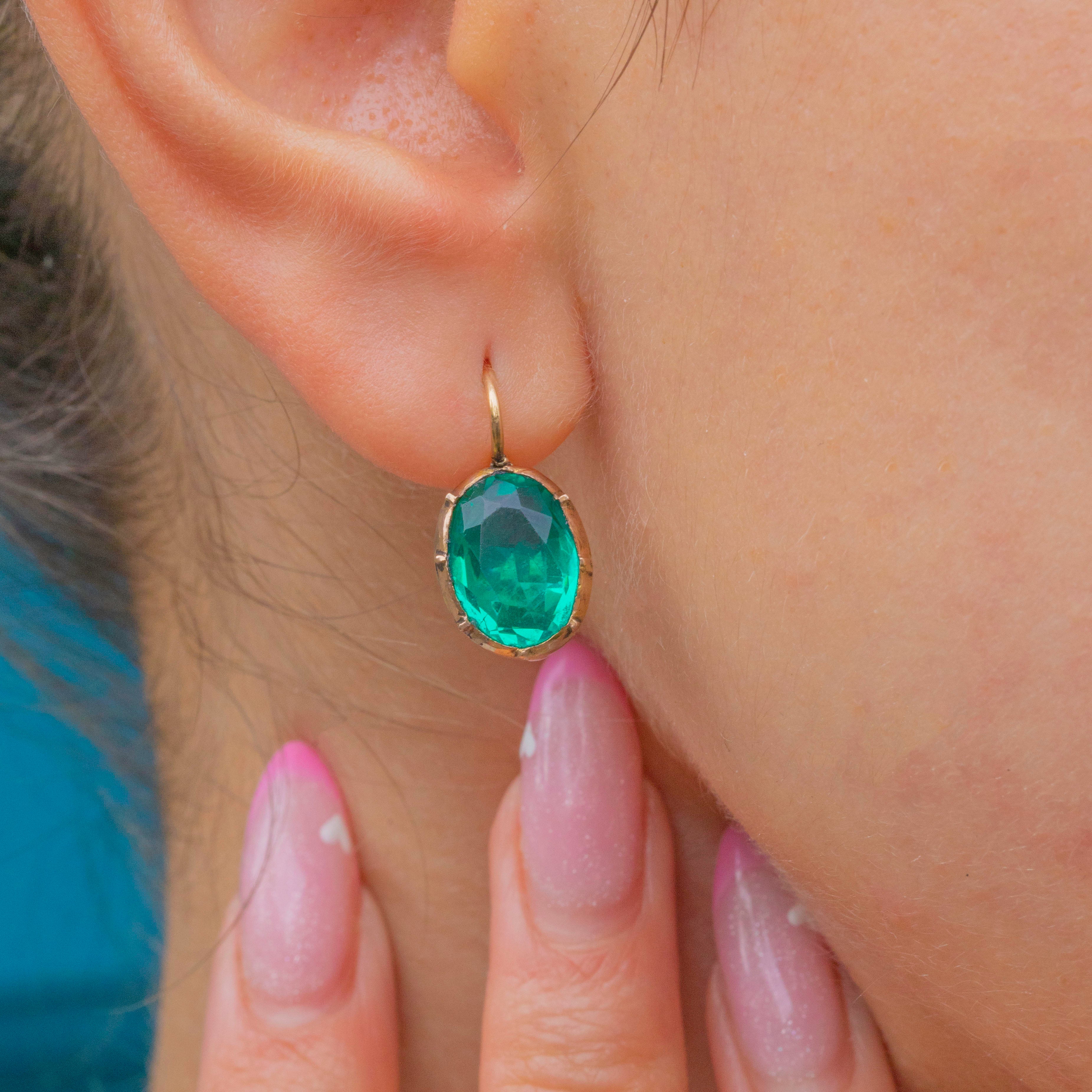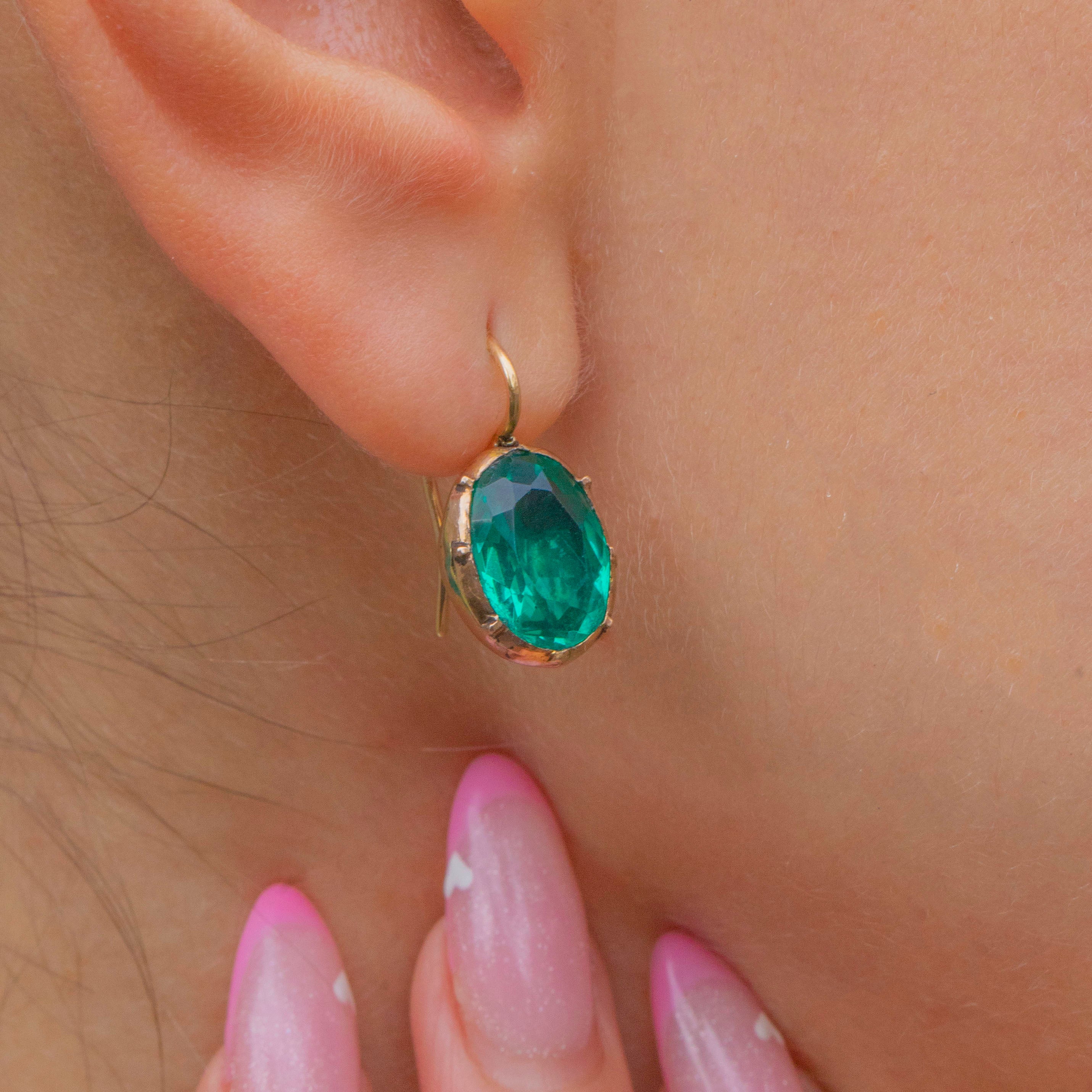 MATERIALS: Tests as 18ct Gold hooks, Gold-toned Metal settings, Green Paste stones.
