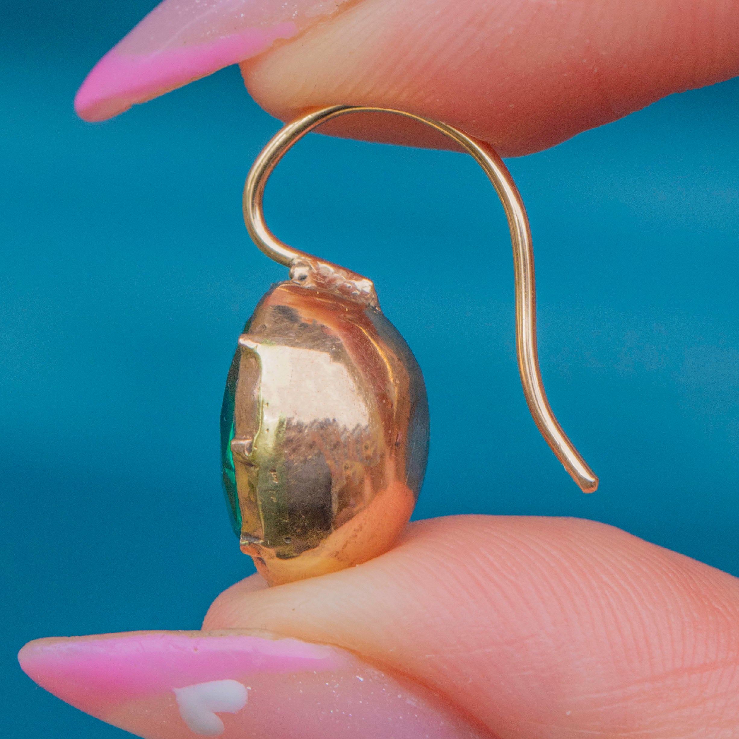 These beautiful Georgian earrings feature vivid green paste stones in rich Gold-toned settings, suspended from solid 18ct Gold hooks. Their rounded button form and bright, lively colour make them a wonderful example of early 19th-century craftsmanship.