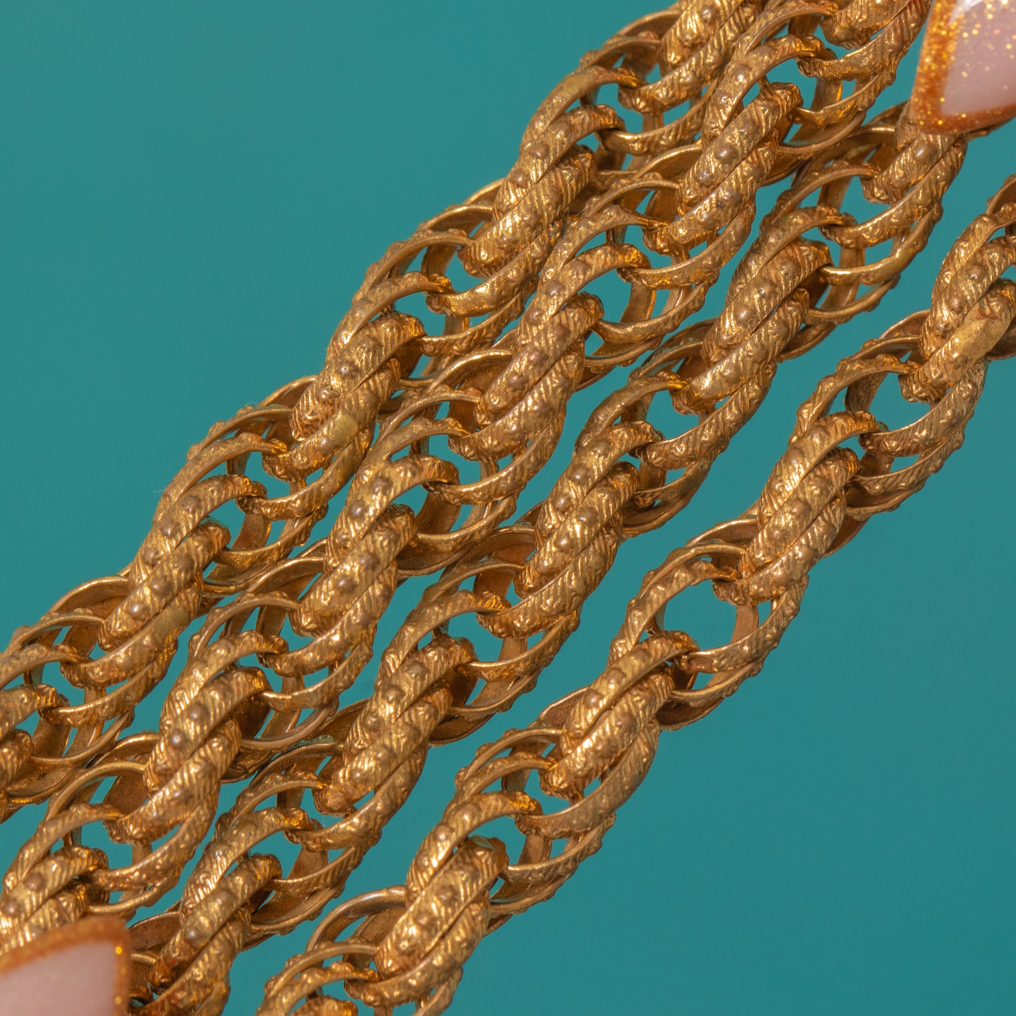 The chain itself is composed of warm golden Pinchbeck, richly patinated and beautifully preserved, its generous 44" length allowing for multiple styling options. An exceptional piece of Georgian craftsmanship, full of history, charm, and romantic symbolism.