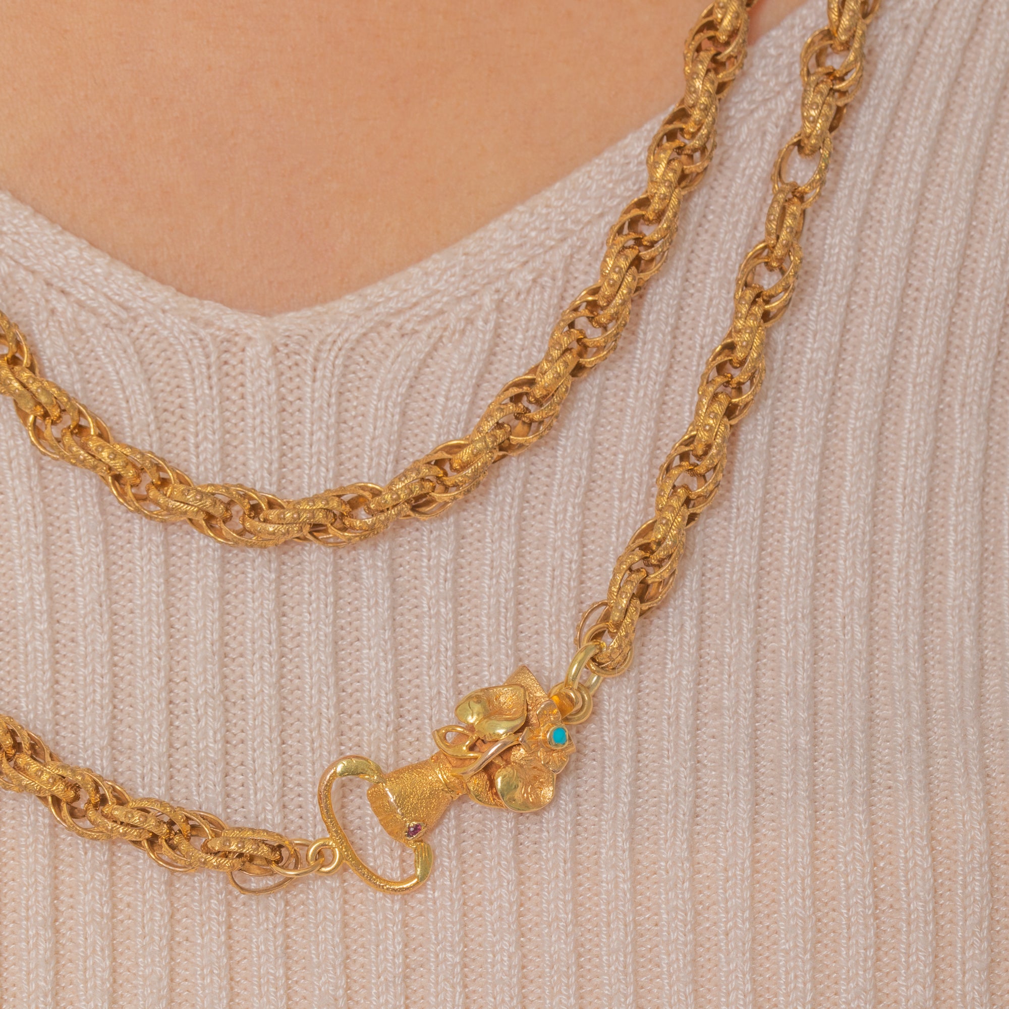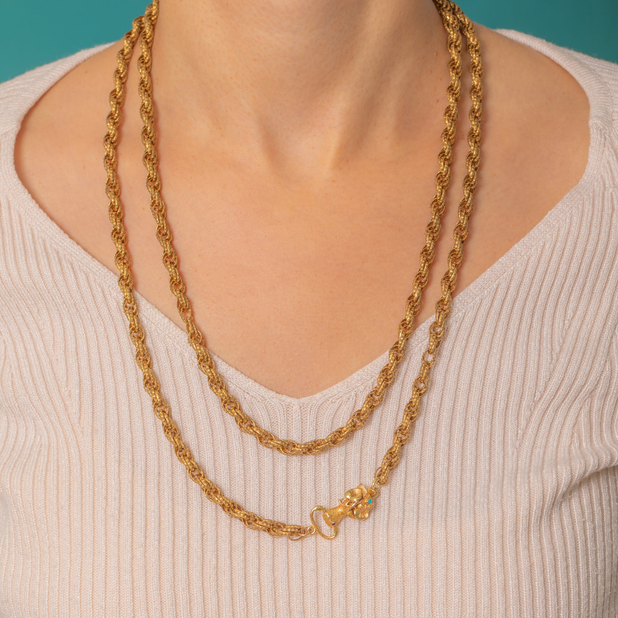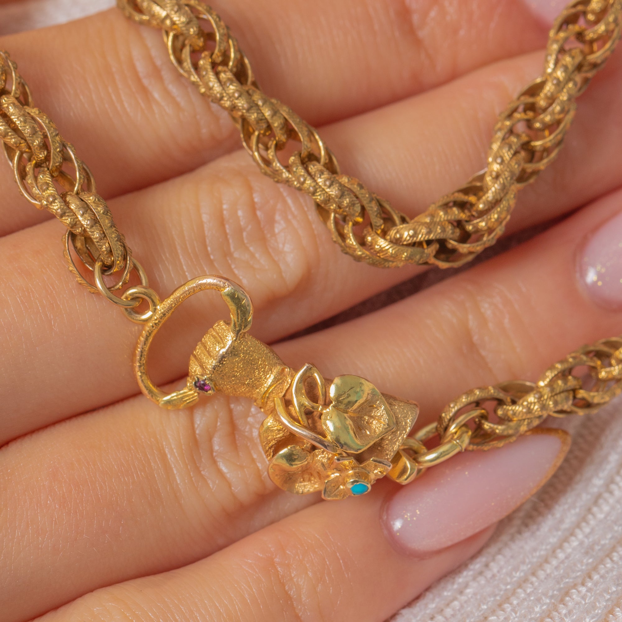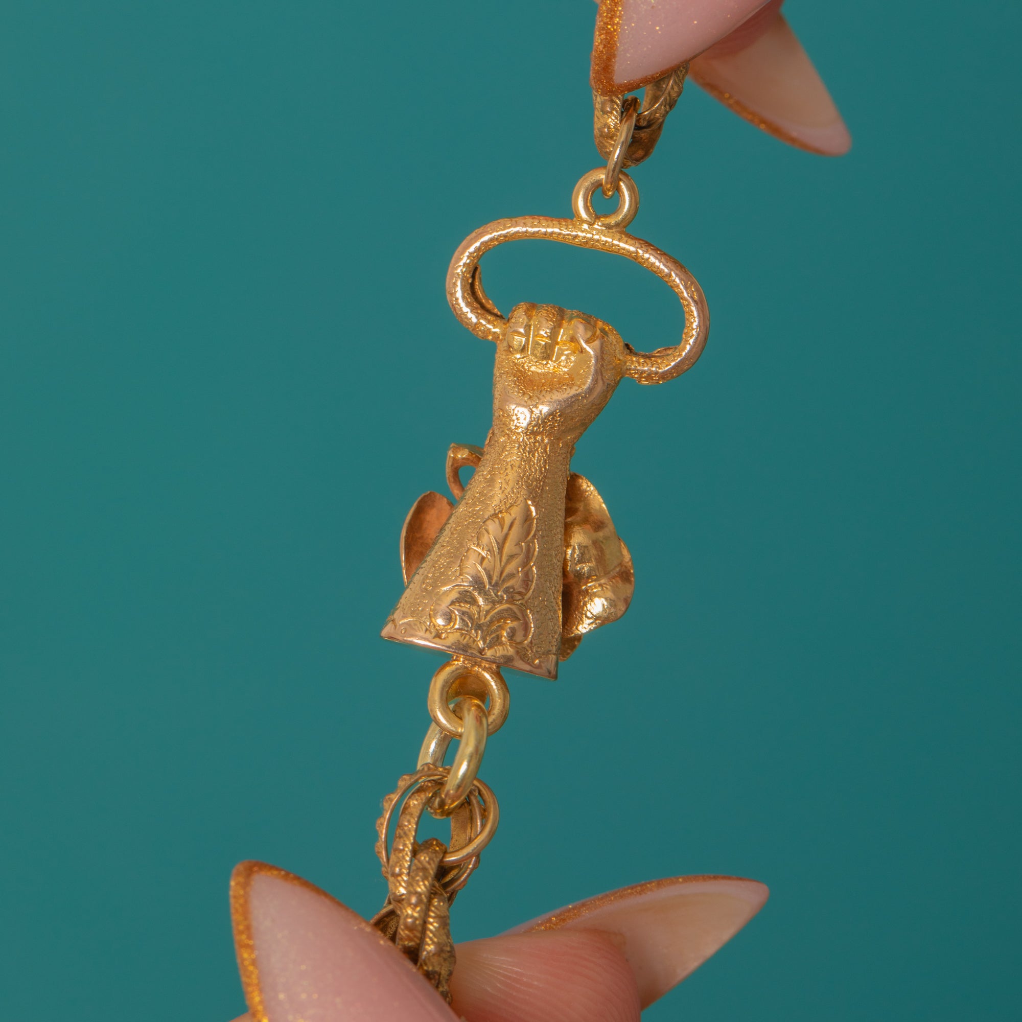 This magnificent Georgian chain is a rare survival from the late 18th century, featuring a beautifully modelled hand clasp crafted in solid Gold. The clasp is adorned with a Turquoise cuff detail and a tiny Ruby ring on the finger — a symbolic and sentimental touch so characteristic of Georgian jewellery.