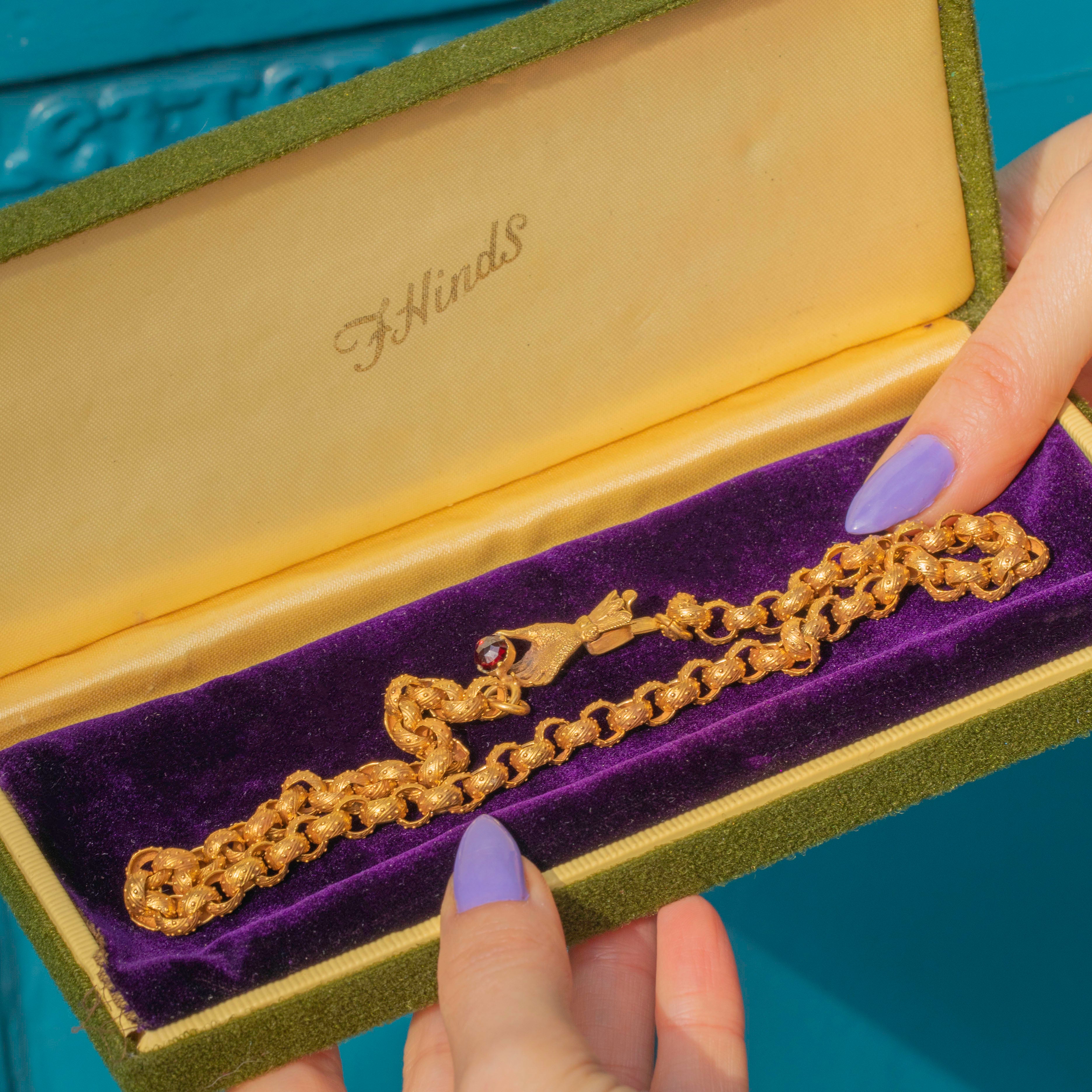 This Georgian Pinchbeck Garnet hand clasp necklace is a delightful dream! The chunky belcher links are secured by a hand-clasp grasping for a deep red Garnet, as if picking a berry from a tree. We simply adore the extravagance and theatrics of the Georgian piece!