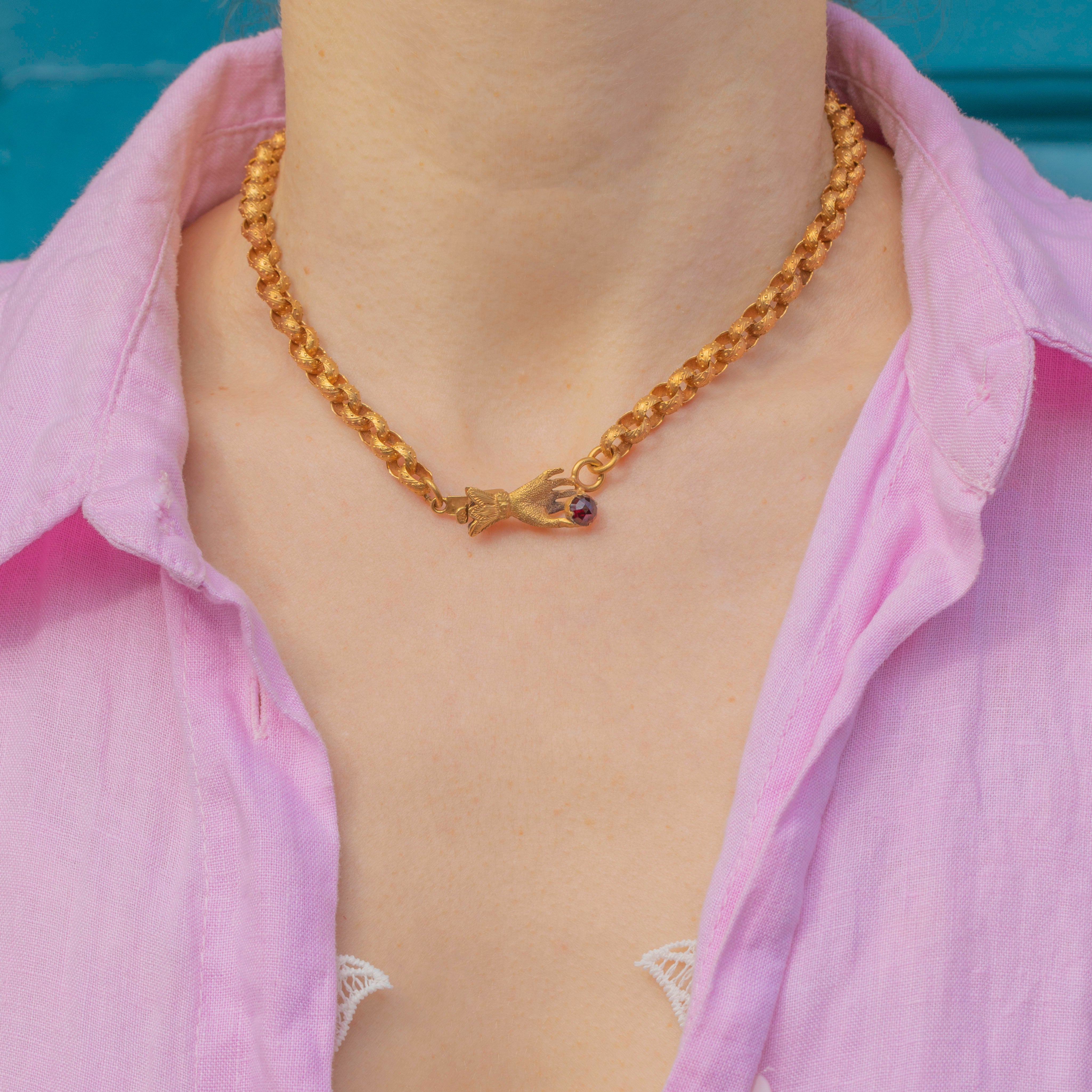 Her merlot-hued Garnet perfectly complements the golden honey hues of the Pinchbeck. During the Georgian period, Pinchbeck was used as an affordable alternative to Gold, and having retained every inch of her splendour, you can see what makes her so desirable! The necklace sits uber comfortably against the skin, and at a wearable length of 15.5", you'll be reaching for her often!