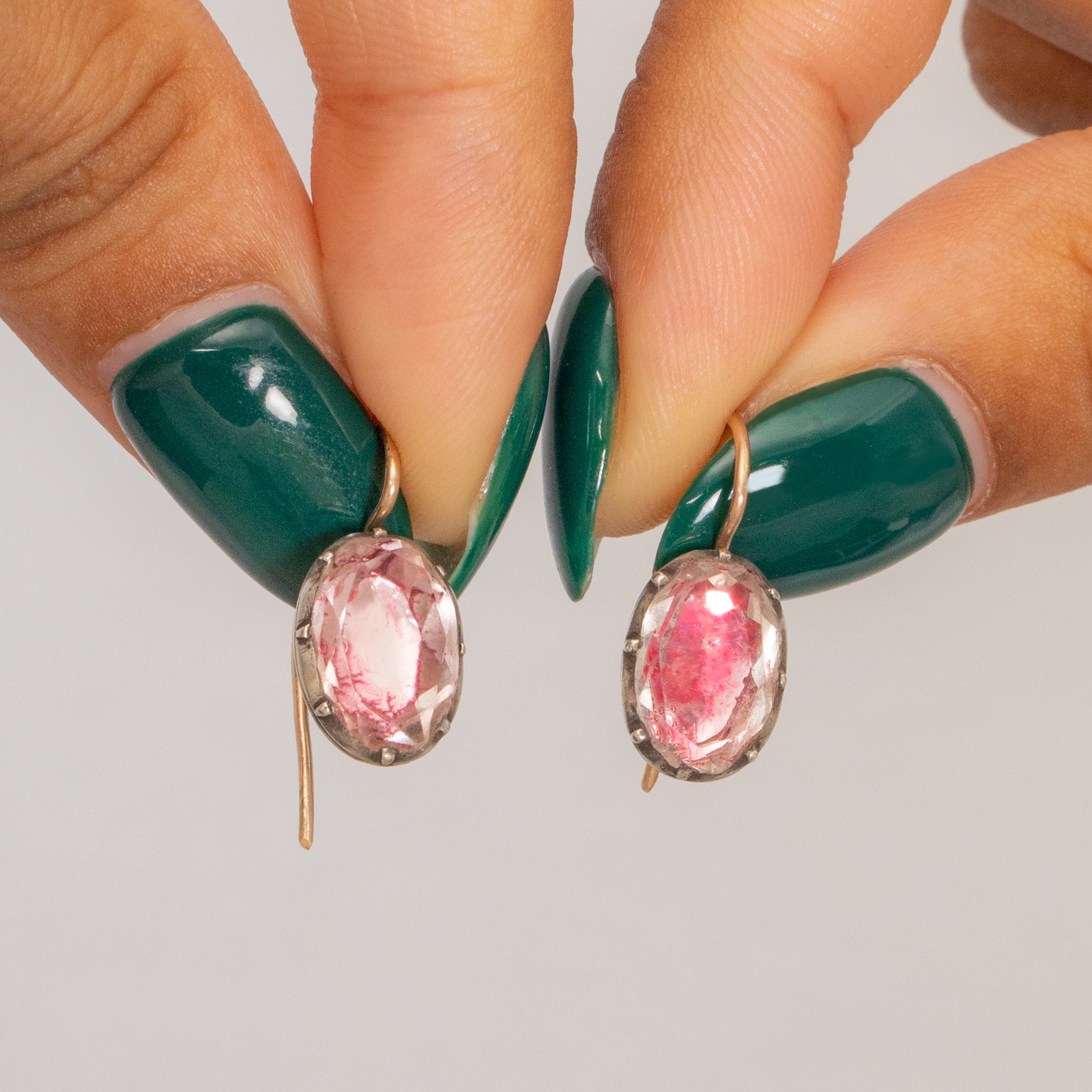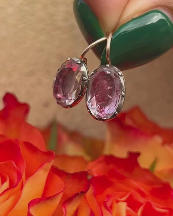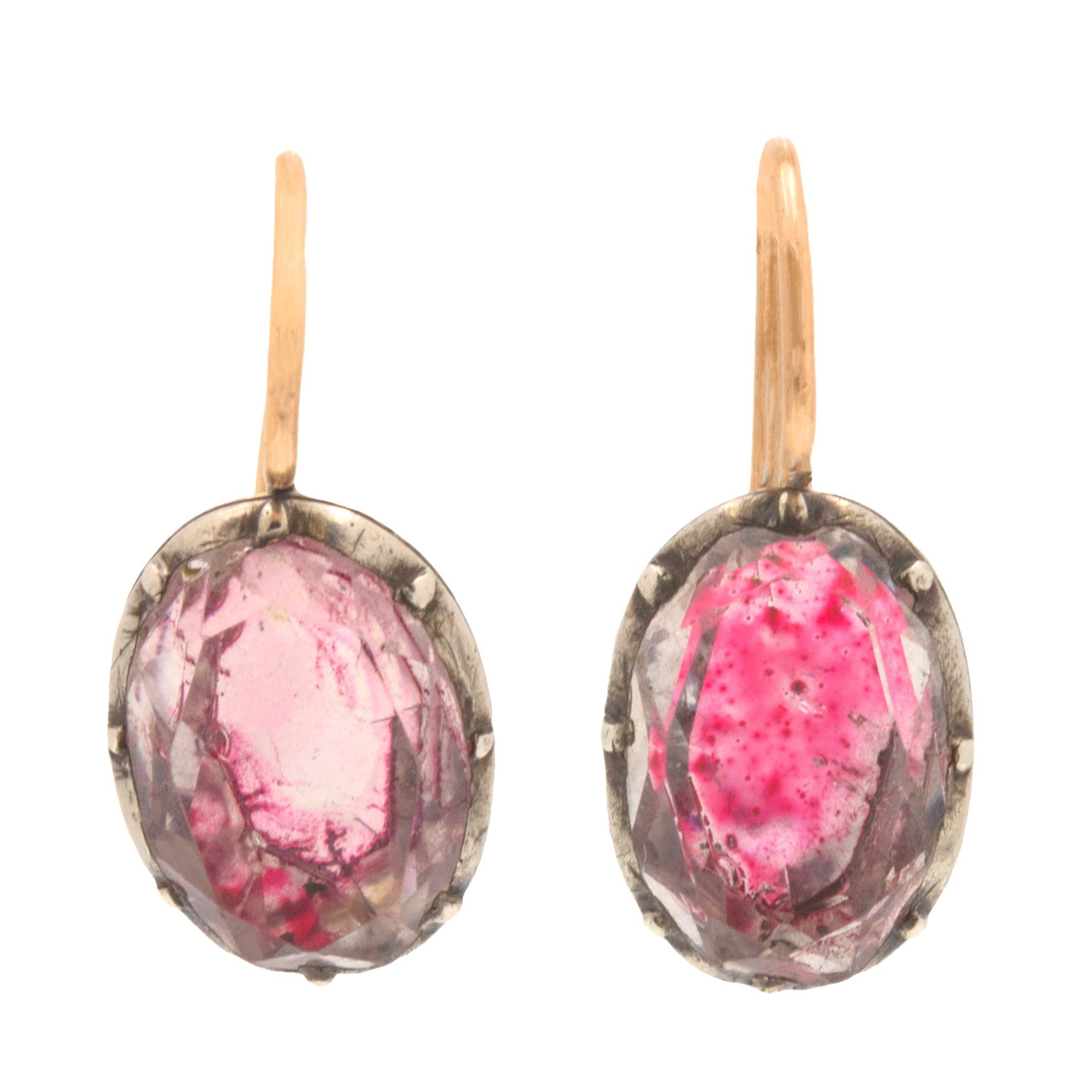 VERY GOOD. We are pleased to present these Georgian pink foiled Paste oval button earrings in very good condition! The foiled Paste have a bold fuchsia hue and the foiling is crisp and the Paste secure within their settings. There is some subtle surface wear to the edges of the facets but nothing untoward. On the back of the settings, there are a few soft scratches around the ear hooks and remanence of a previous conversion at the centre, but these cannot be seen when worn. A delicate pair, they will add bundles of charm to any attire!