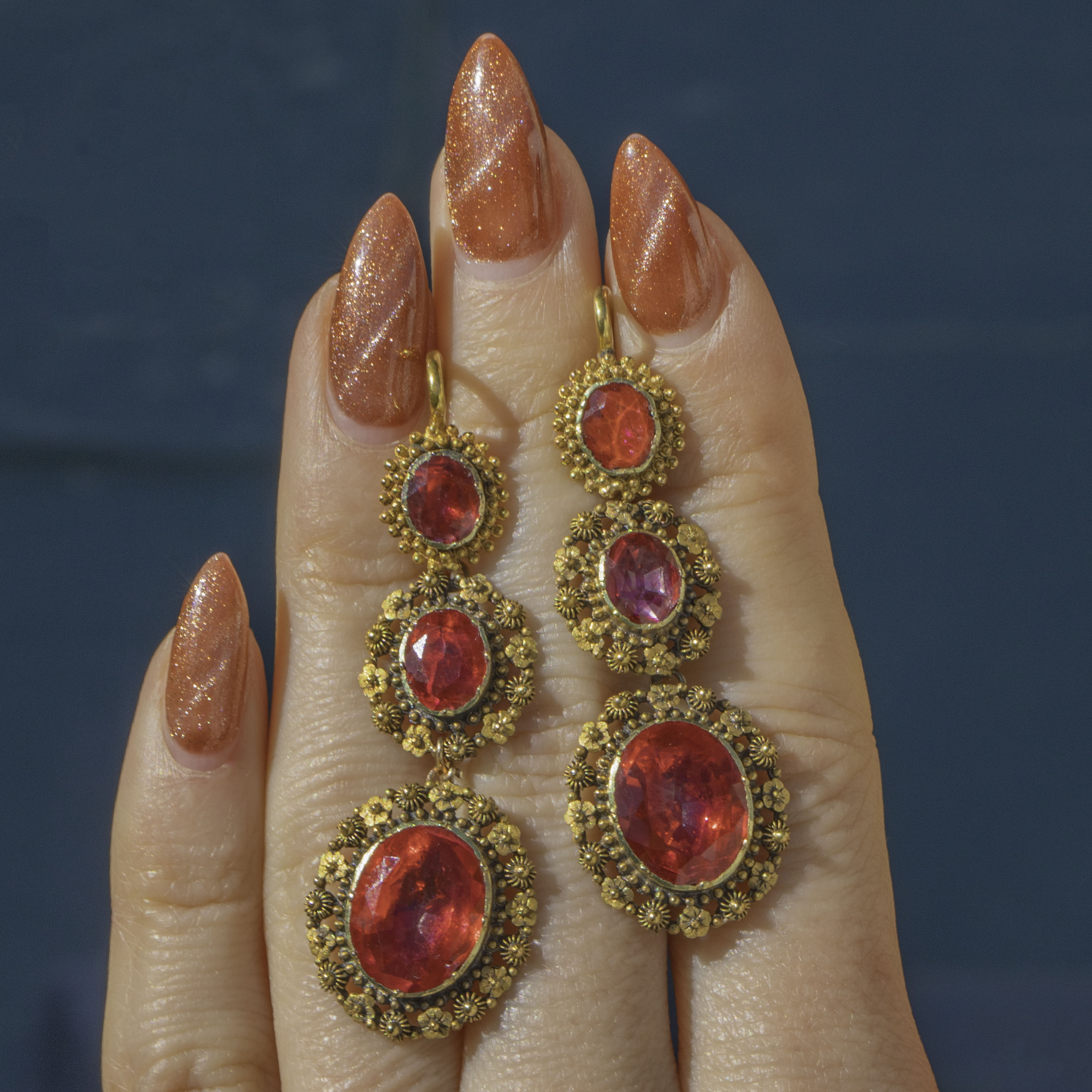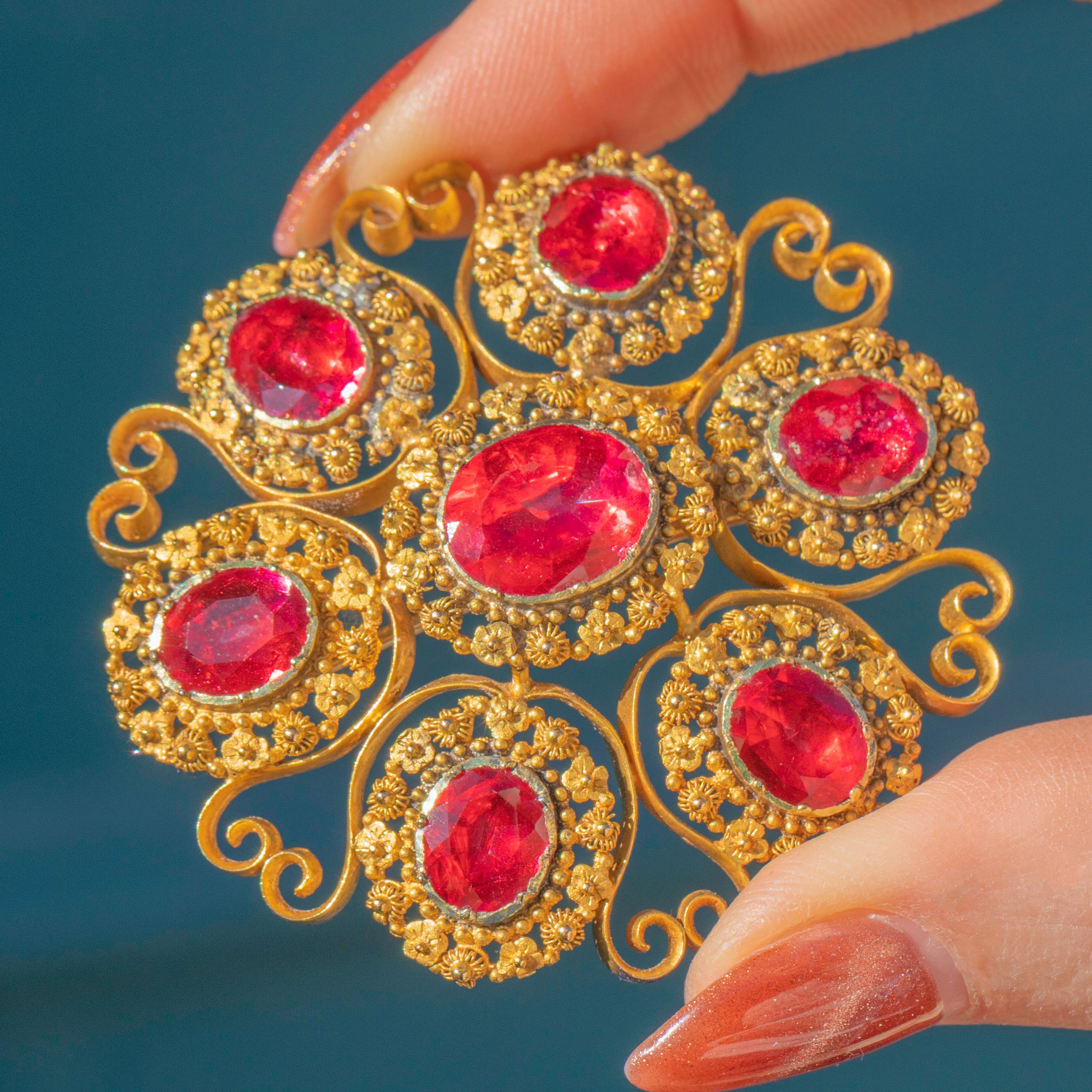 The Georgians were lovers of a parure, a full set of jewellery containing a necklace, earrings, pendant and brooch. A demi-parure comprises two to three pieces, and this one has been made with 18ct Gold and pink foiled Rock Crystal gemstones. The intricacy of the cannettille work and floral details of the Golden Pinchbeck are simply breathtaking, enhanced by the bright magenta tones of the foiled crystals