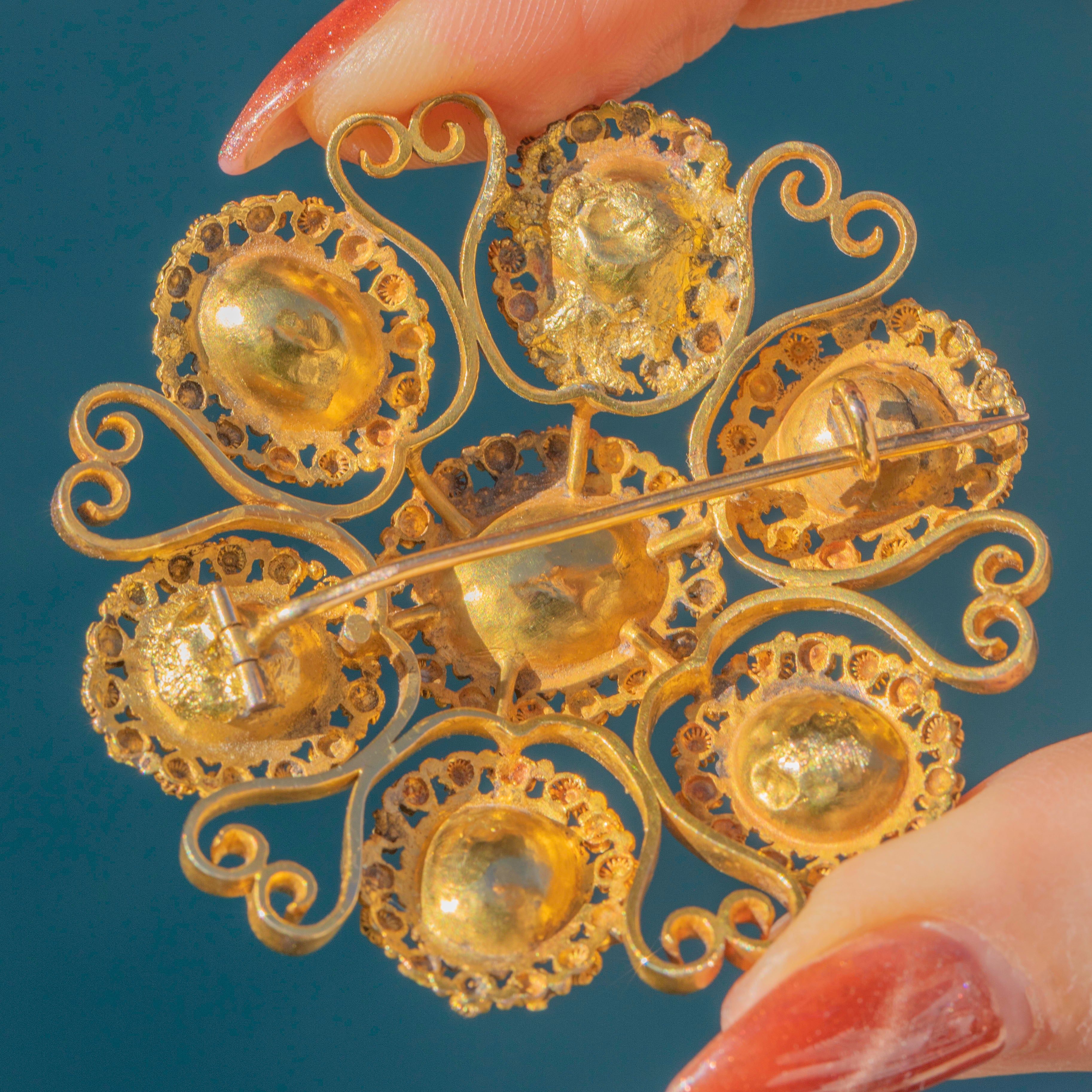 Brooch: 18ct Gold body (structured sections), Pinchbeck cannetille work, 15ct Gold pin.