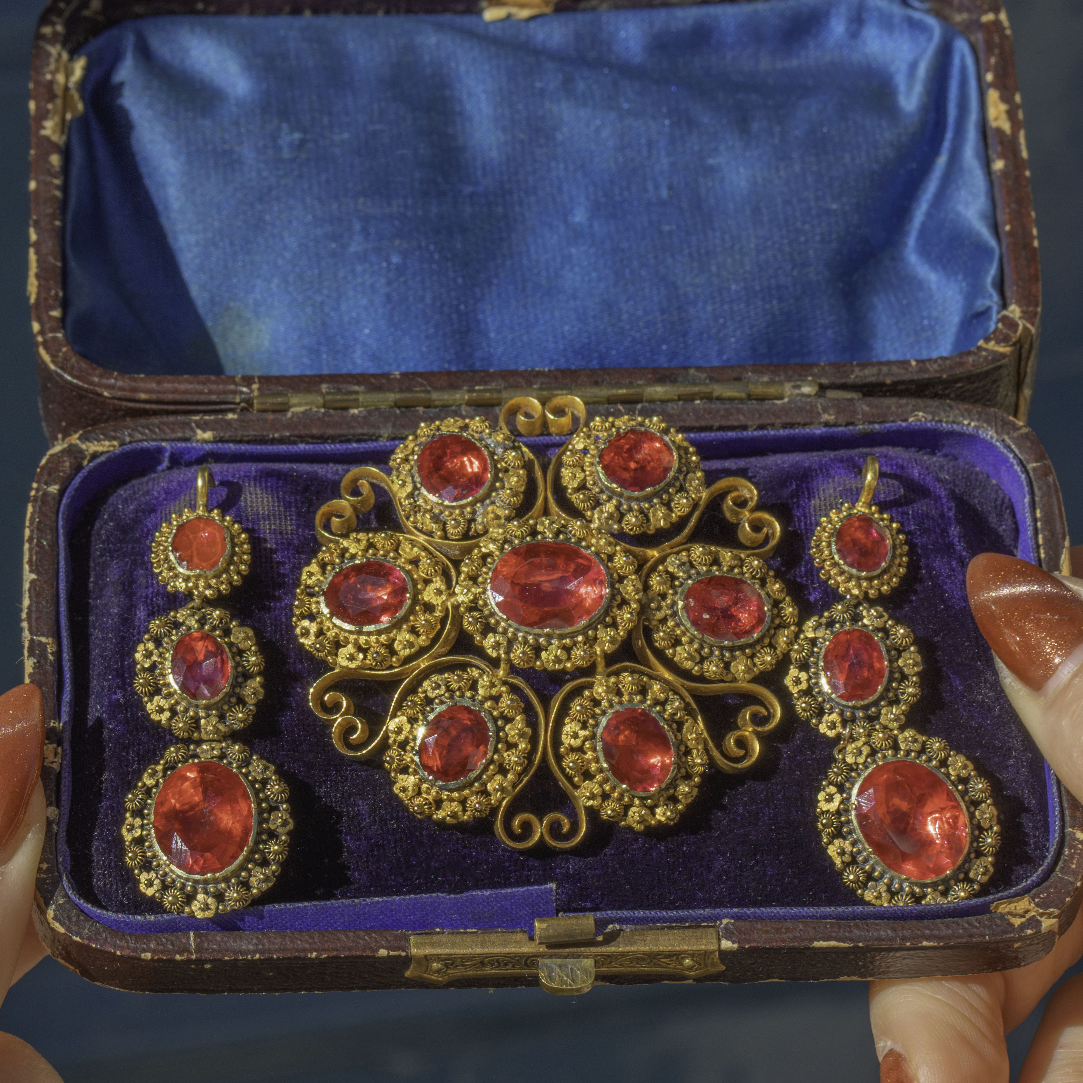 The fitted box allows each of these pieces to be kept safe. The box has some minor wear and tear visible, but given it has been responsible for safeguarding the demi-parure, it's lasted very well.