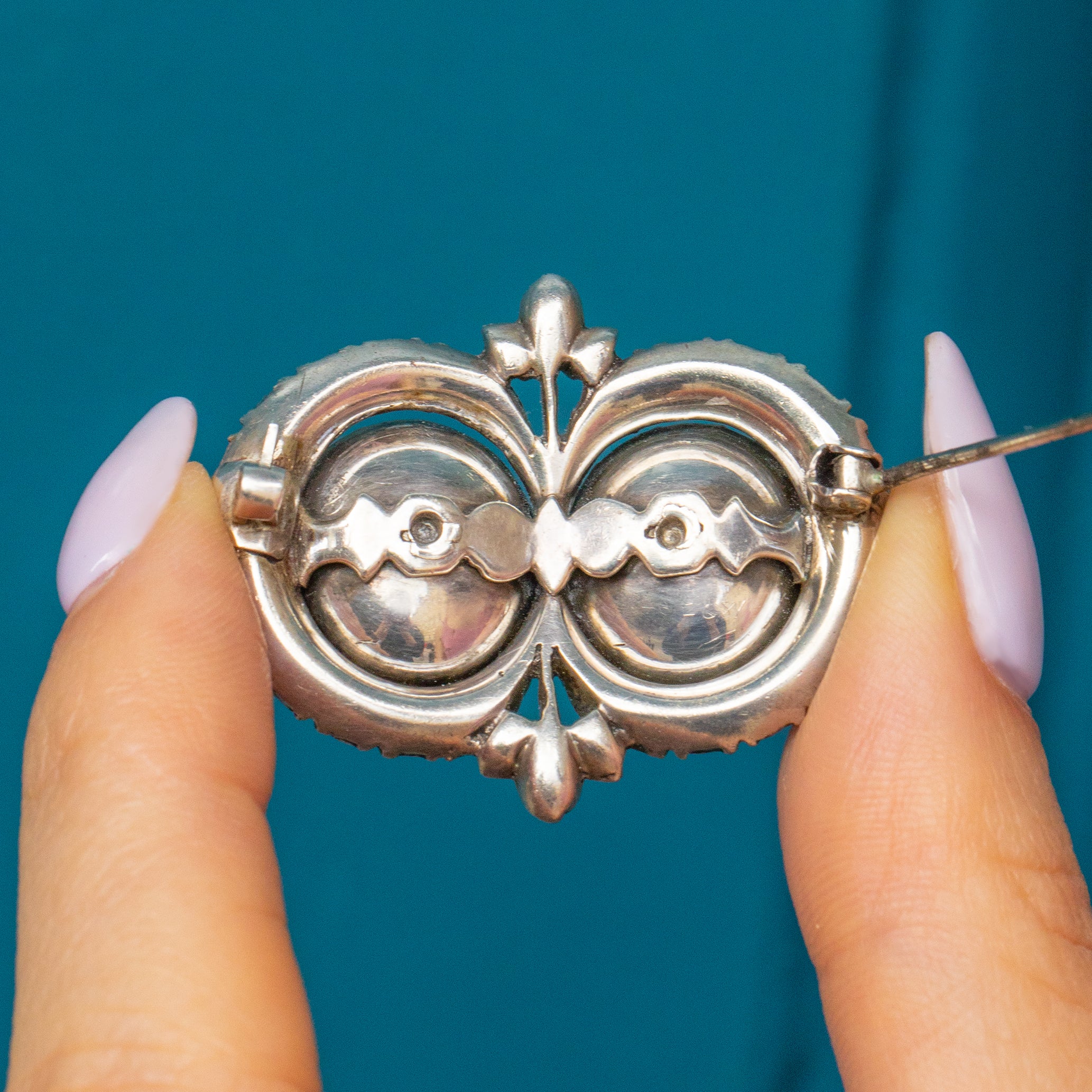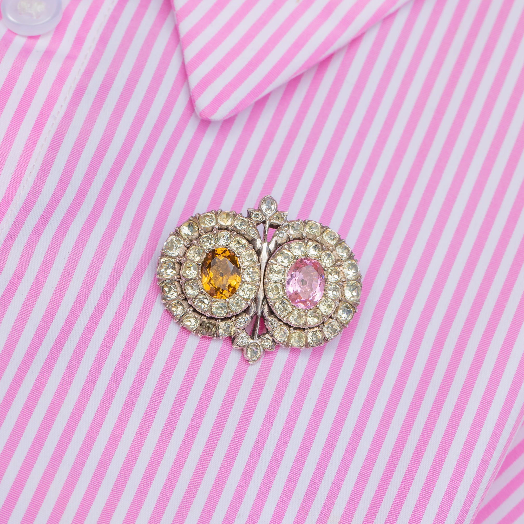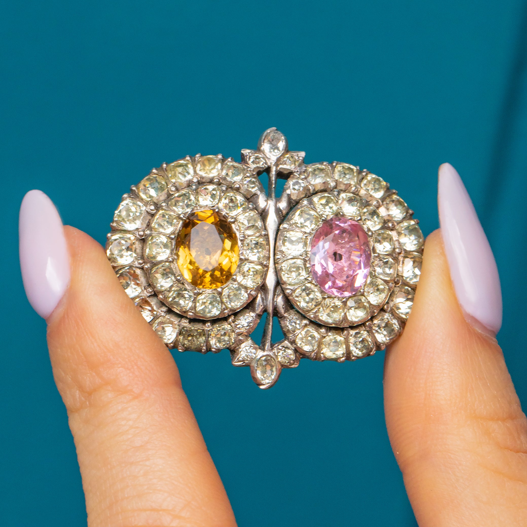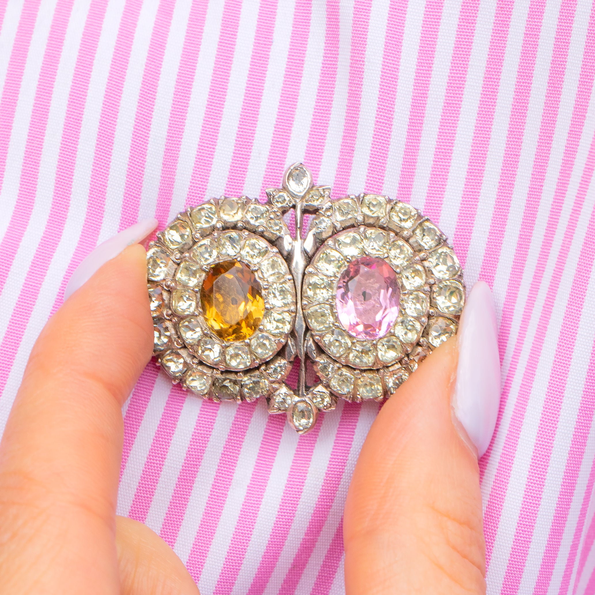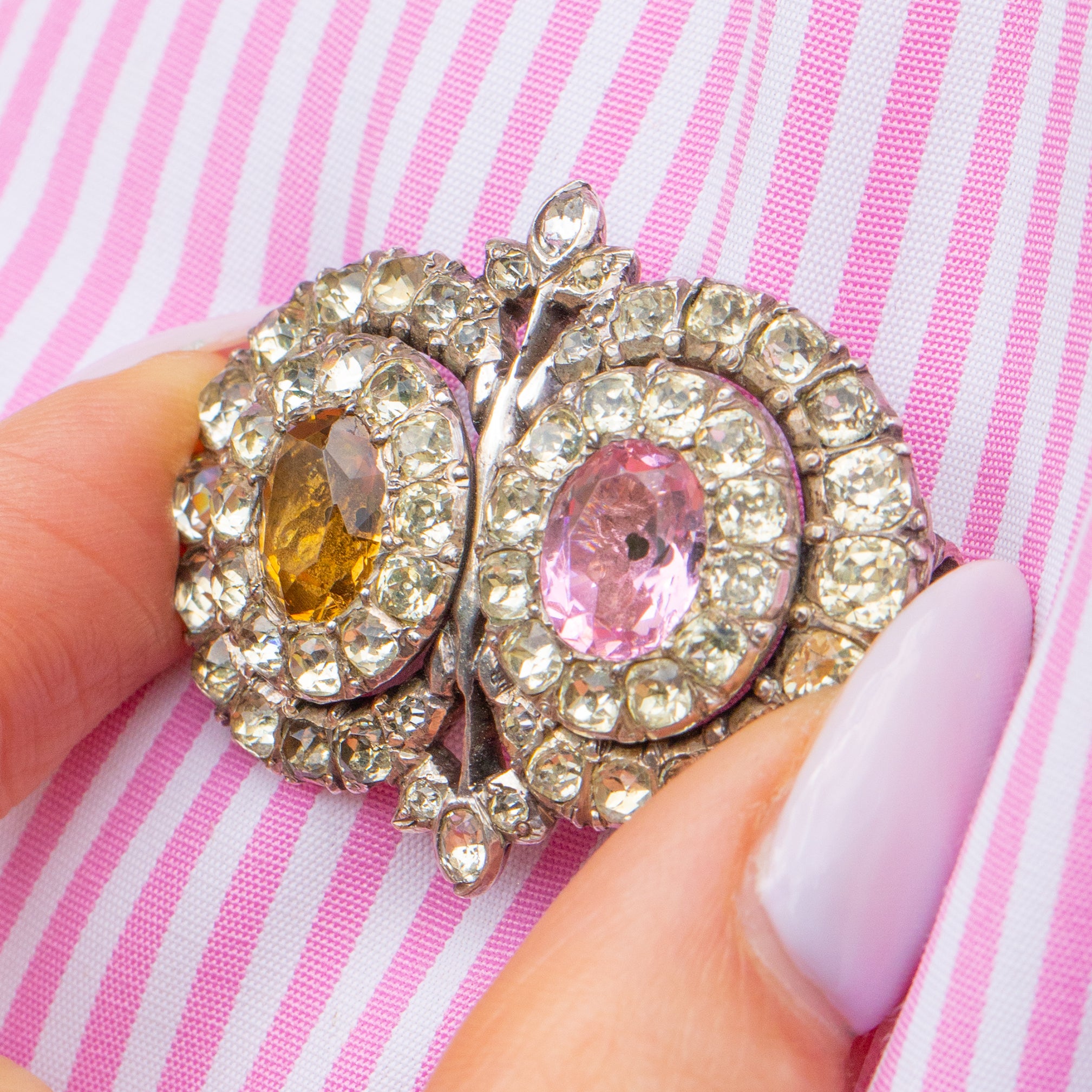 The superb piece of Georgian jewellery has been crafted from lustrous Sterling Silver to create comfortable dished settings for the Paste to rest in, which have notably crisp facets that glisten beneath the light! With a combination of white, pink, and maple Paste, she offers a myriad of bright sparkles. This Georgian brooch is ready to be worn and adored straight from the box!
