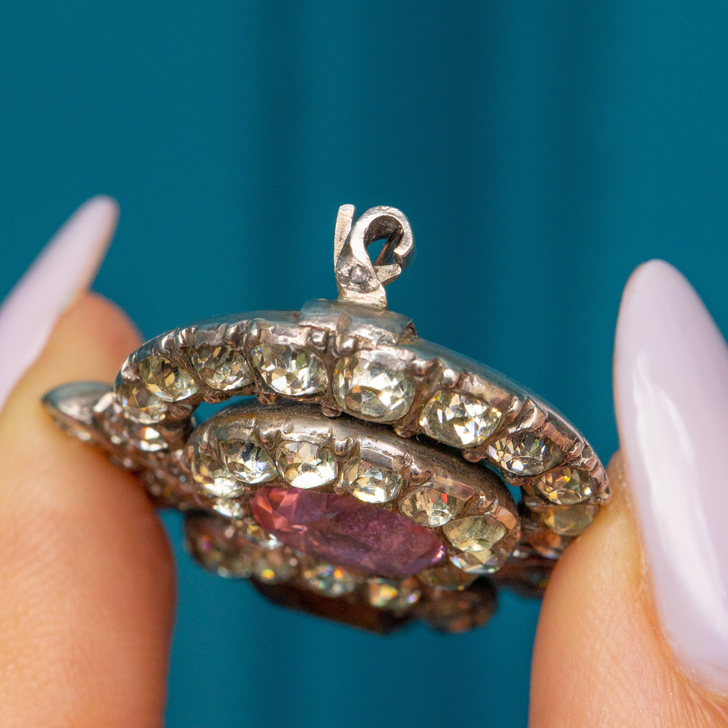 VERY GOOD. This Georgian Queen Anne pink Paste pendant is in very good condition. Ready to wear straight from the box, this beauty has soft domed backs with stunning Paste that are all securely set. This treasure does have some subtle wear on the back but once affixed to your jacket lapel this cannot be seen!
