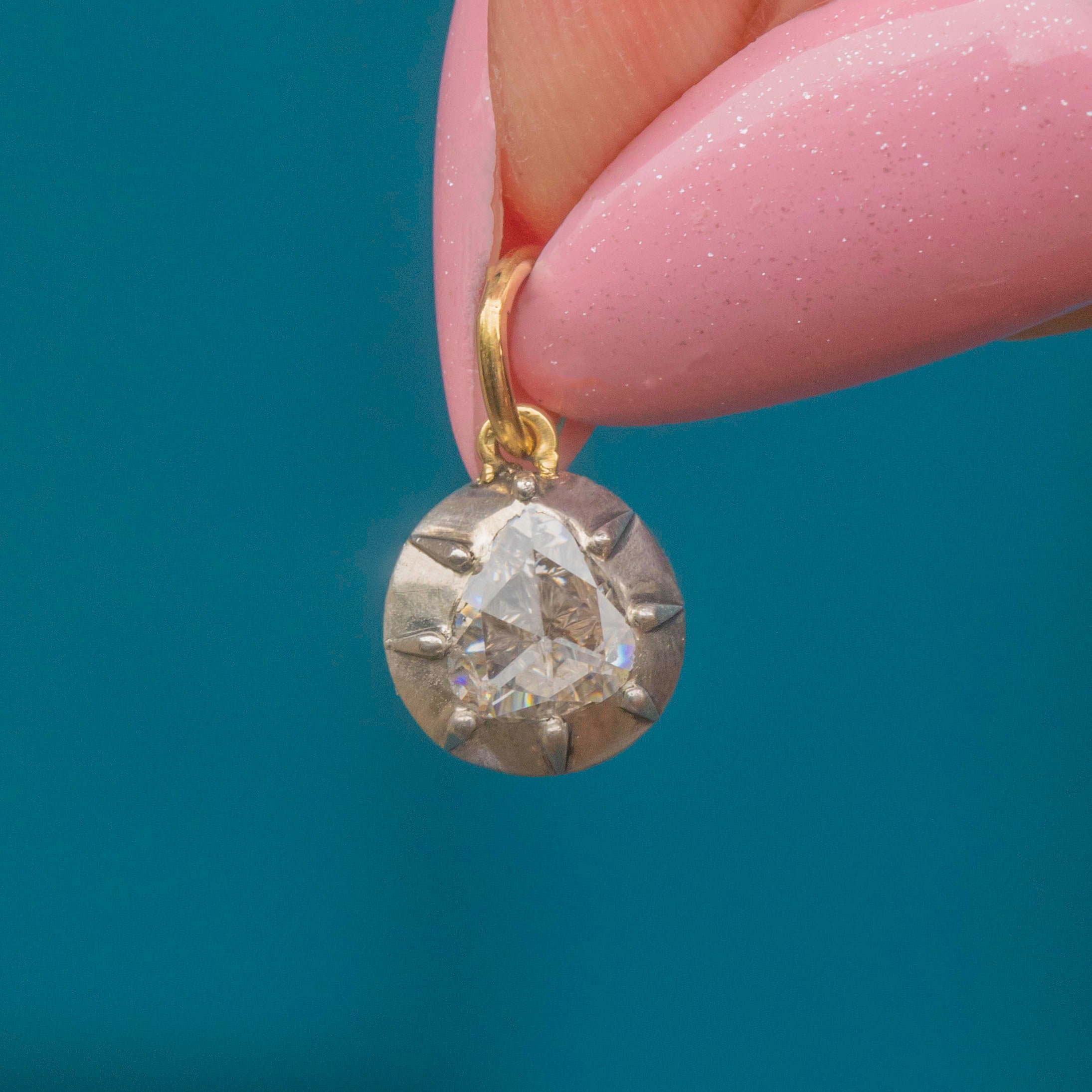 VERY GOOD: This Georgian rose-cut Diamond pendant is in very good condition. The Diamond is secure in its collet setting, sparkling beautifully with no chips or abrasions. There are some marks on the back of the pendant from where this piece has been converted from something bigger, but the back of the charm is smooth and comfortable to wear.