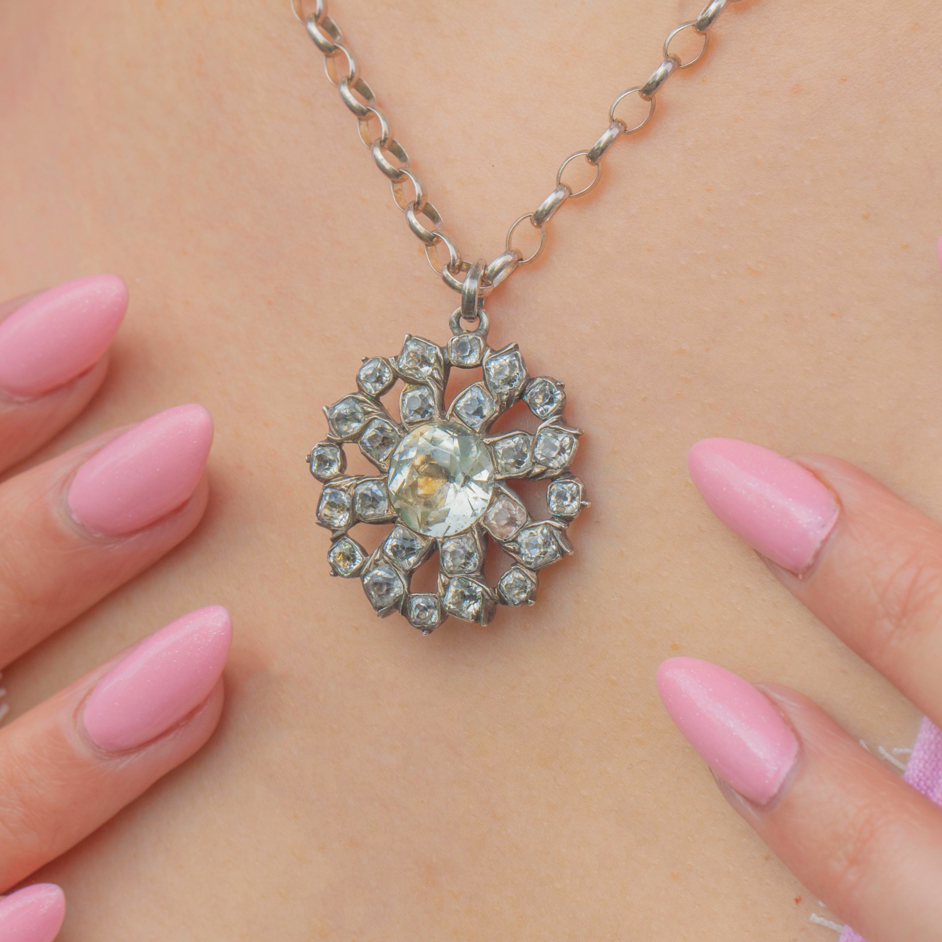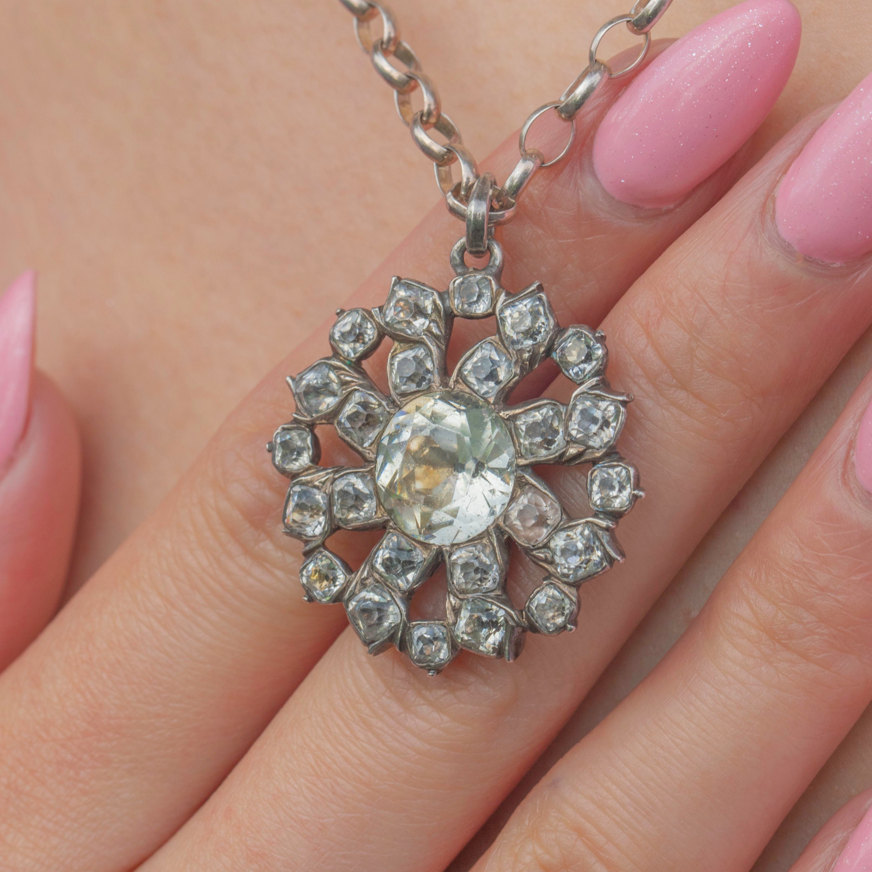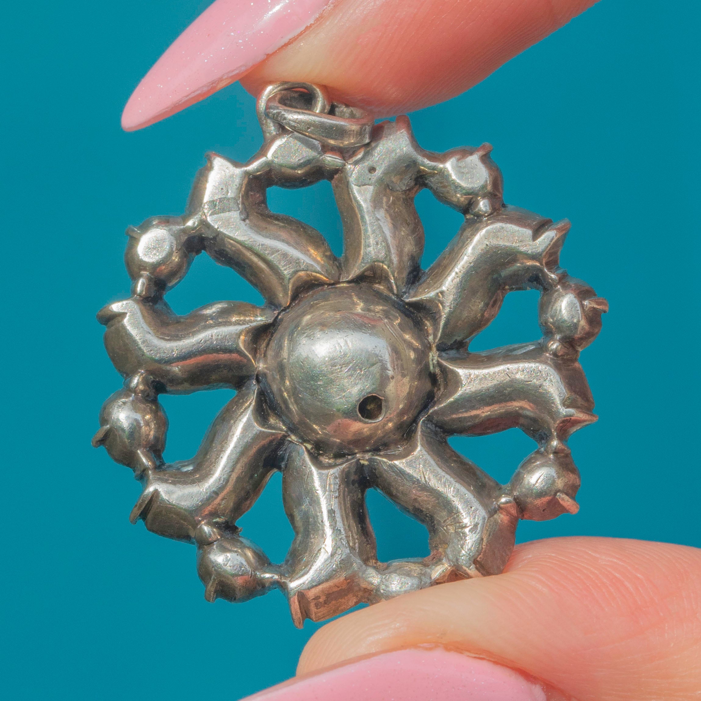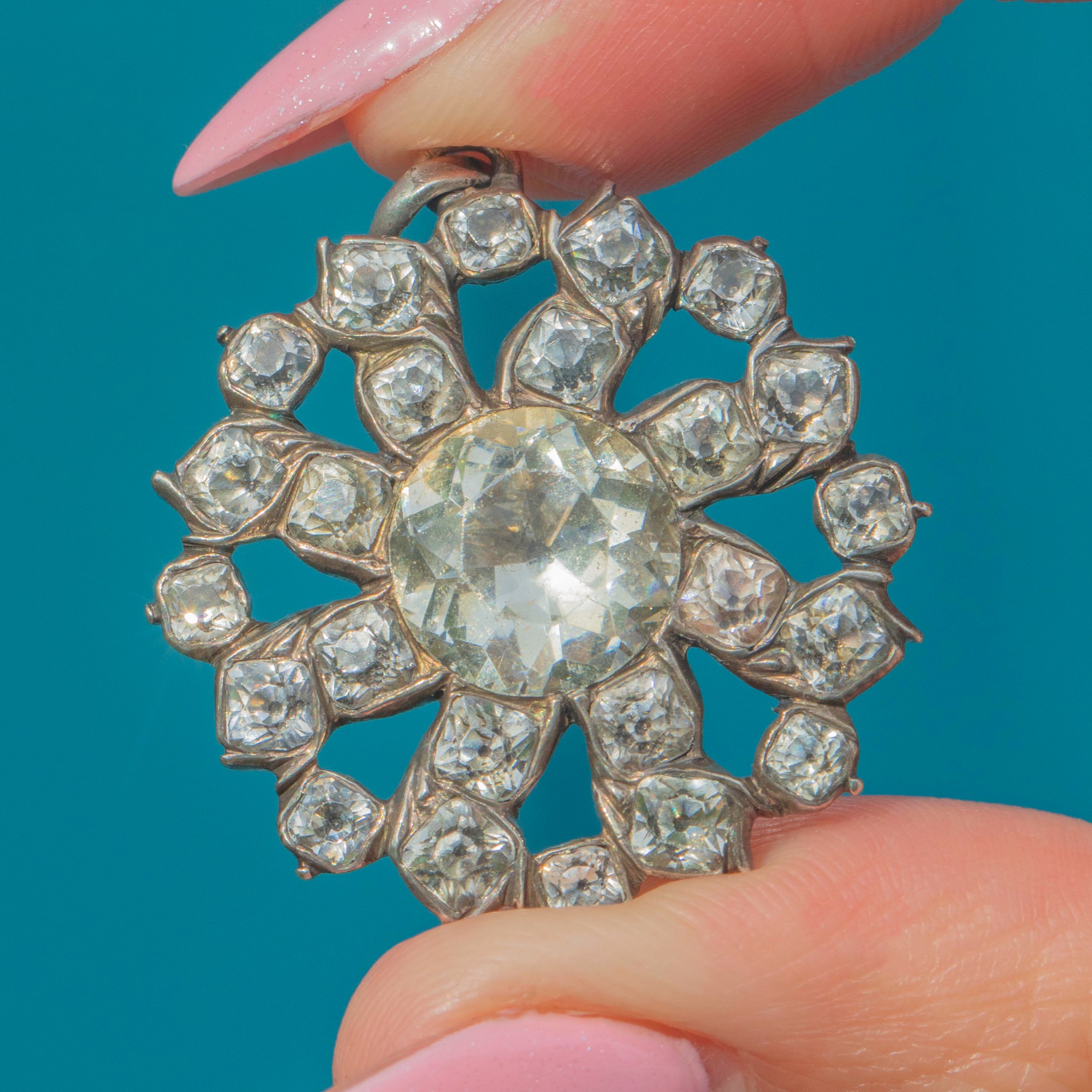 VERY GOOD: This Georgian Silver Black Dot Paste cluster pendant is in very good condition. The Paste have been wonderfully preserved, with their crisp facets and bright foils free from surface wear. The Silver shows some wear, commensurate with age, but this is mostly on the back so won't be visible while the pendant is worn. The Silver has accrued an admirable patina, adding to the pendant's antique charm. This piece is a true Georgian treasure and will make a standout addition to your collection!