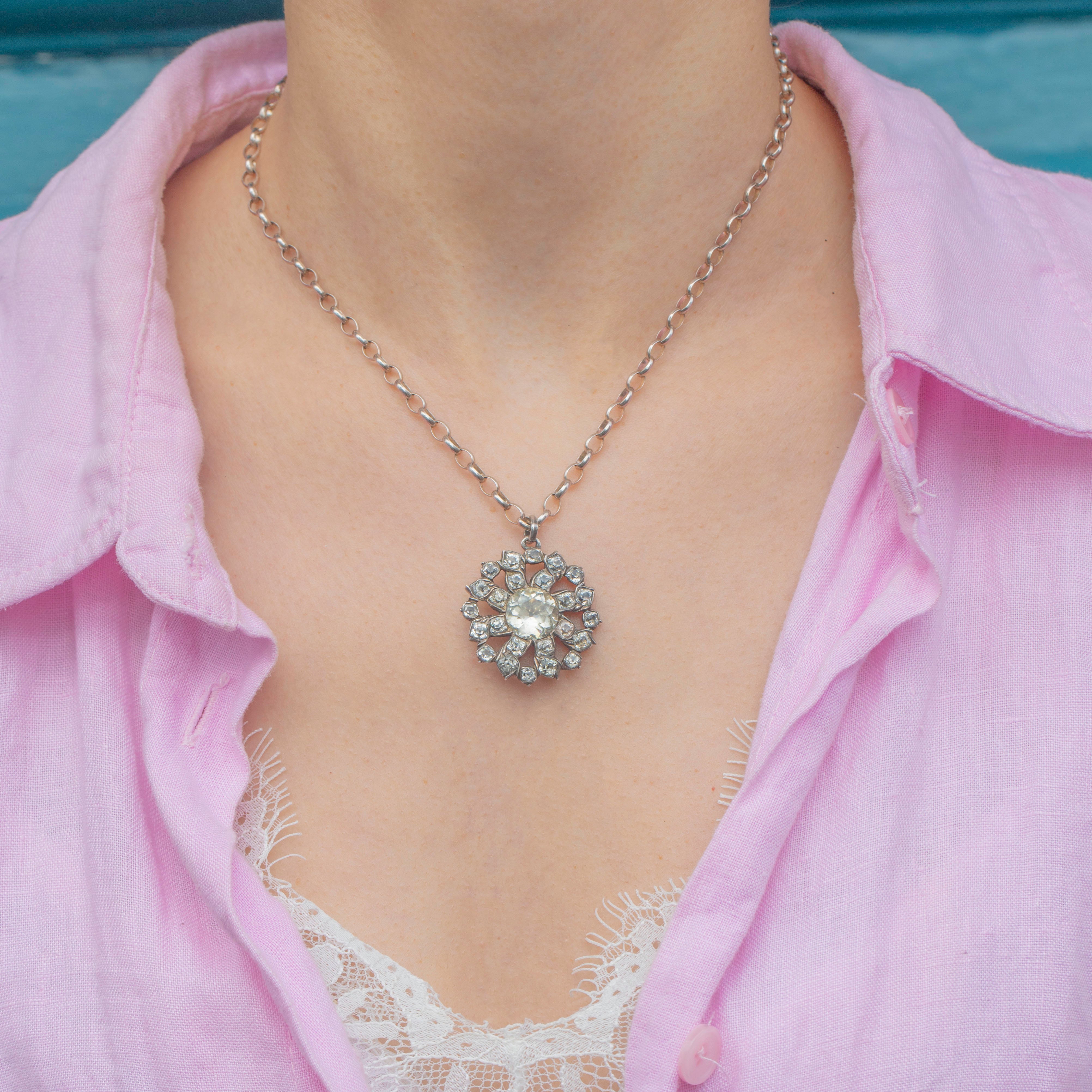 Add a glimmering accent to your décolletage with this striking Georgian Silver Black Dot Paste cluster pendant! Arranged into a unique celestial design, this Georgian pendant is inlaid with a generous selection of Diamond Paste, their brilliance enhanced by the moody patina accrued within their Silver settings.