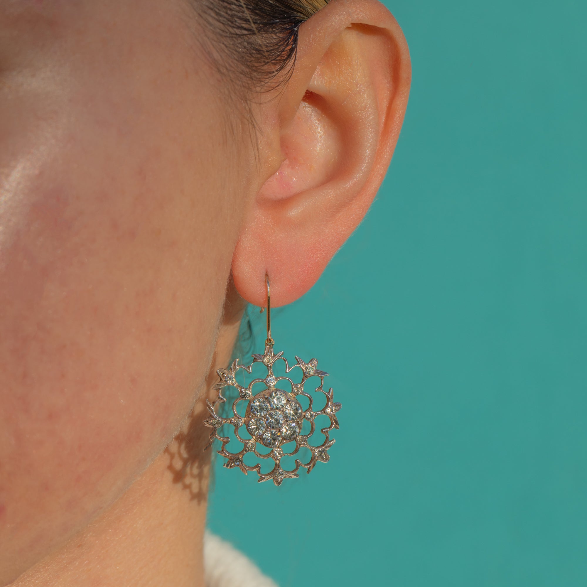 A captivating pair of Georgian Paste flower cluster earrings, crafted in Sterling Silver and finished with 9ct Gold French hooks. The lacy openwork rosettes shimmer with bright white Paste, arranged in a raised central cluster and a halo of petite accents to create a delicate, starburst sparkle.