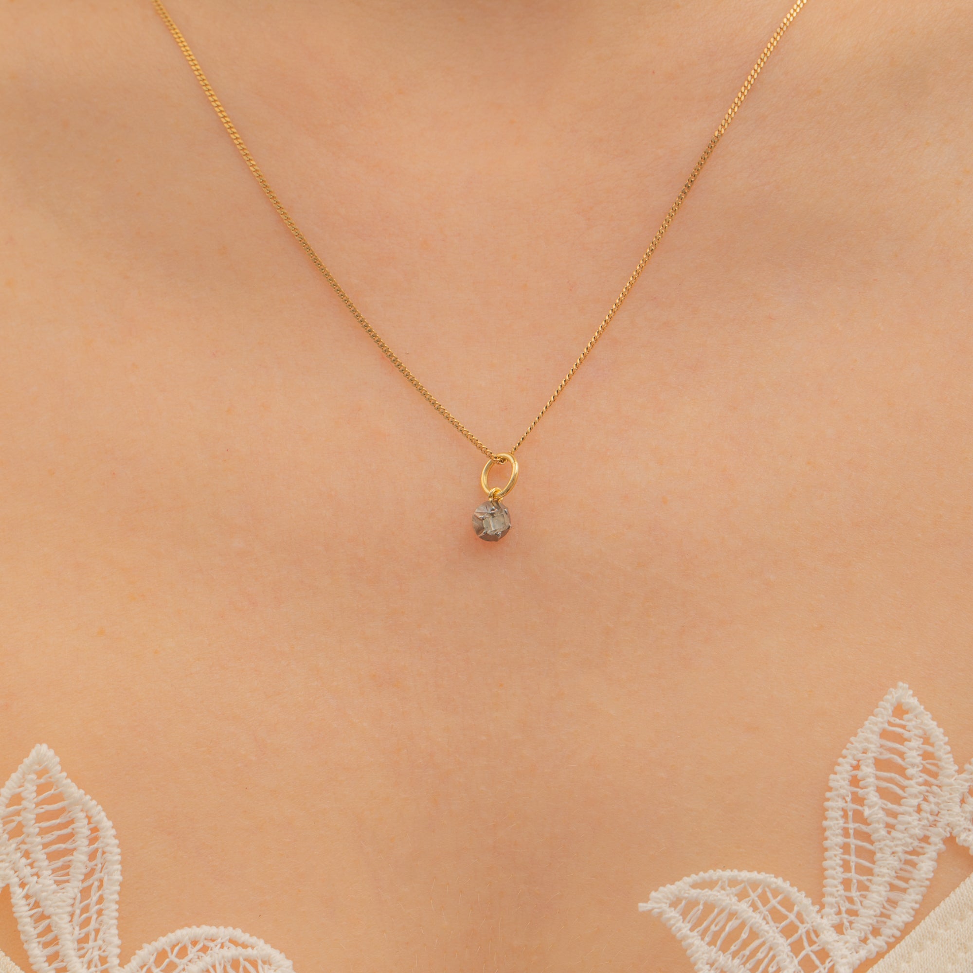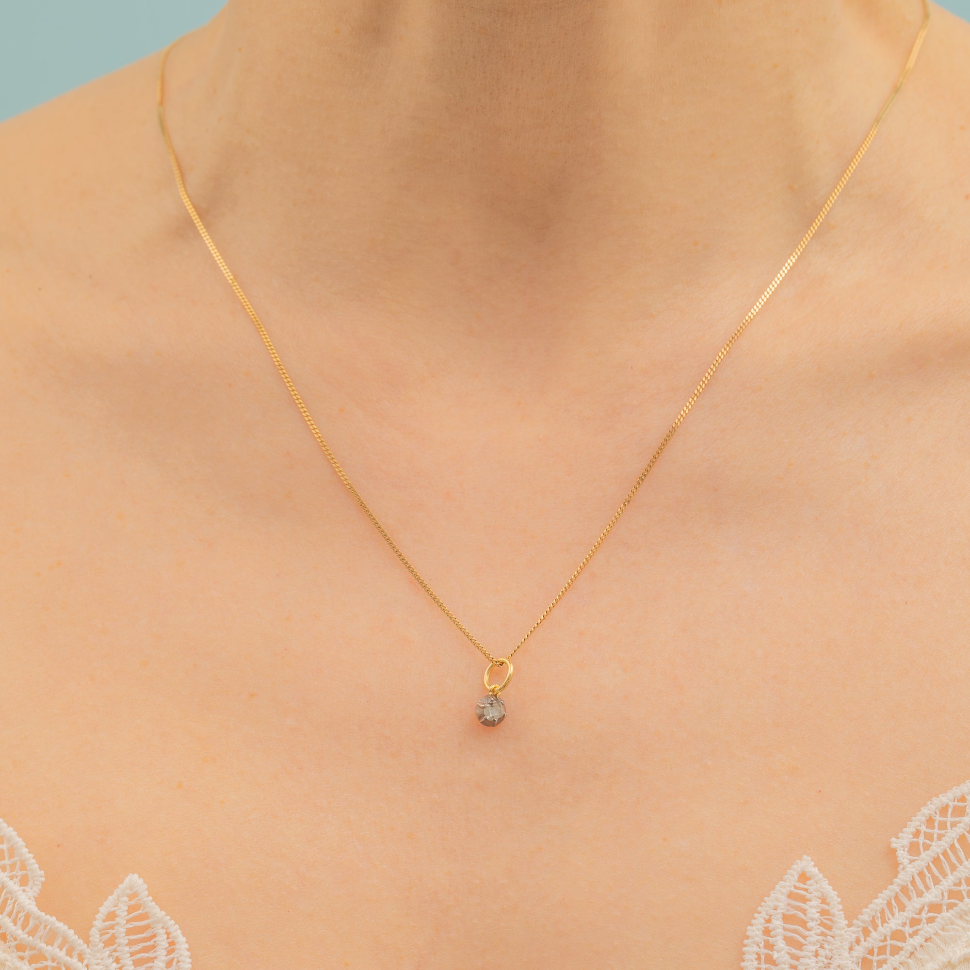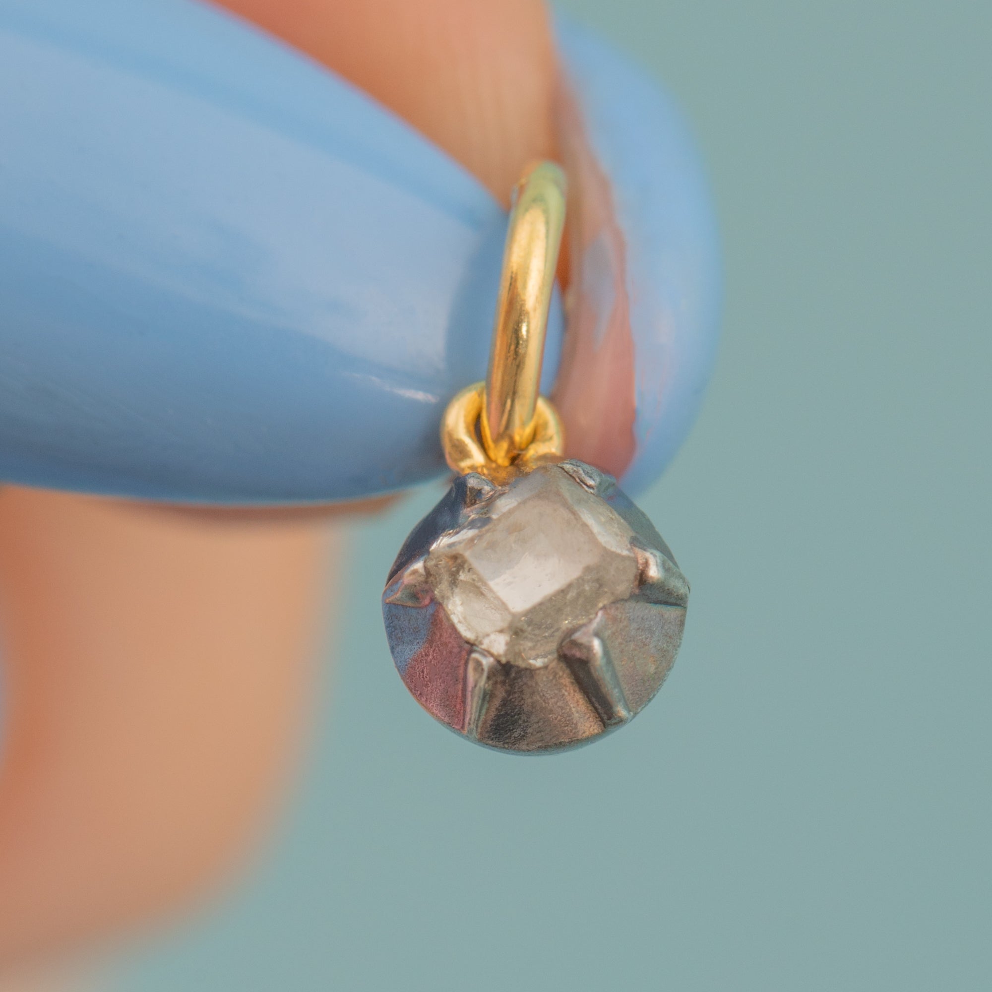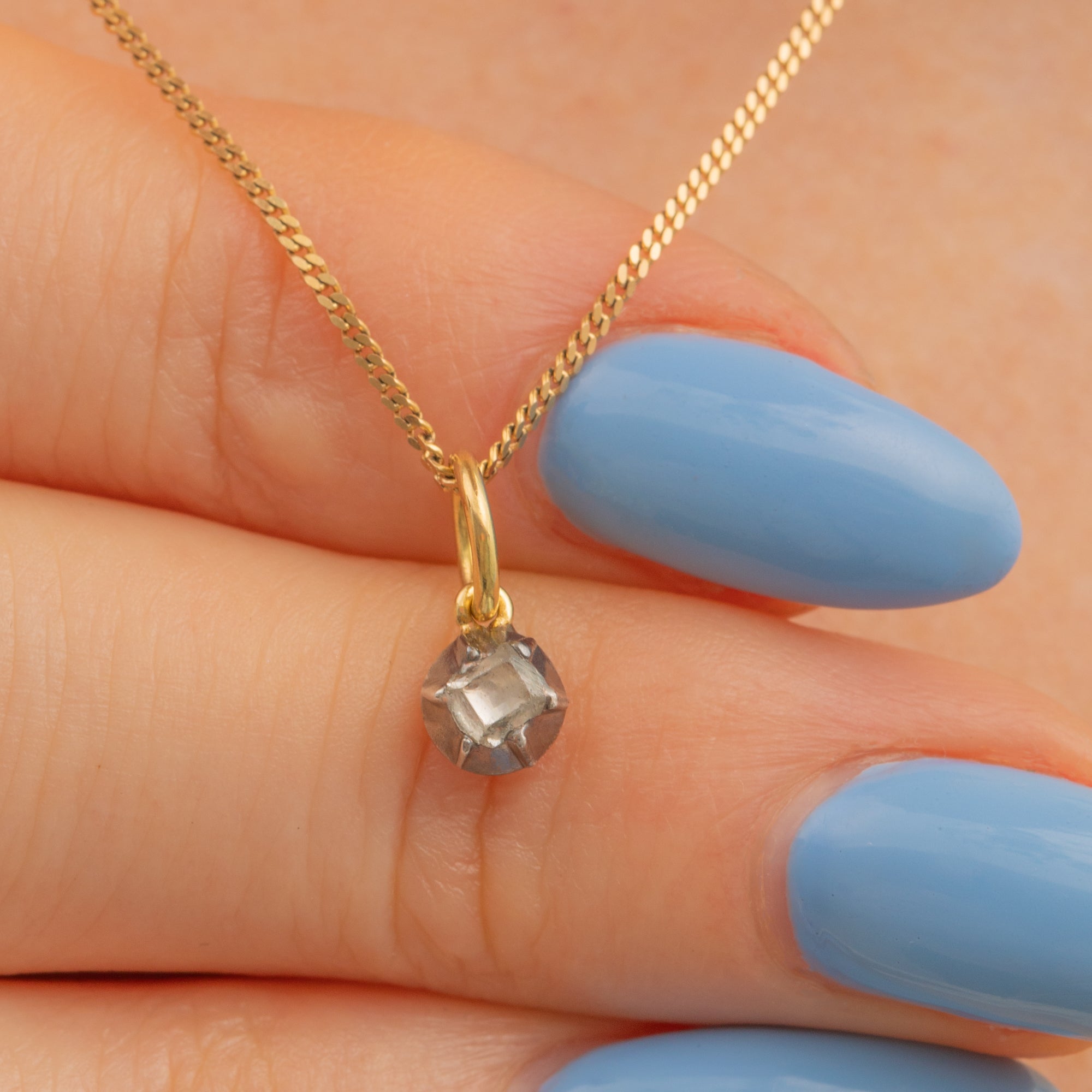 VERY GOOD. This Georgian table-cut Diamond charm is in very good condition. The table-cut Diamond showcases crisp facets and is securely held within her Silver setting. While the Diamond has some natural inclusions, they are subtle and do not diminish its charm or sparkle. There is also minor wear on the back of the silver setting, which is not visible when the pendant is worn and is in keeping with its considerable age. With a generously sized 18ct Gold jump ring, you can pair this Georgian Diamond charm with a chain of your choice with ease!