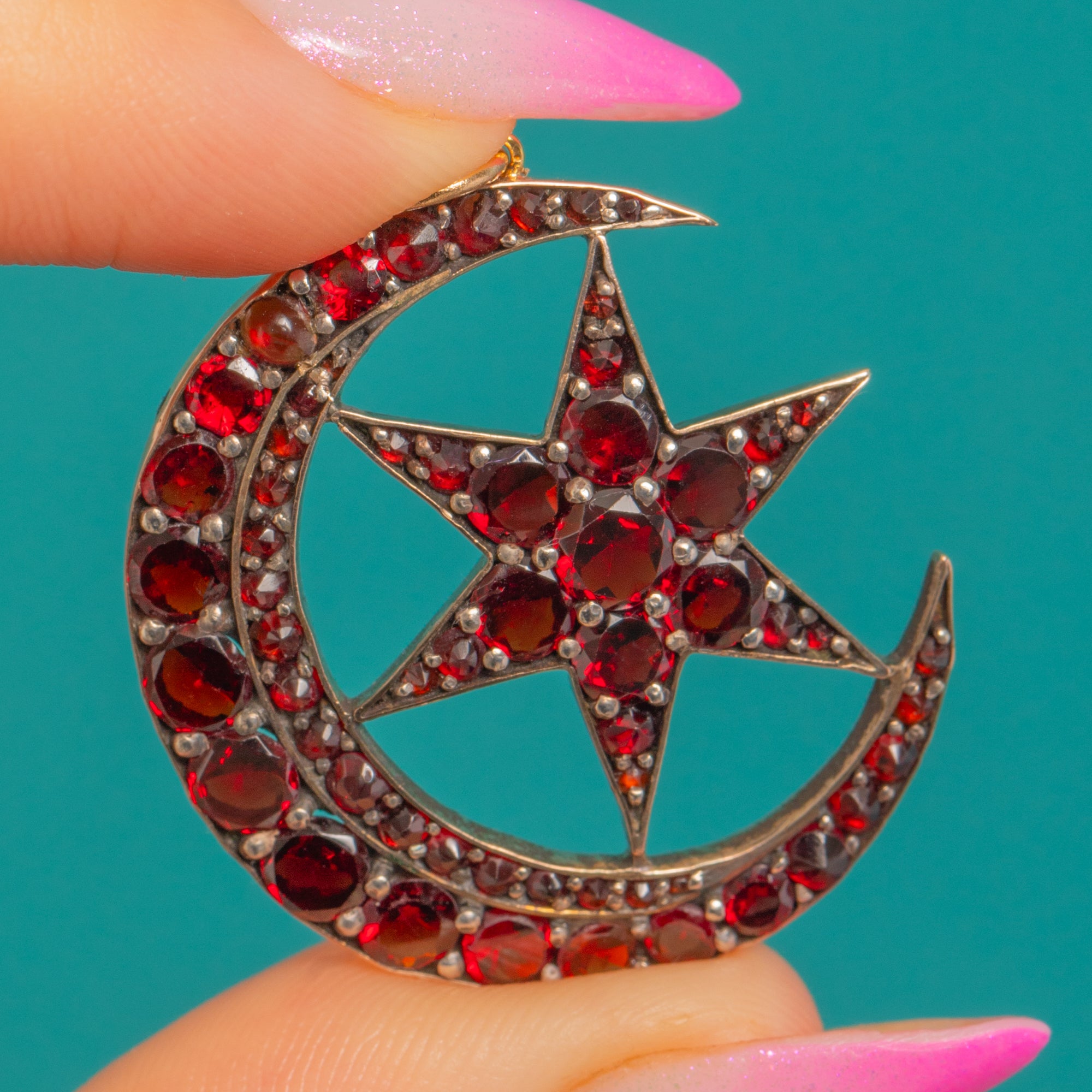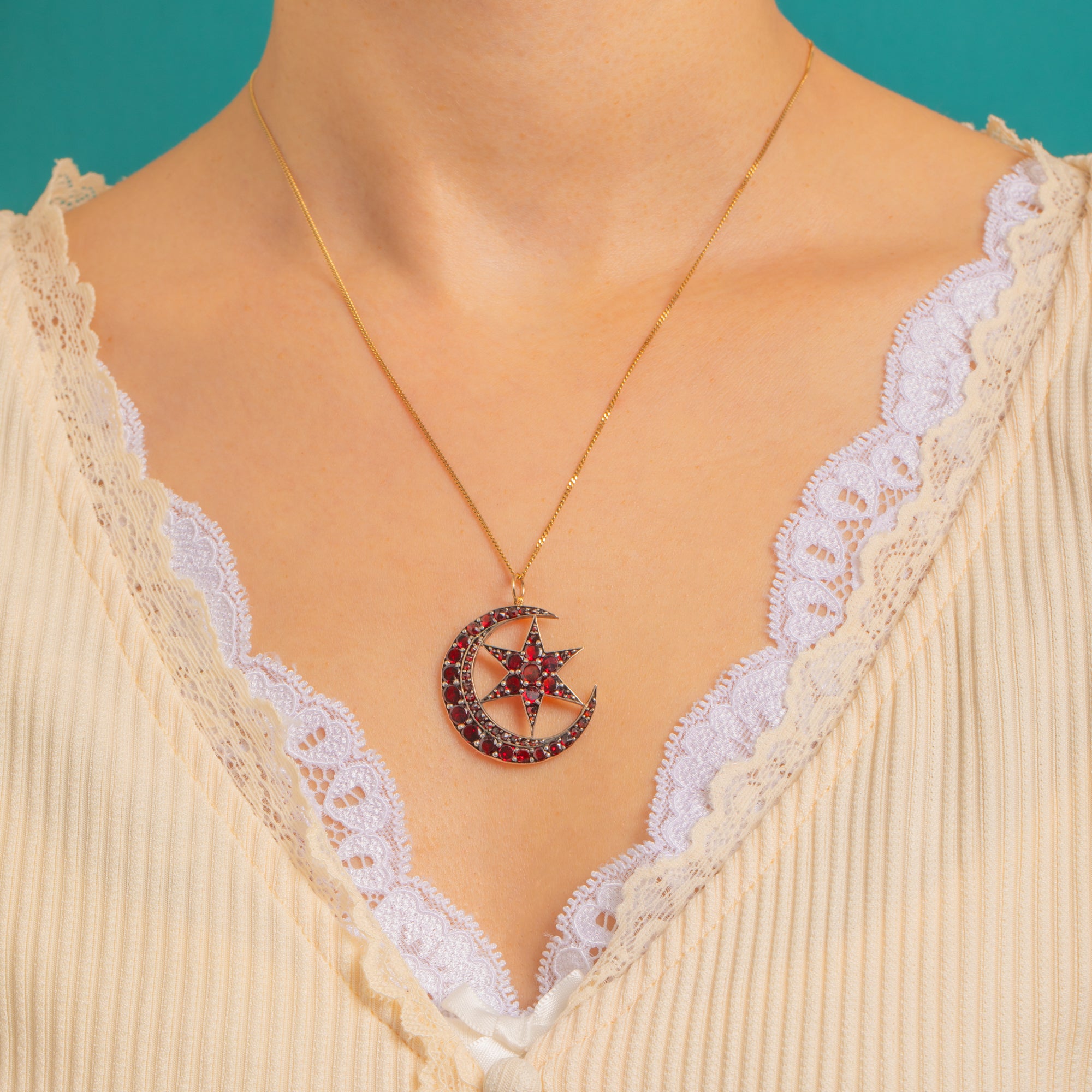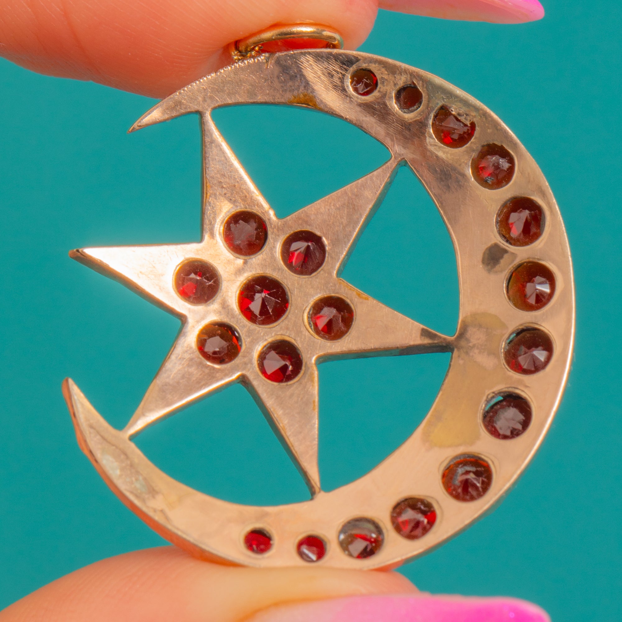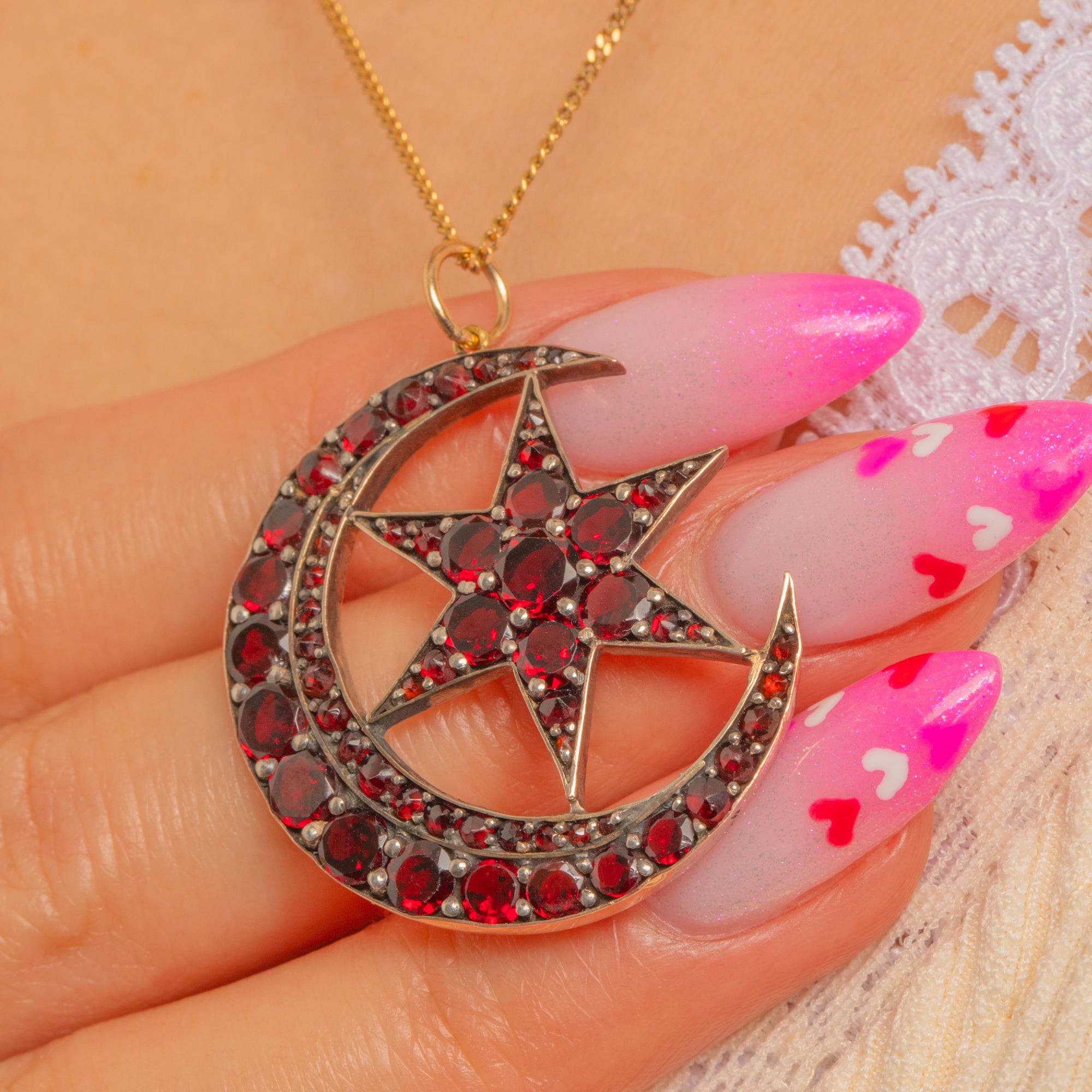 A romantic Victorian celestial pendant, this glossy crescent moon tenderly cradles a five-point star, all ablaze with deep wine-red Garnets. Each stone is neatly set in a beautifully executed openwork frame, creating a rich tapestry of sparkle and glow that feels both opulent and timeless.