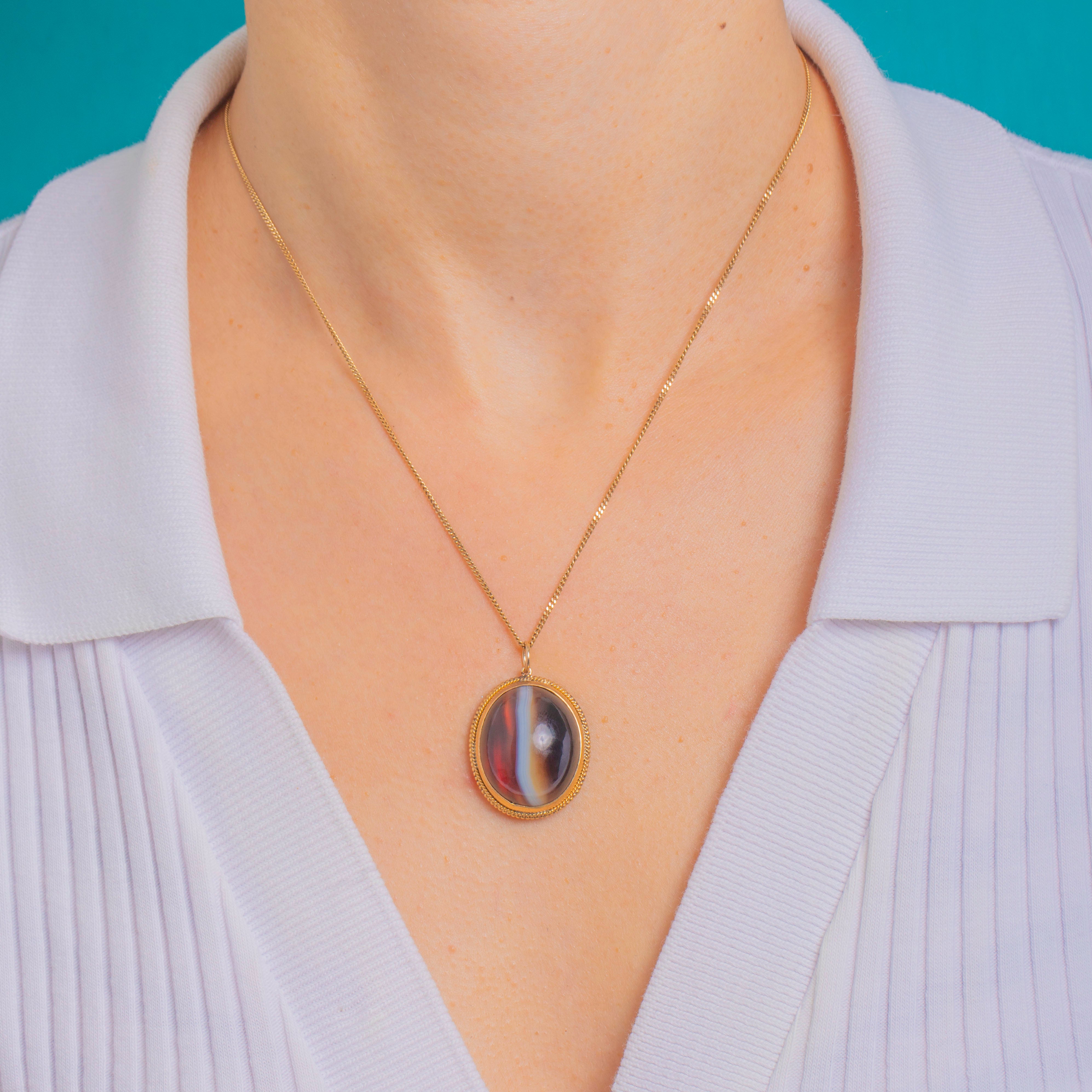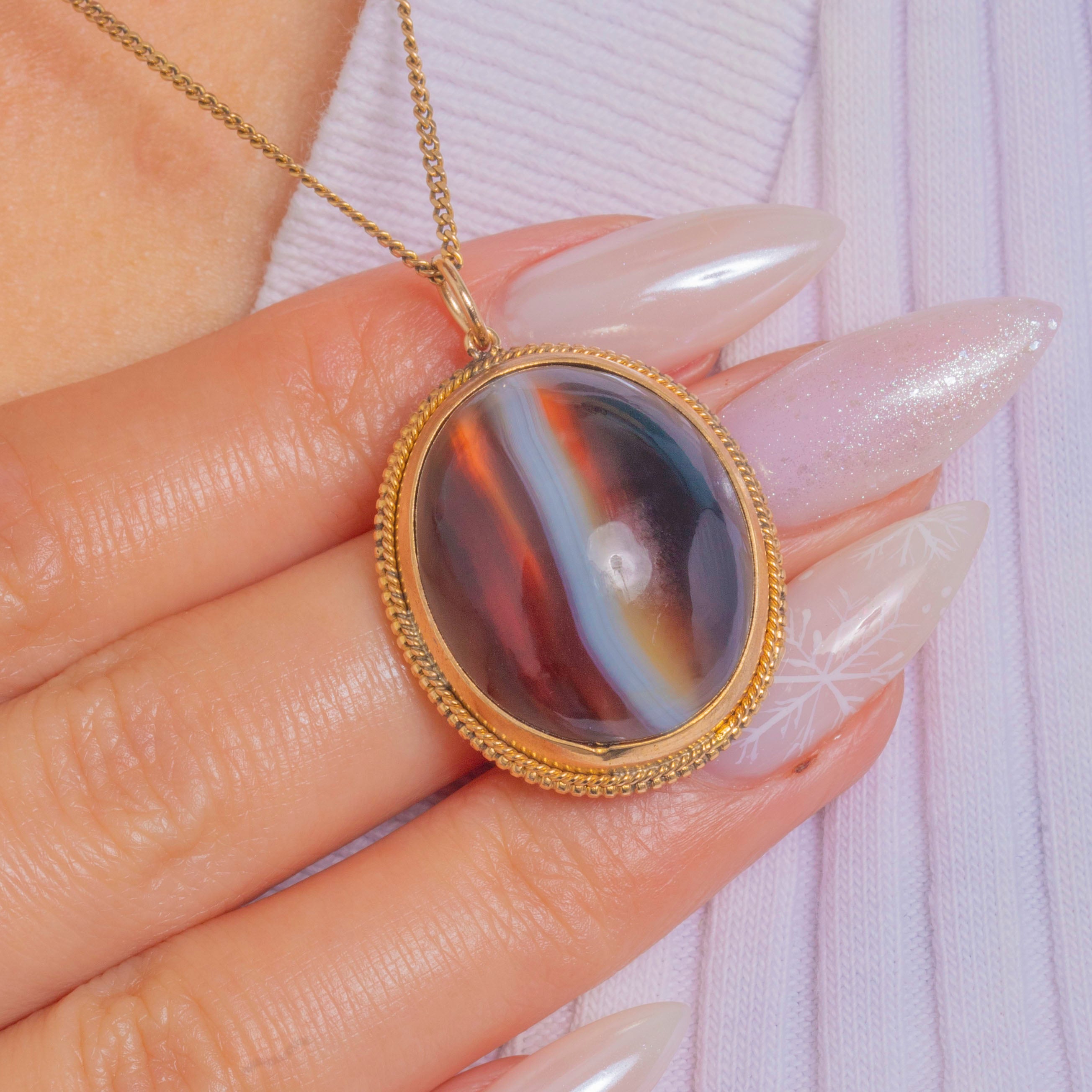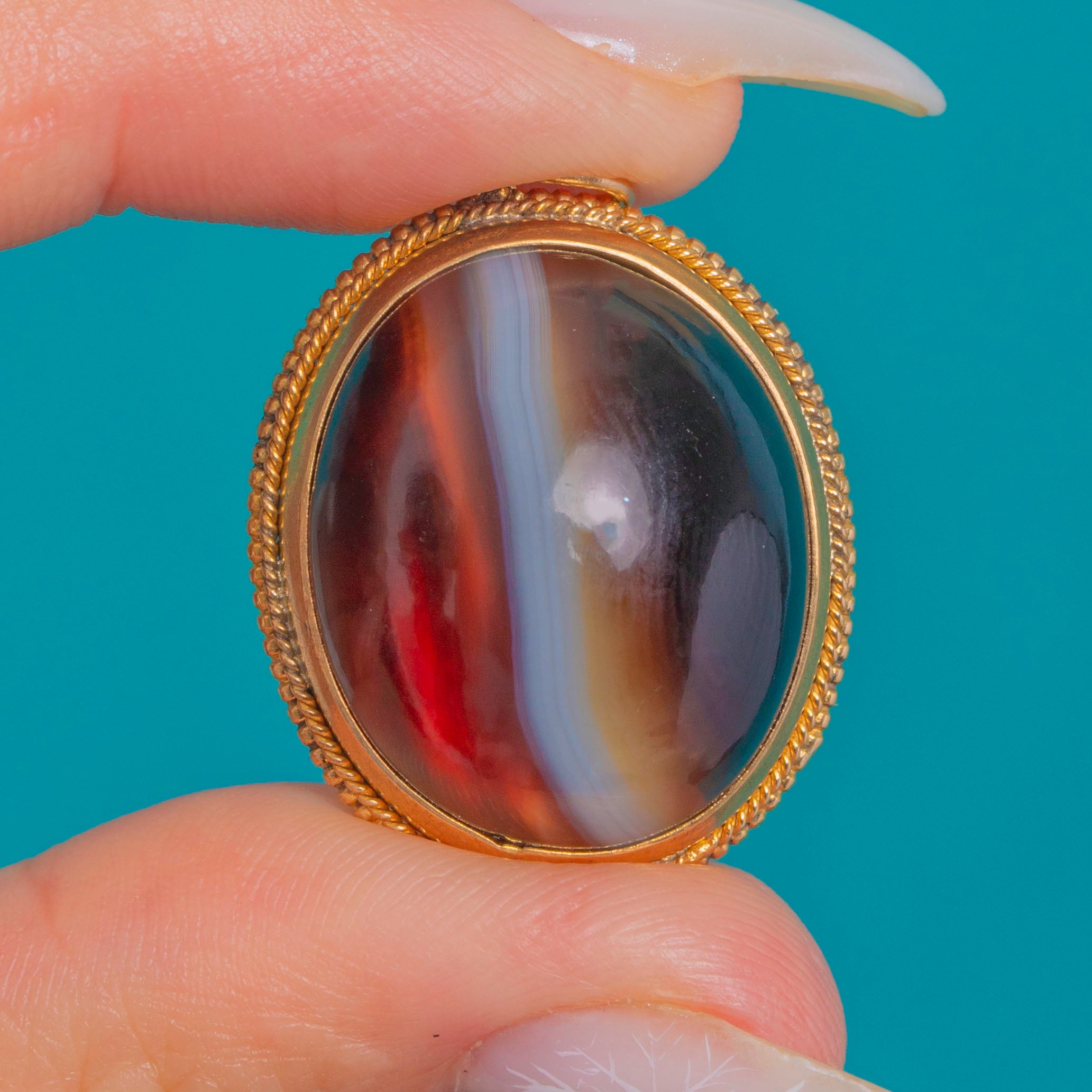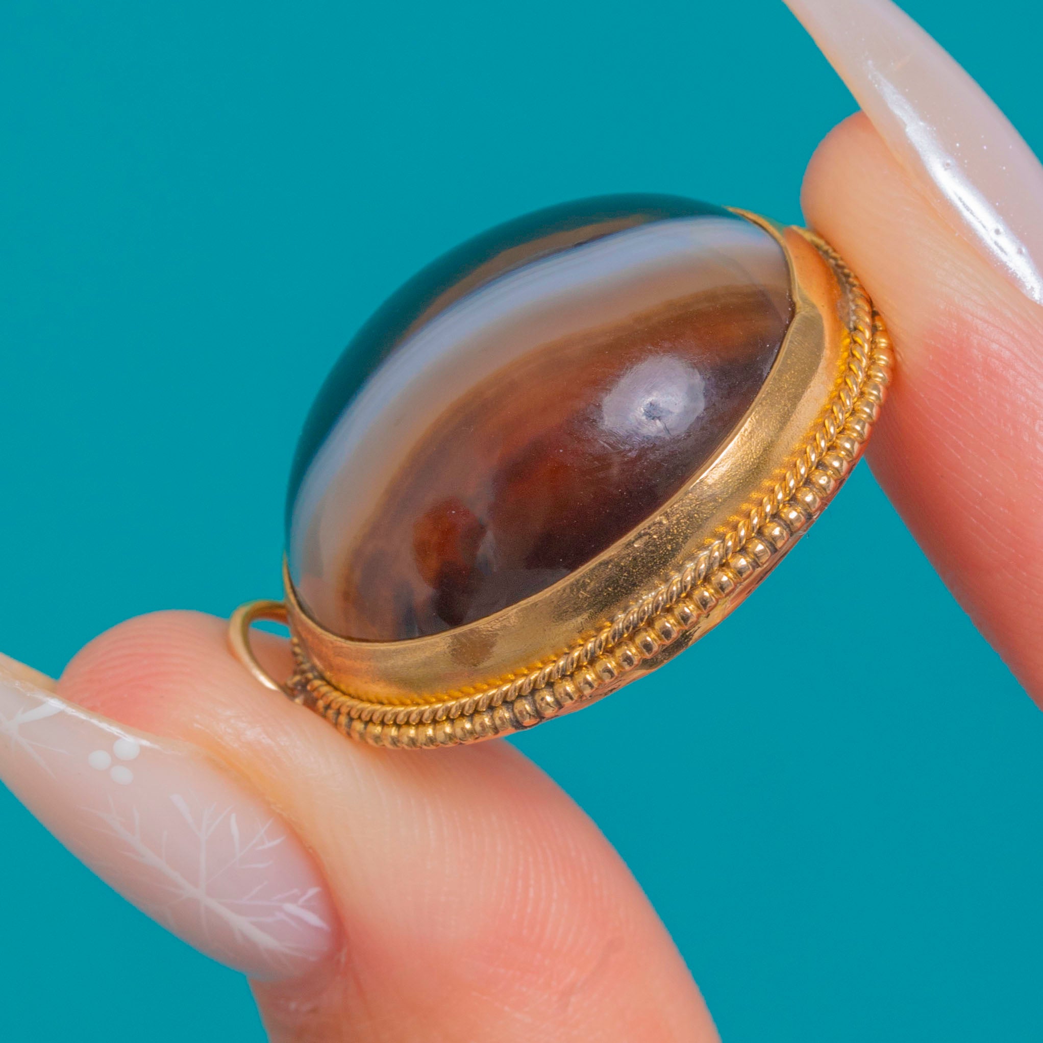 Glowing with earthy elegance, this Victorian banded Agate pendant showcases a superb, high-domed cabochon with striking natural stripes of deep reddish-brown, charcoal black, smoky blue-grey and creamy white. The gem is framed in a smooth closed-back bezel and encircled by a refined rope border that lends a subtle Etruscan-revival flourish.