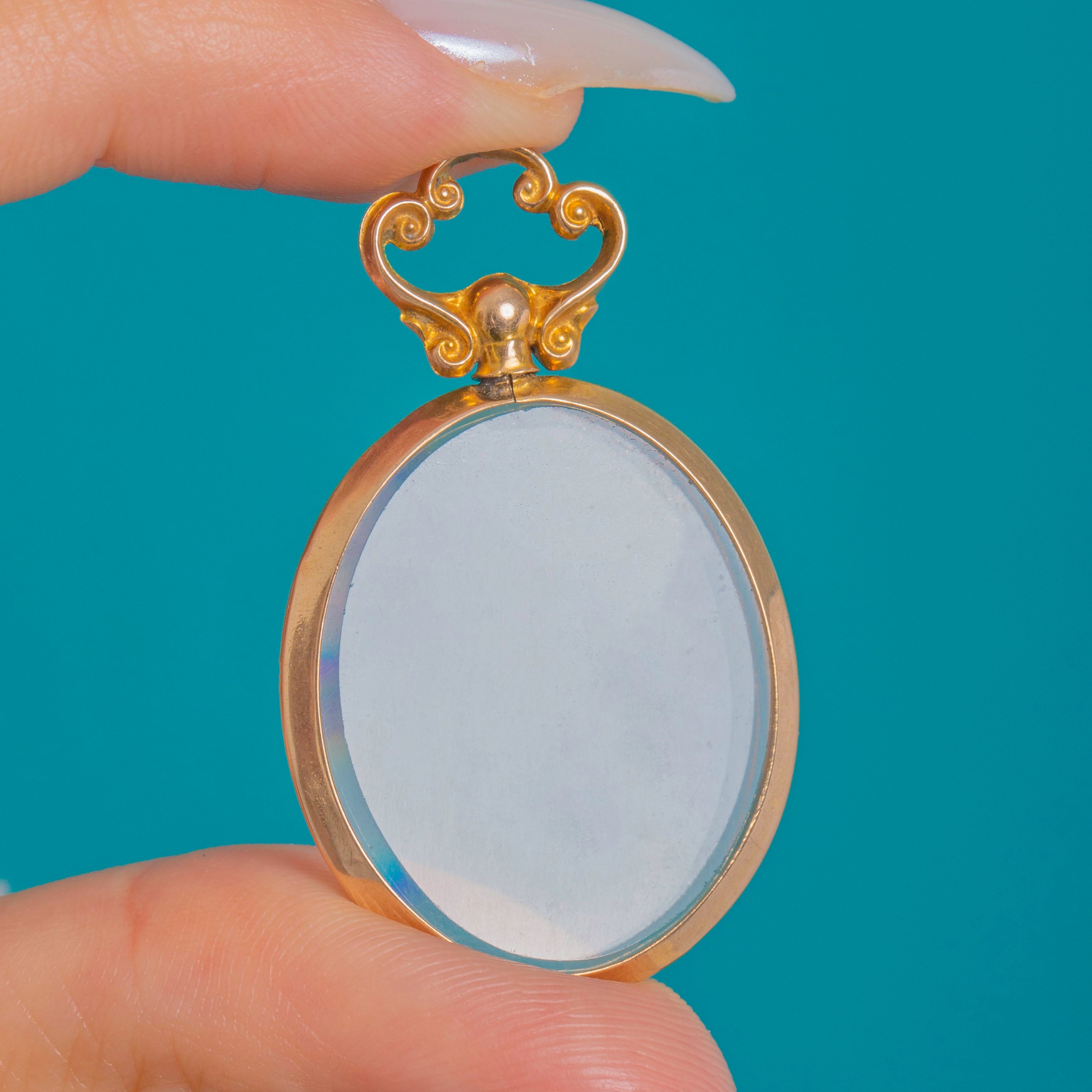 Elegantly minimalist with a flourish of ornament, this antique 9ct Gold oval portrait locket presents twin clear glass windows within a slim polished bezel, crowned by a delicate scrolled surmount. The integrated bail is joined by a neat knuckle, creating a graceful silhouette that feels both classic and refined.