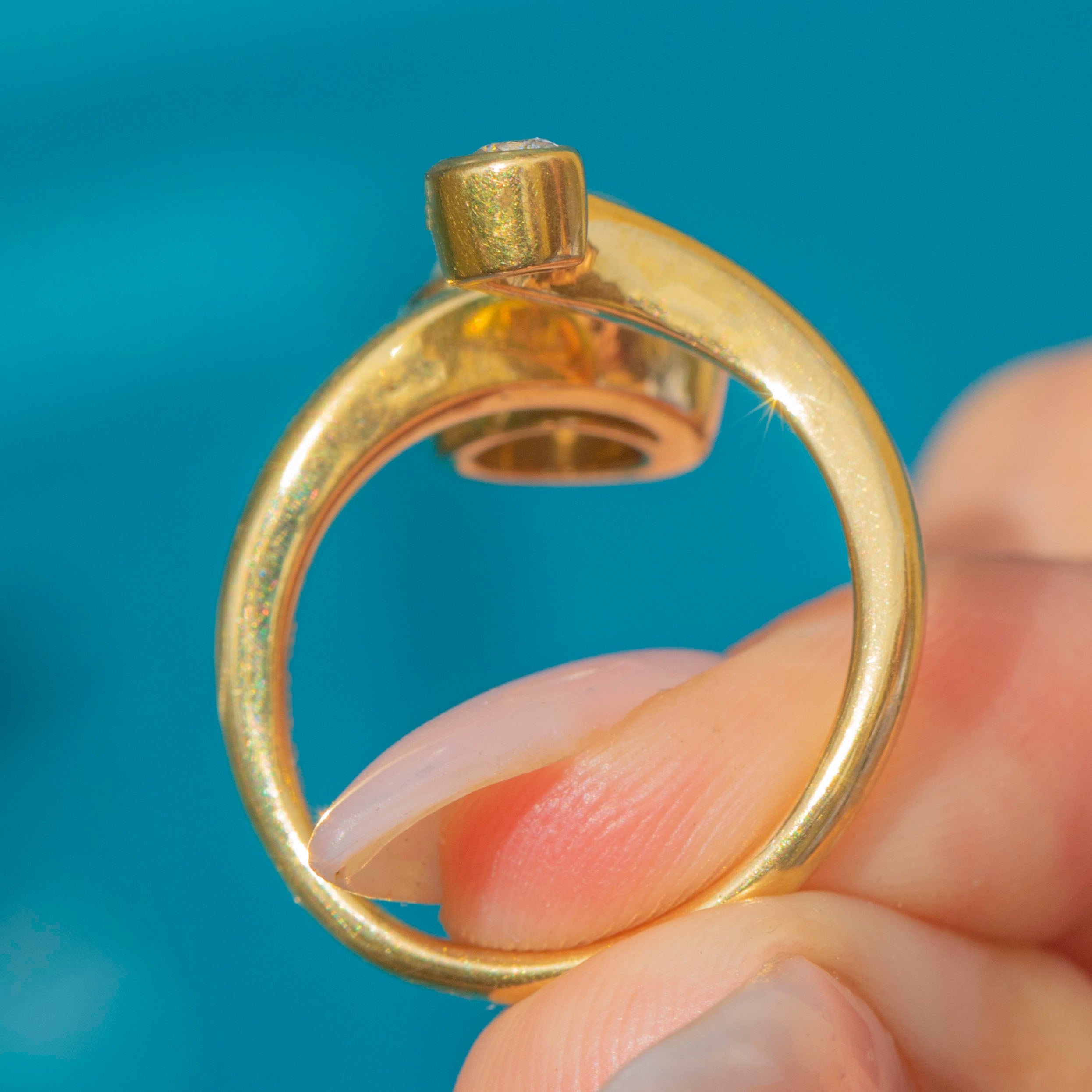 Opposite sits a crisp round brilliant cut Diamond, neatly bezel set into the Gold. The sculptural swirl design wraps fluidly around the finger, with a weighty feel at 9g. A modern and stylish statement piece.