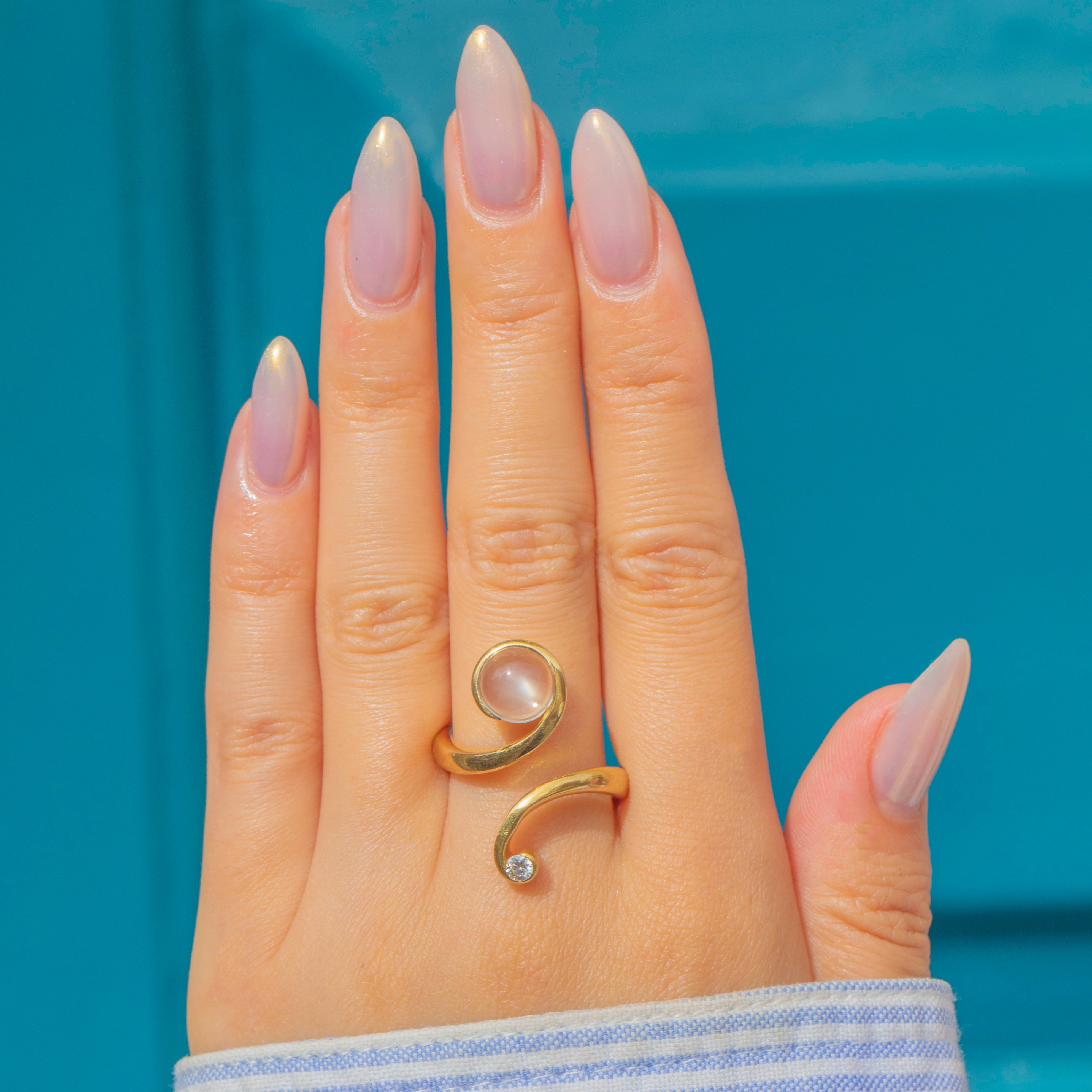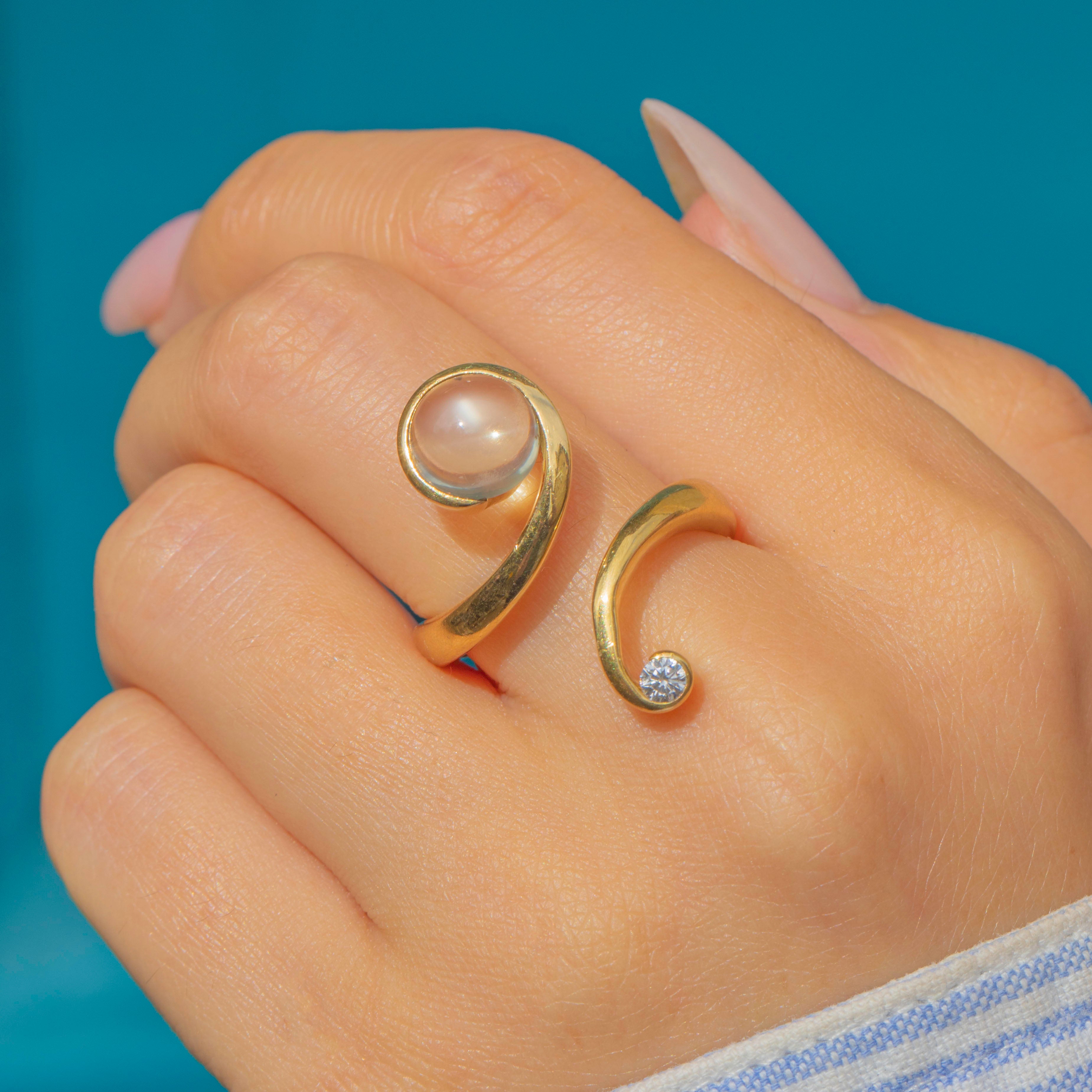This bold contemporary “swirl” ring is crafted in solid 18ct Gold, set with a luminous high-dome Moonstone and a sparkling Diamond accent. The Moonstone displays a silvery-blue schiller that glows beautifully as the stone moves in the light.