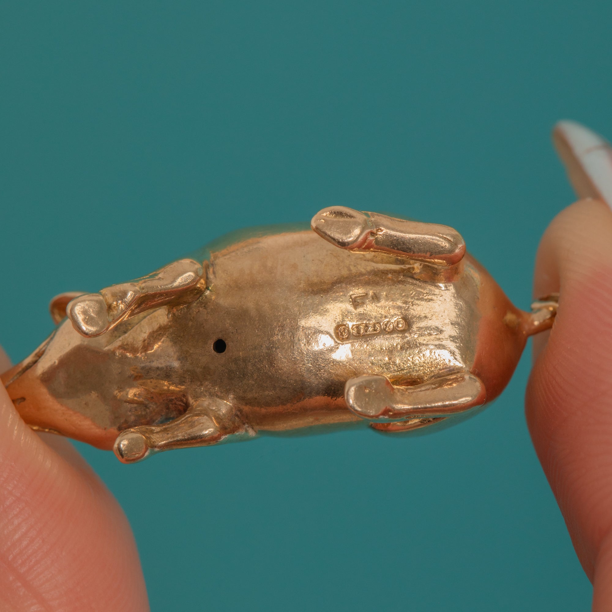Dated by its English hallmarks to London, 1870, it encapsulates the whimsy and craftsmanship of the era in a sleek, sculptural form. The pendant is suspended from a fixed hasp with an added jump ring, ready to add a touch of playful luxury to your favourite chain.