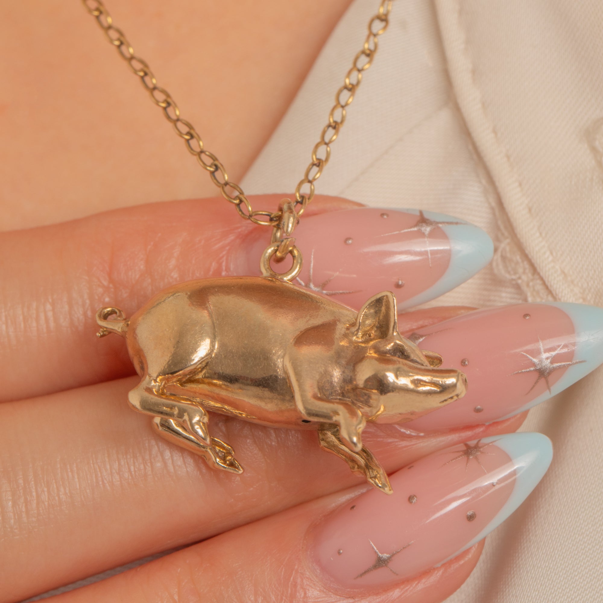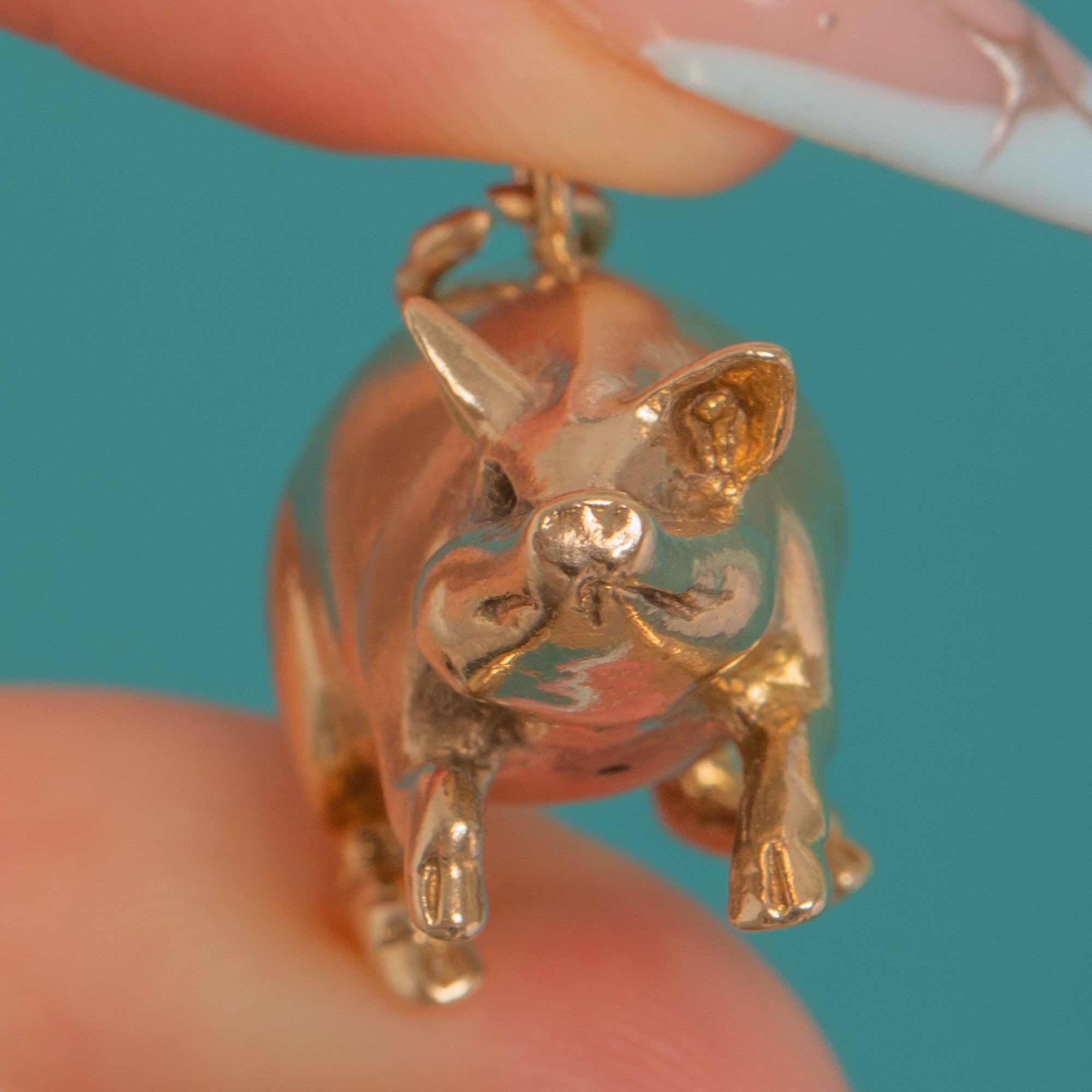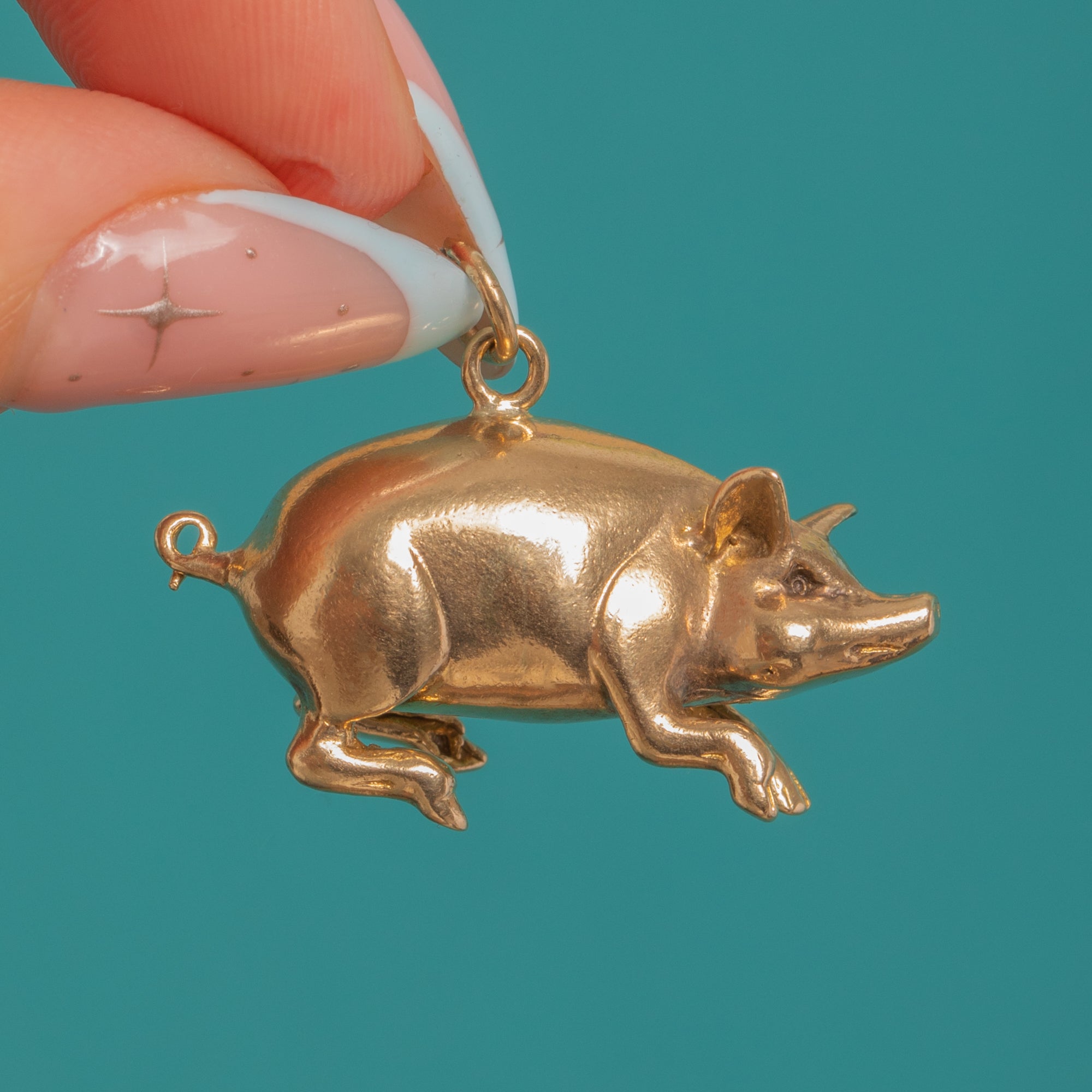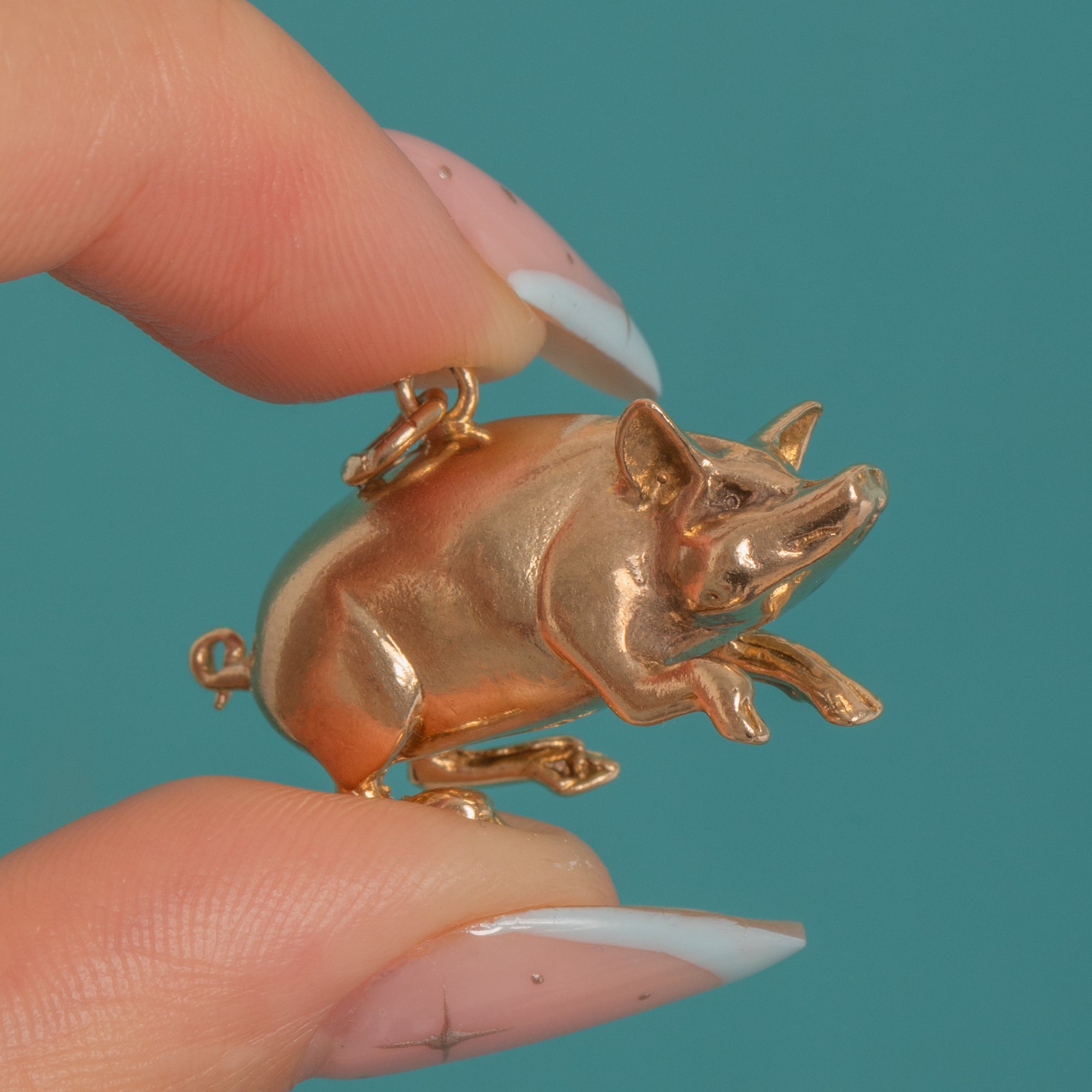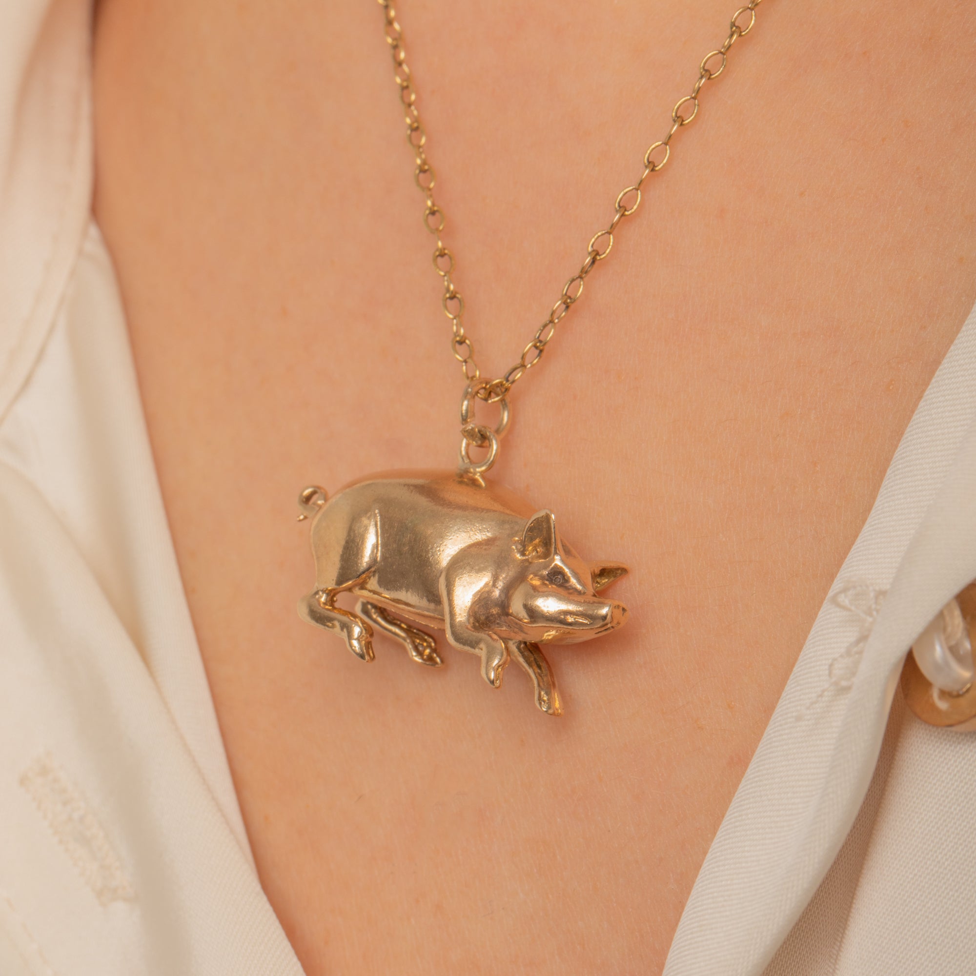 Charming and wonderfully characterful, this Victorian lucky pig pendant is crafted in solid 9ct Gold and modelled fully in the round. Its naturalistic details—snout, upright ears, neat legs and a tightly curled tail—are rendered with a smooth, high-polish finish that catches the light beautifully.