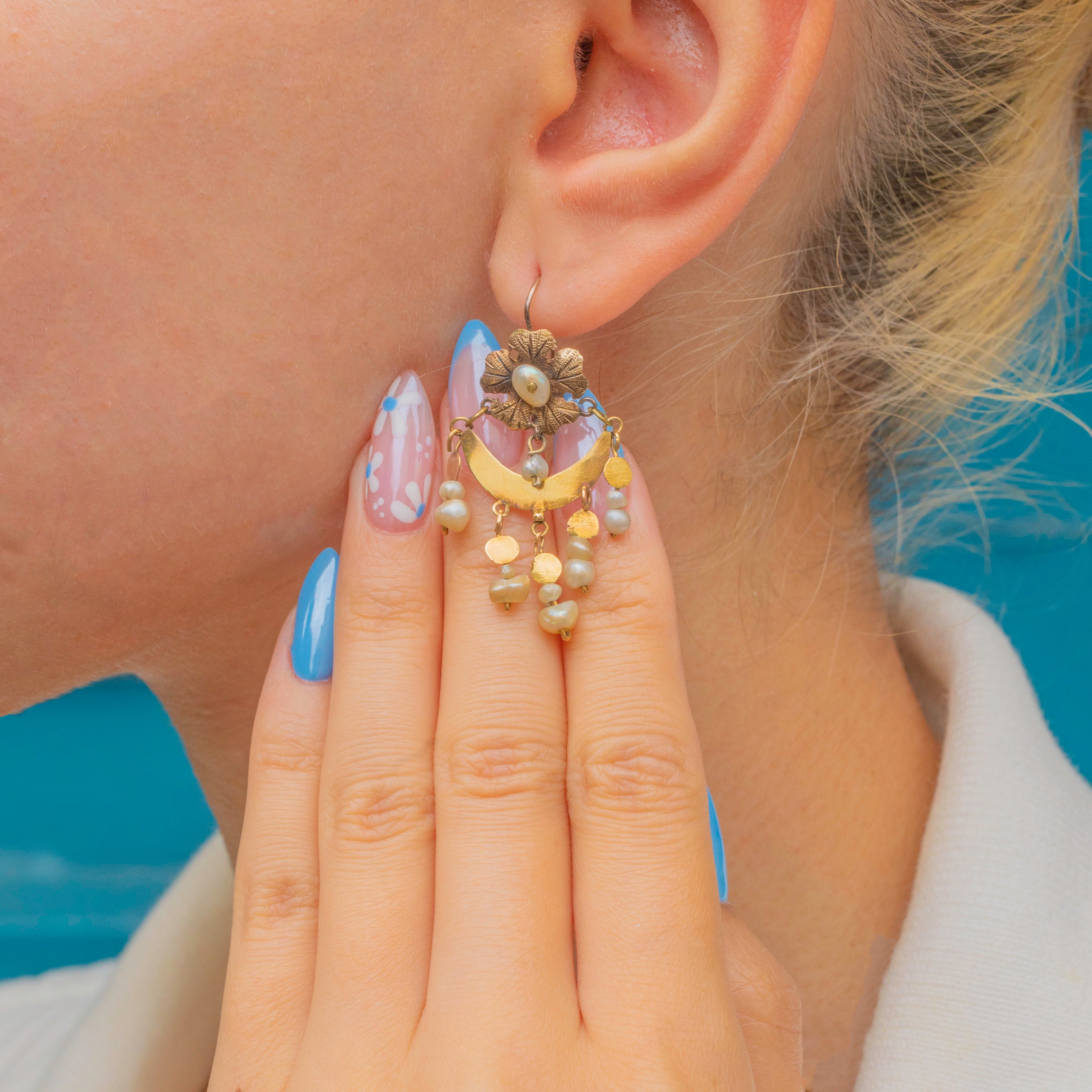 Iberian 9ct Gold Baroque Pearl Floral Chandelier Drop Earrings