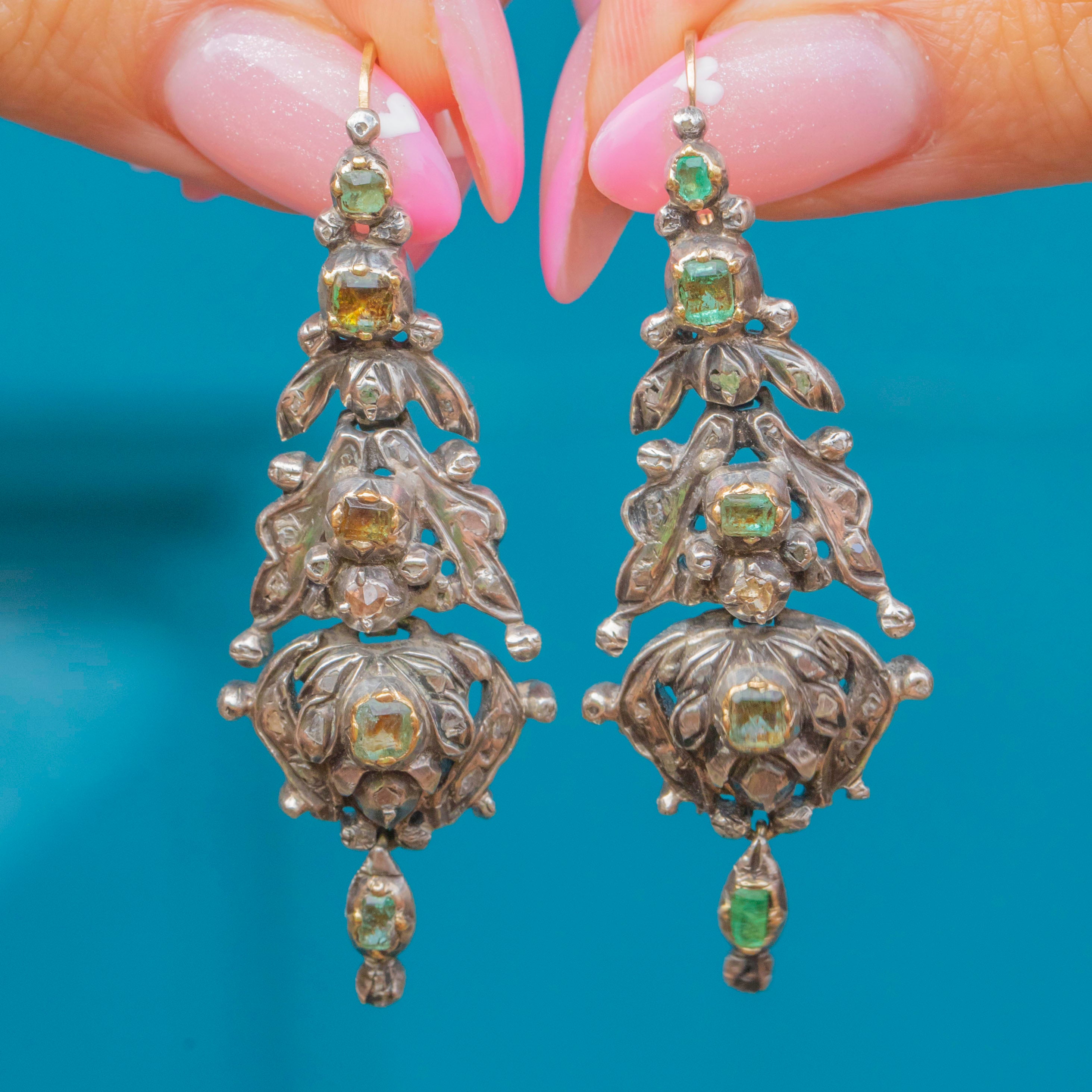 These exceptional Georgian Iberian earrings are an extraordinary survival from the 18th century, beautifully showcasing the region’s distinctive jewellery style. Crafted in Silver backed in 9ct Gold, they feature a dazzling arrangement of natural Emeralds and old-cut Diamonds, each stone individually set to create movement and sparkle when worn.
