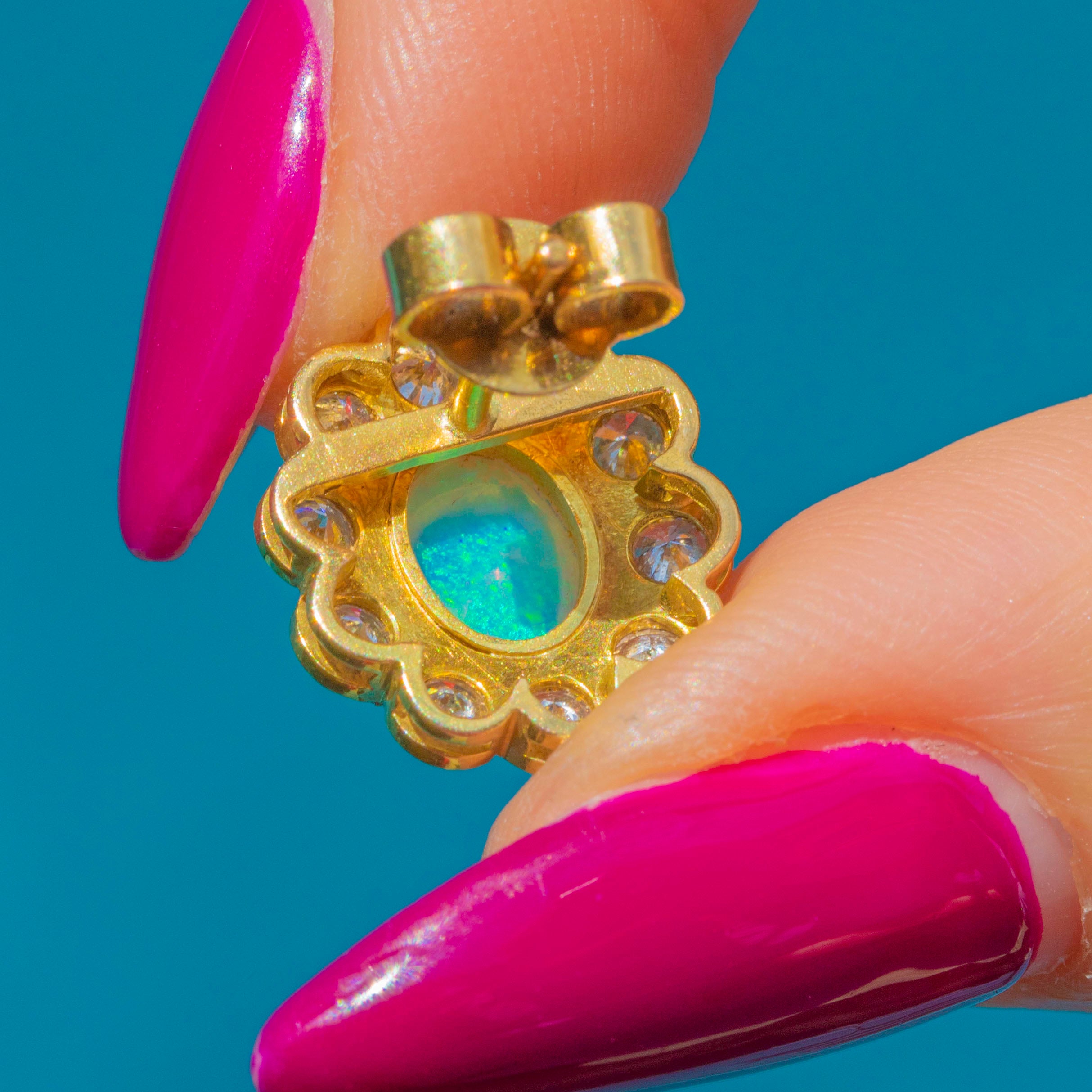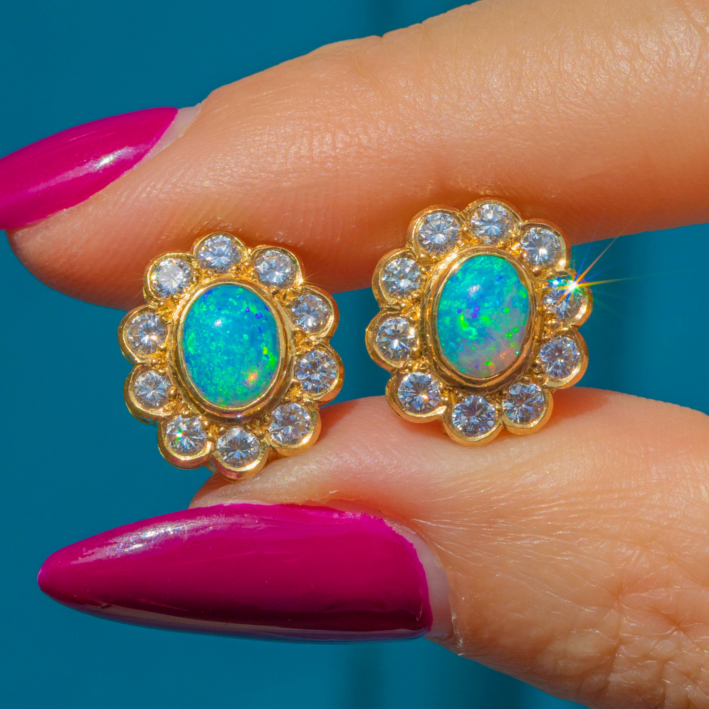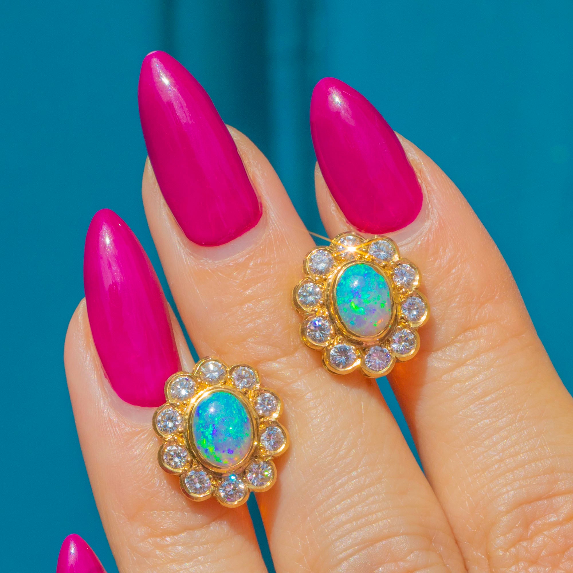 These vintage floral earrings each feature an iridescent Opal in their centre, radiating a kaleidoscope of blues, greens and striking orange hues as they catch the light. Each Opal is encircled by a halo of scintillating Diamonds, boasting 1.00ct combined and dazzling from every angle.
