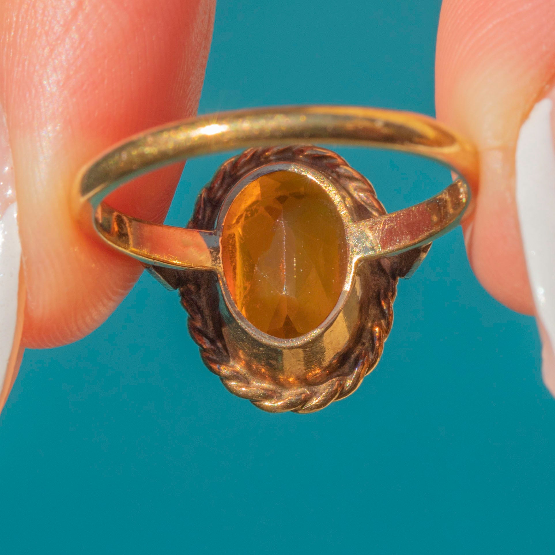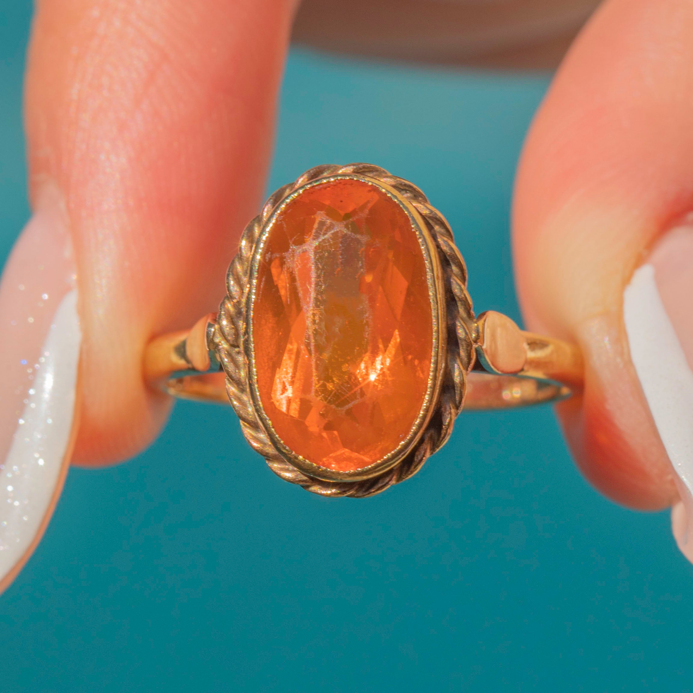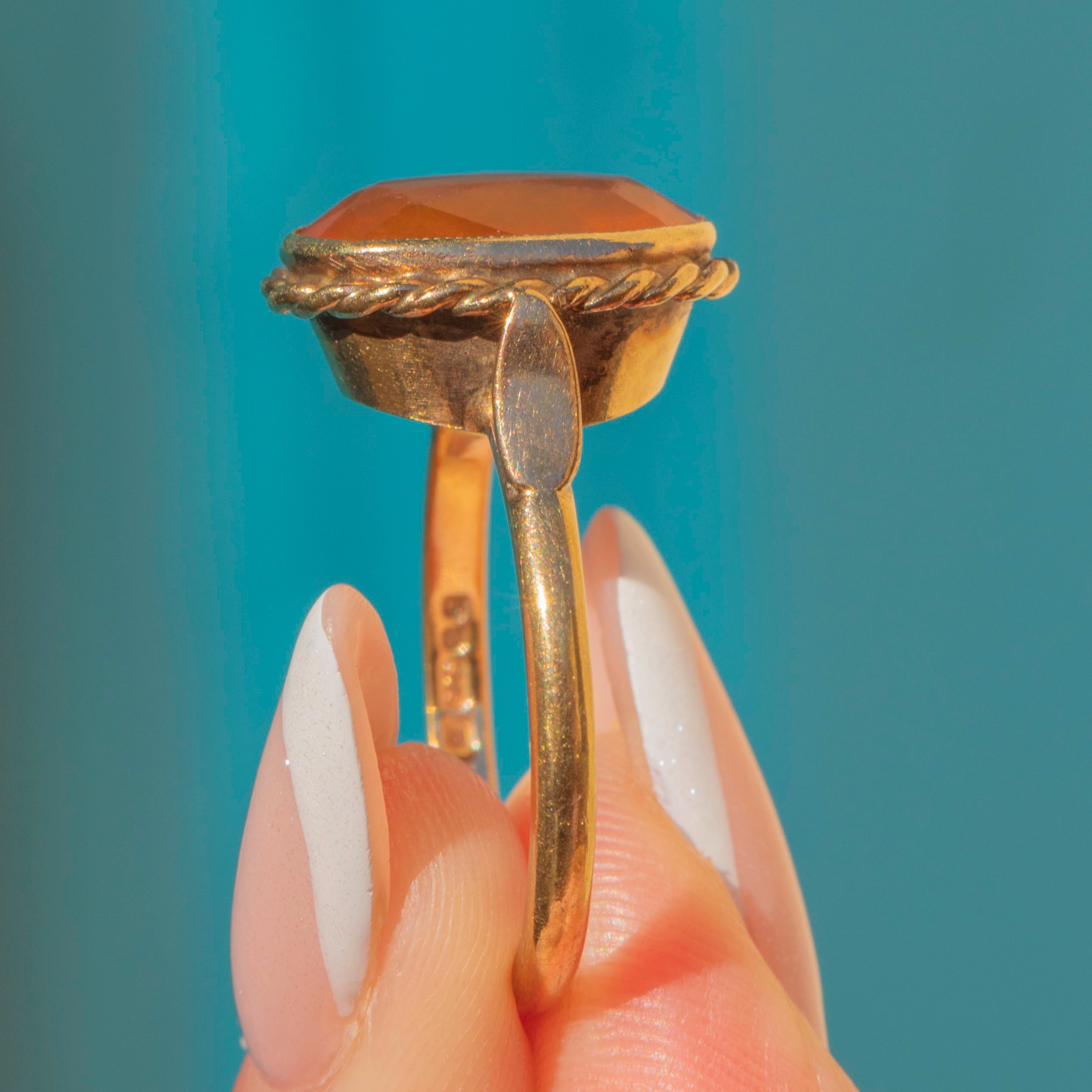 This impressive 9ct Gold Fire Opal dress ring is a feast for the eyes! A tangerine dream, her vivid fire Opal sits poised in a decorative rope border, with the light dancing across her facets.