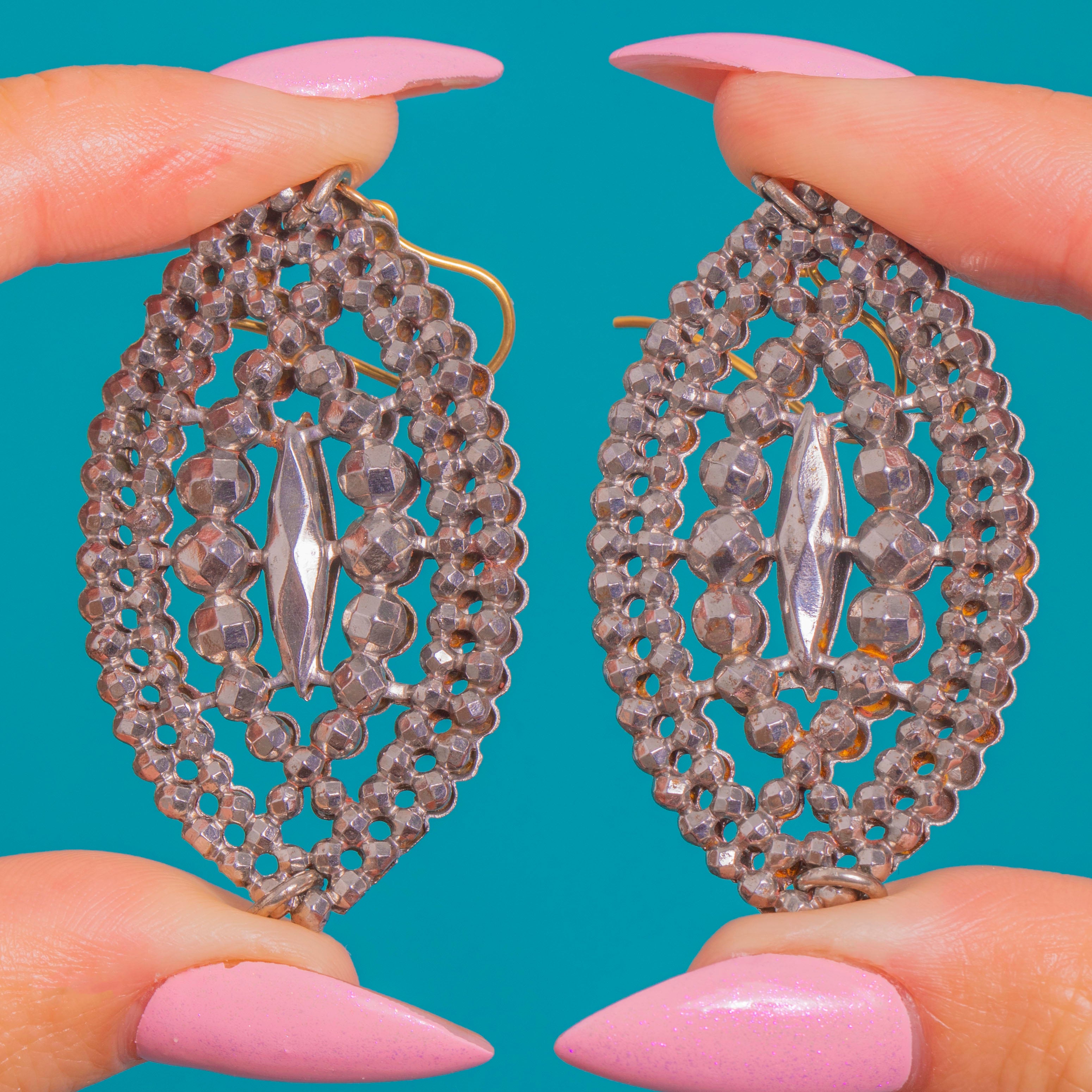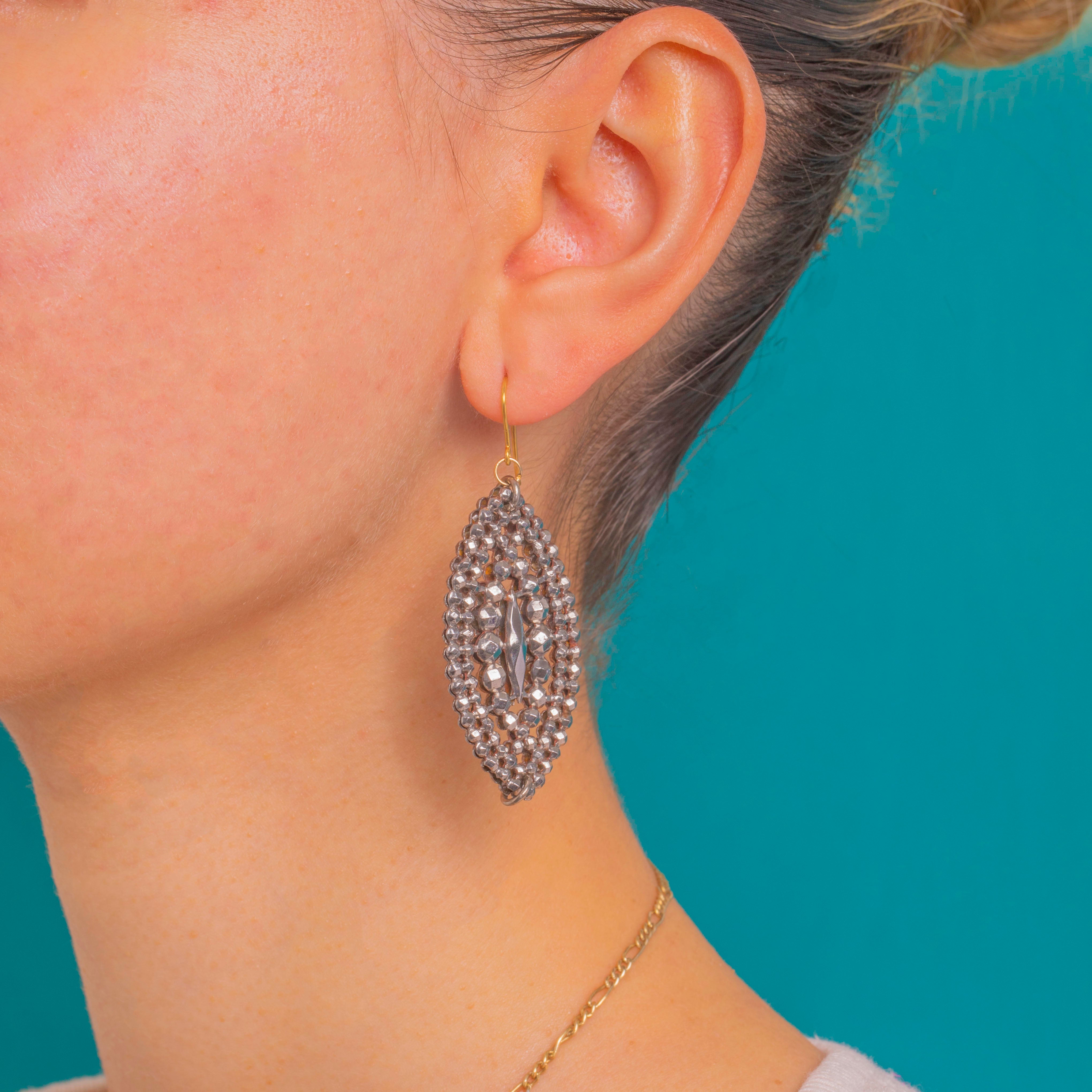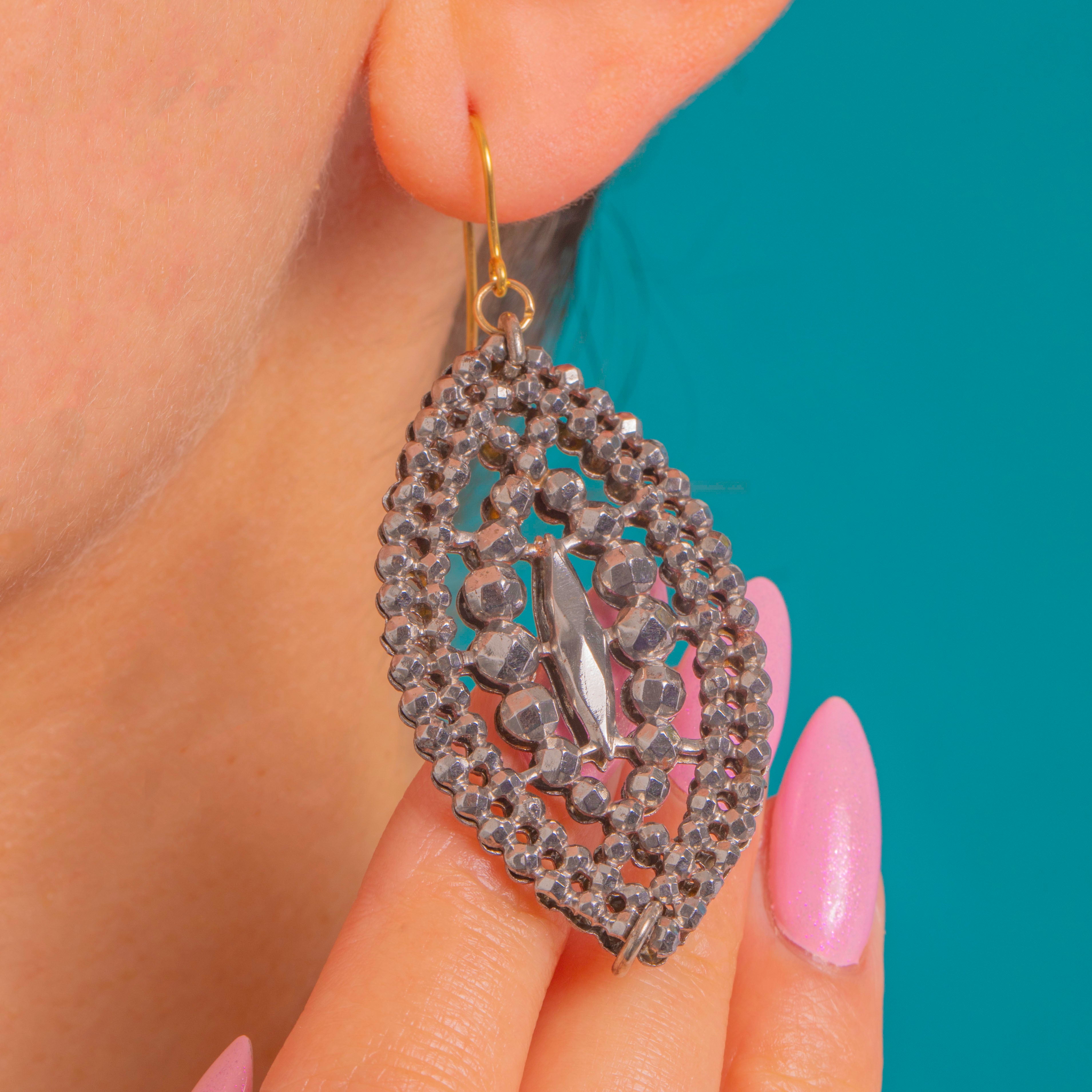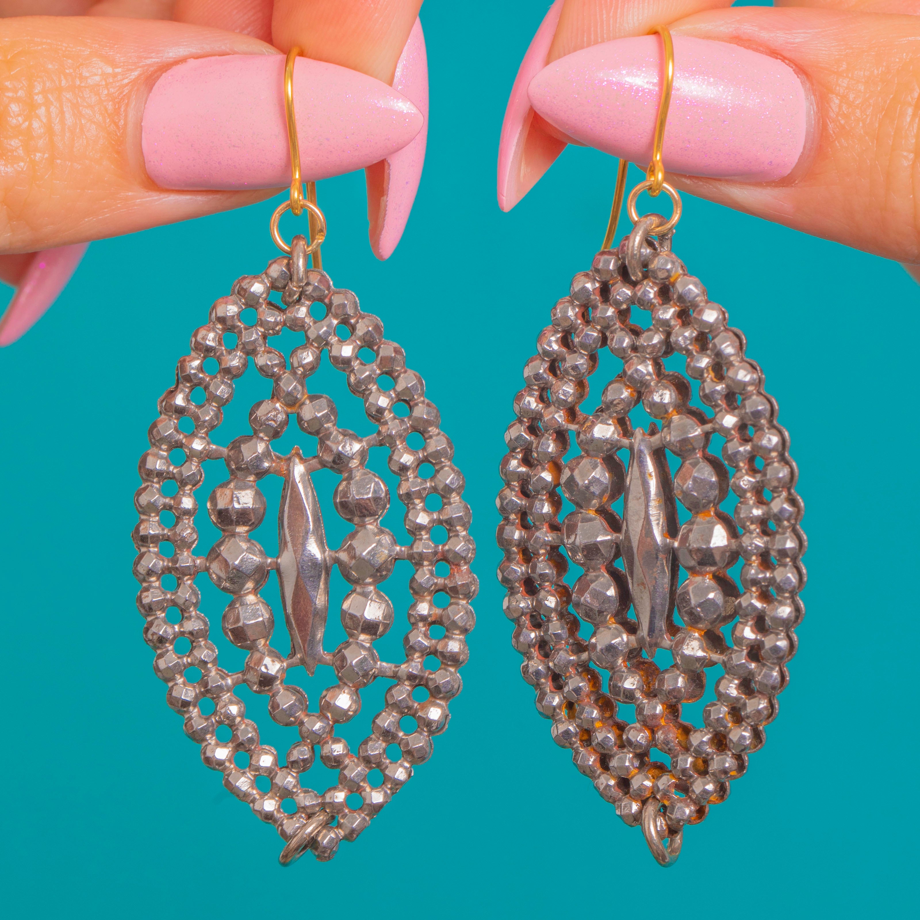 These impressive Georgian cut steel drop earrings shimmer with a signature constellation of faceted studs, arranged in elegant concentric rows around an elongated navette silhouette. The openwork design gives a lace-like lightness, while the densely faceted cut steel catches and scatters the light with a captivating, mirror-bright sparkle.