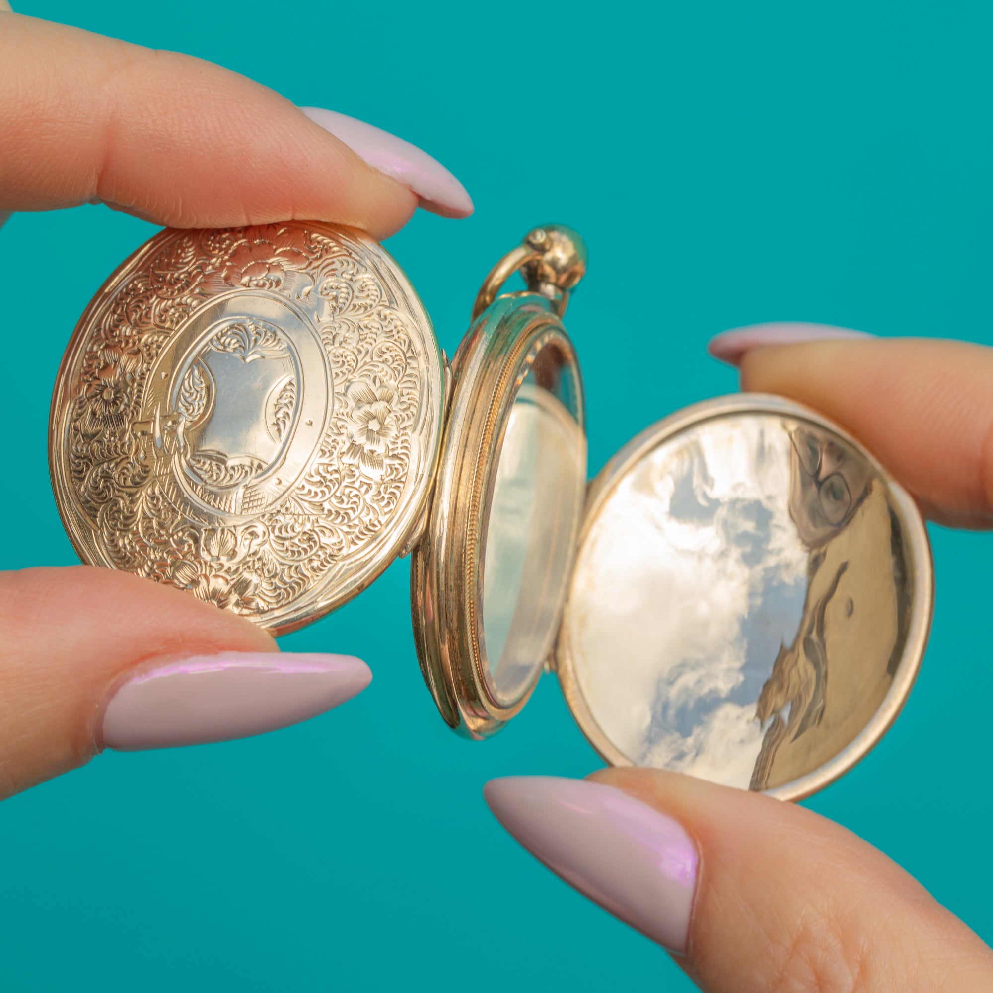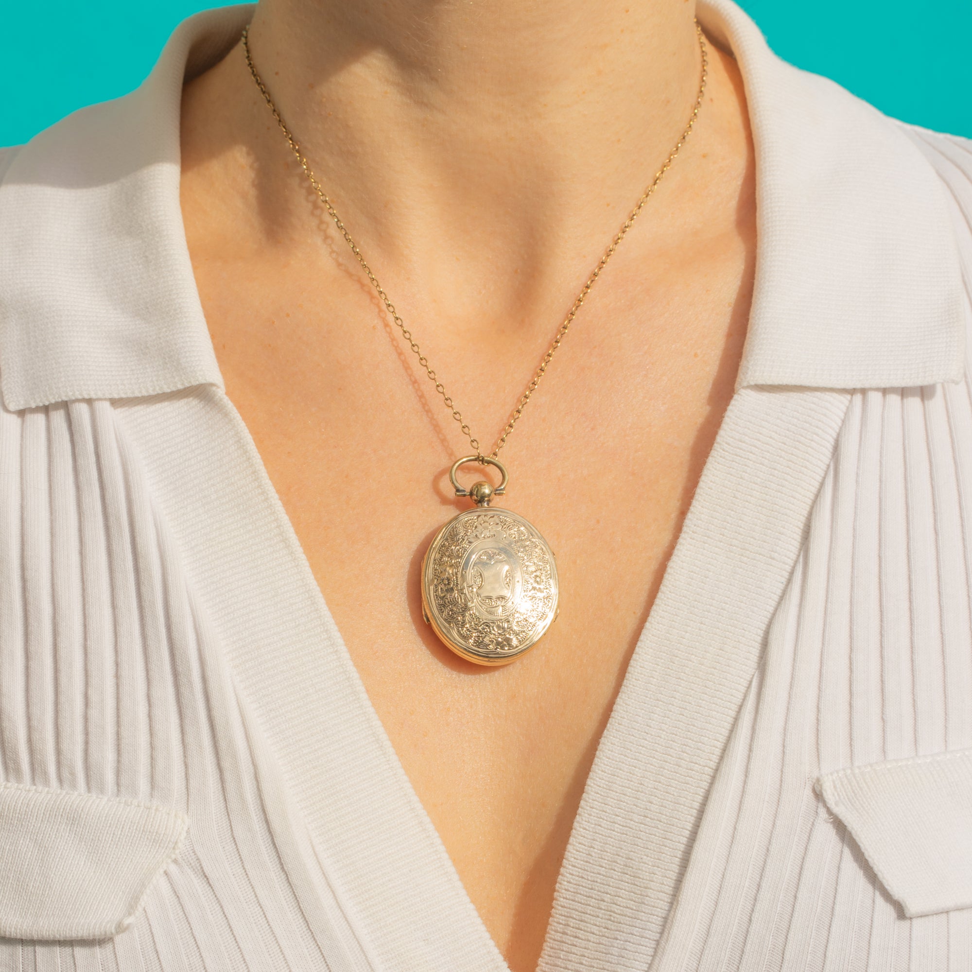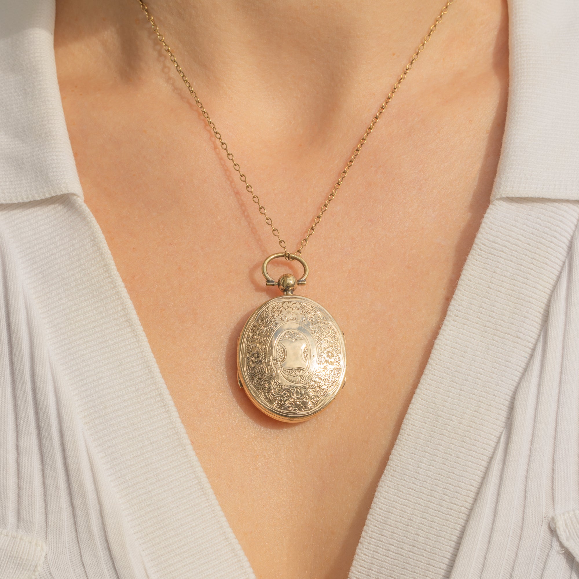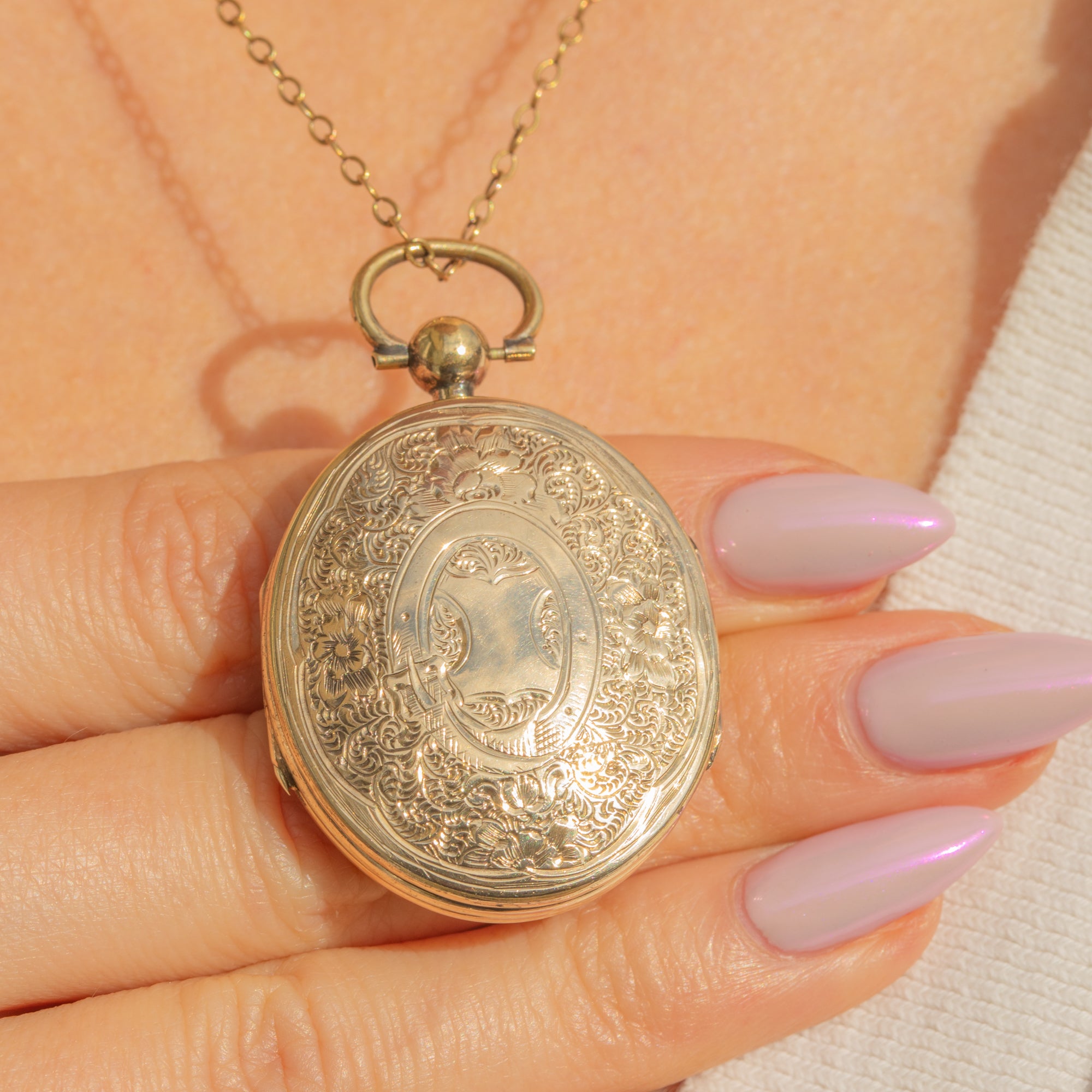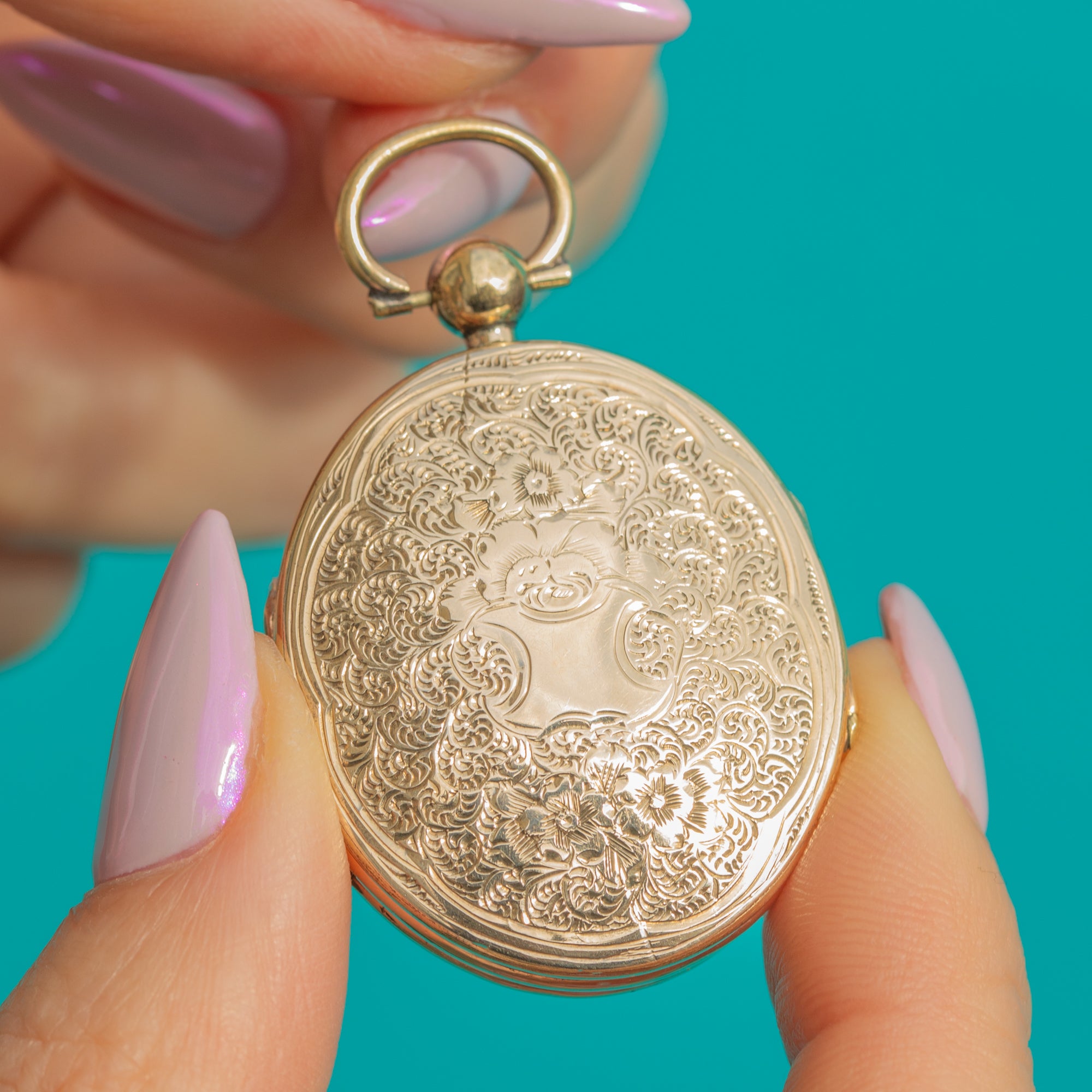 This rare and impressive Victorian “family” locket, c.1860, opens on both sides and showcases wonderfully crisp hand-engraving. Flourishes of Forget-me-nots, a symbolic buckle motif and twin blank cartouches decorate each face, giving it both sentiment and space for personalisation.