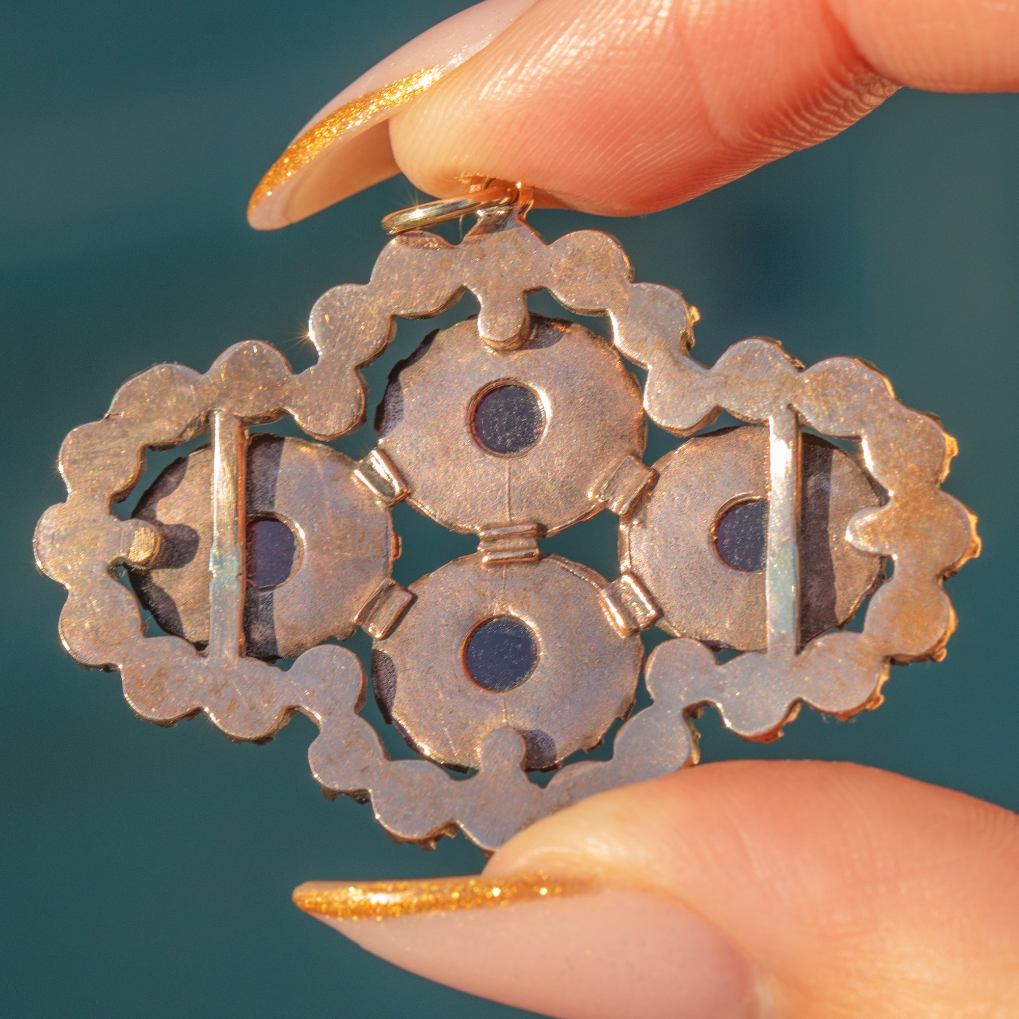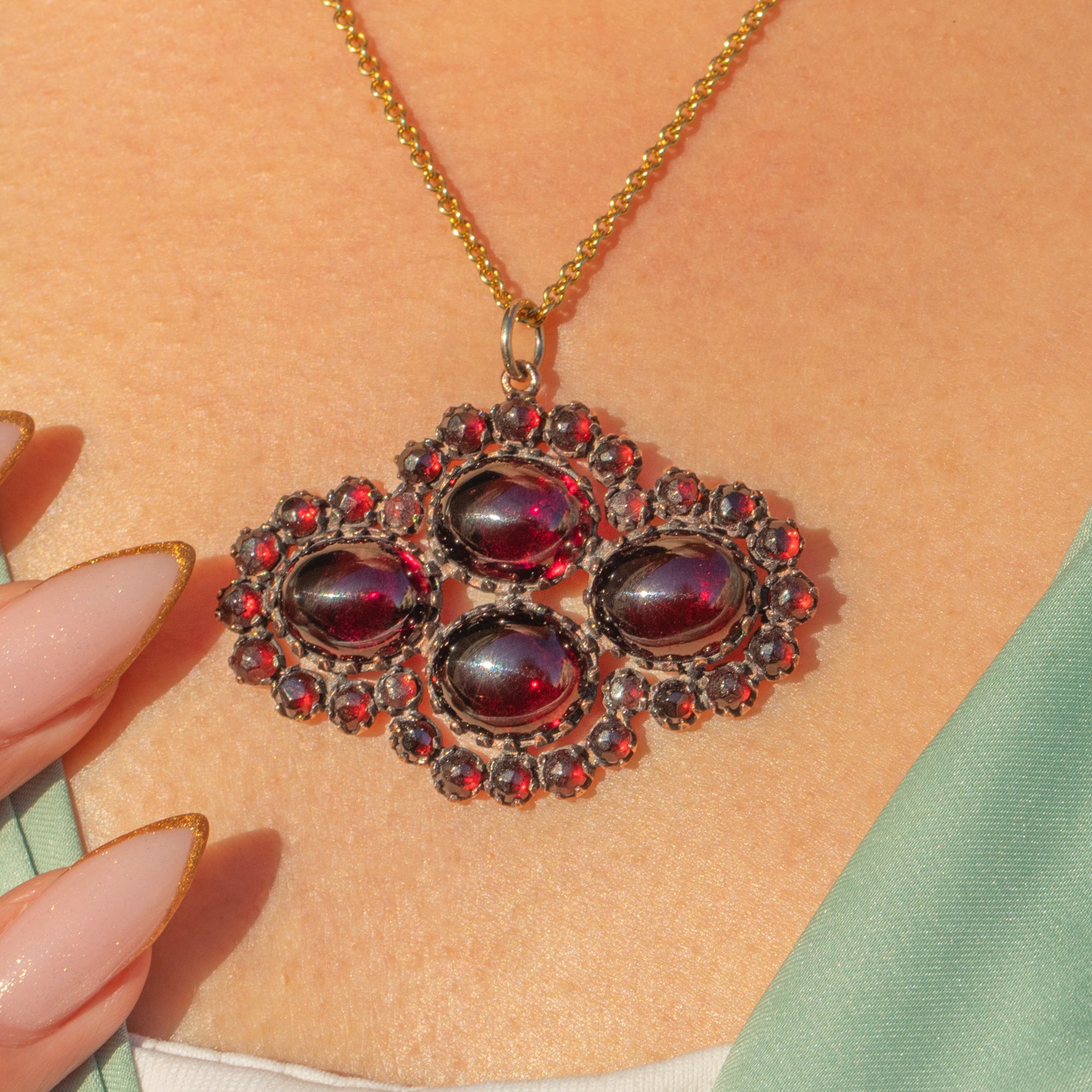 The design showcases both small round Garnets and four larger cabochon stones, giving a lovely mix of sparkle and velvety depth. Finished with a solid 9ct Gold jump ring so it’s ready to hang on your favourite chain, this is a bold, beautifully wearable antique statement pendant.
