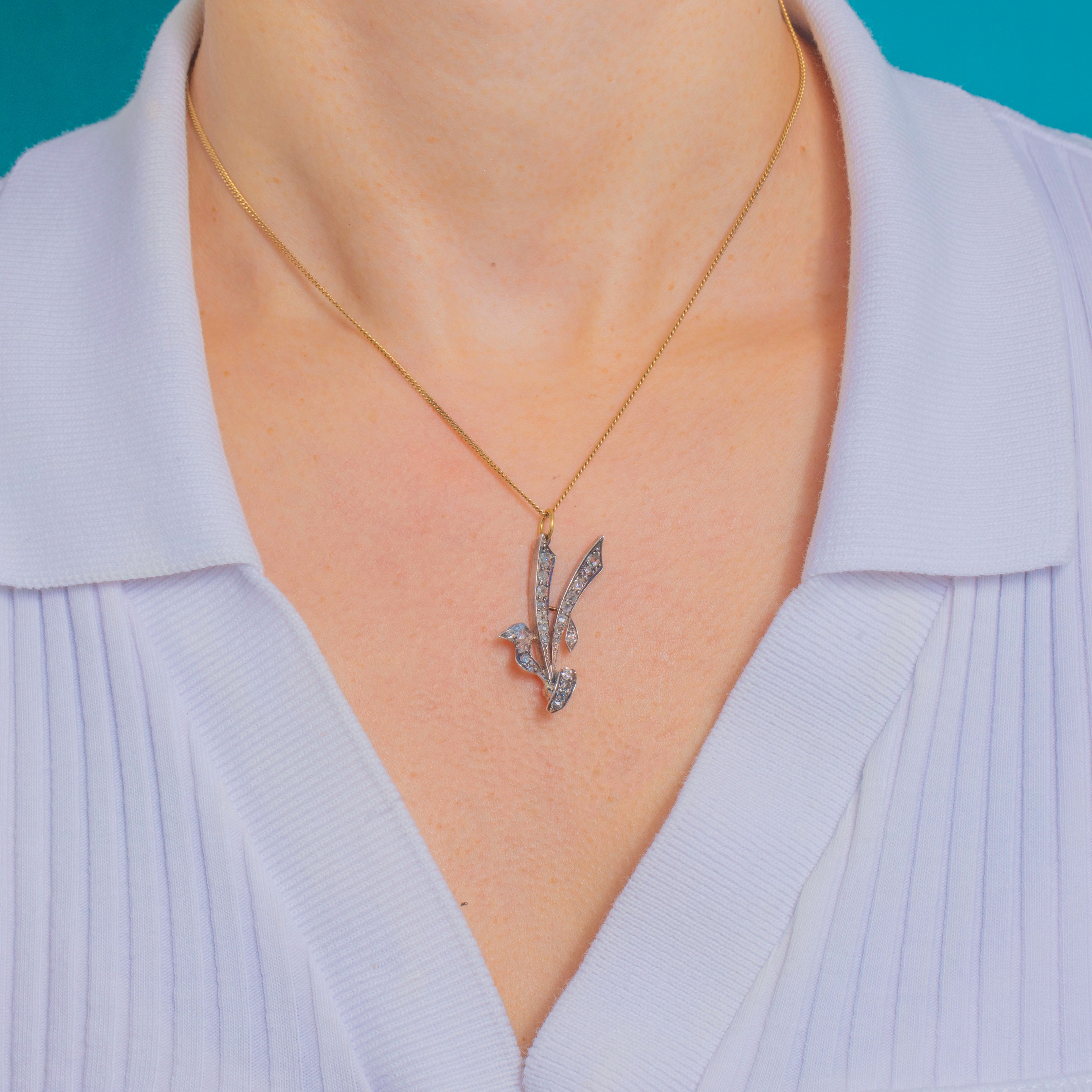 A lyrical Victorian foliate pendant composed as a curling ribbon and leafy sprig, dotted throughout with twinkling rose-cut Diamonds, the design alive with movement and delicate, naturalistic detail.