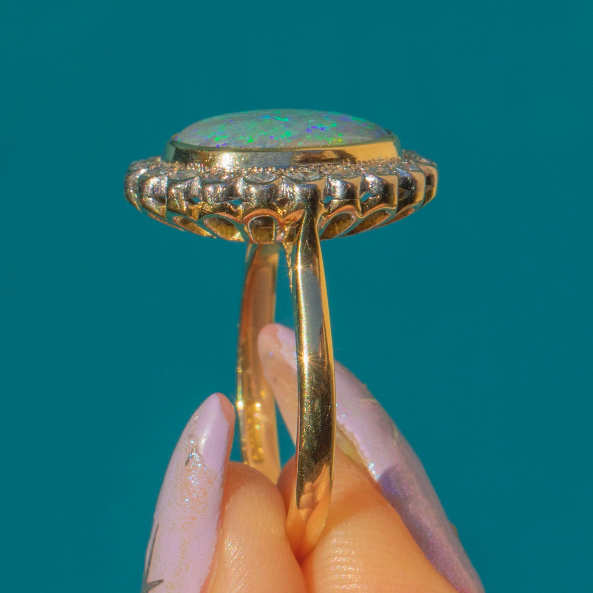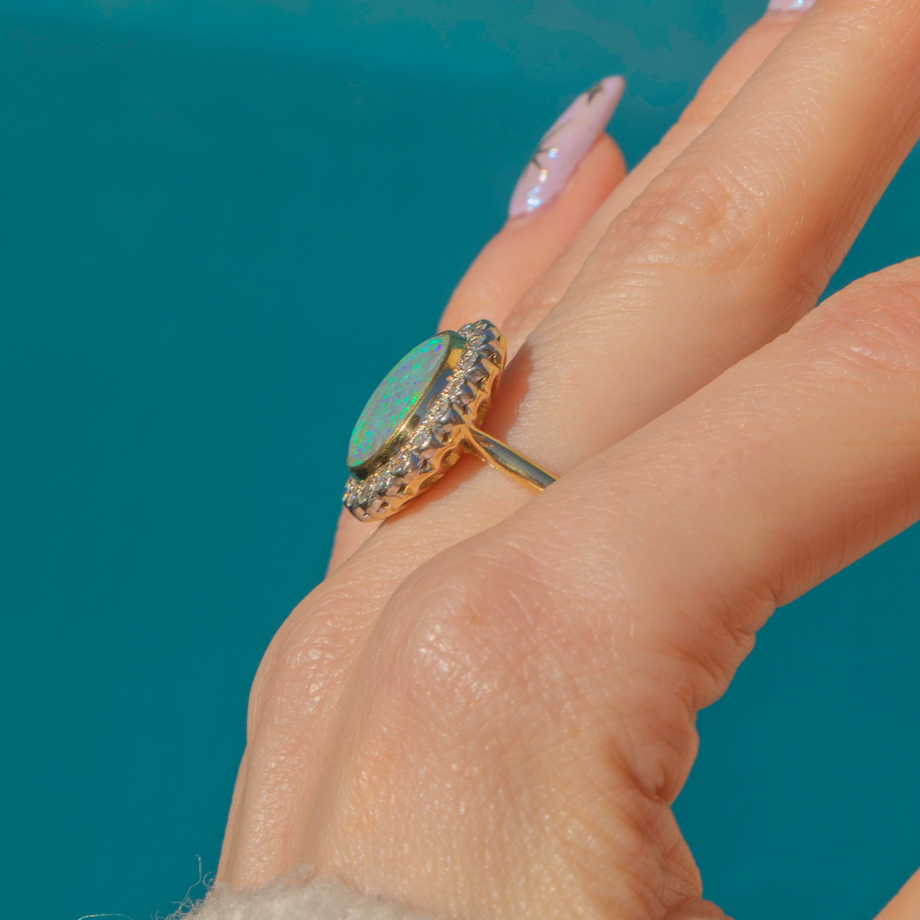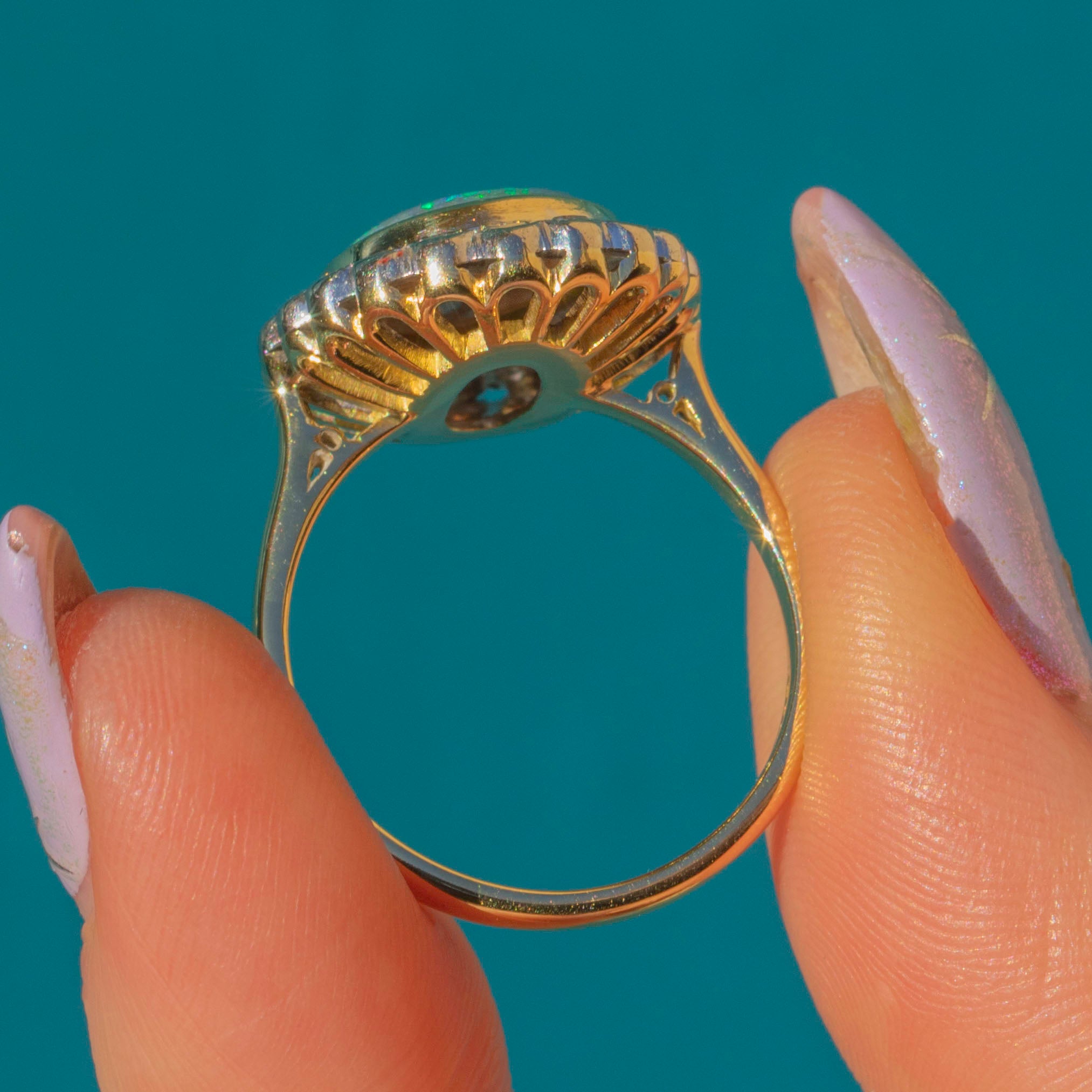 The Opal is haloed by a plethora of bright gleaming natural Diamonds, each possessing a delightful twinkle as they catch the light. Set into resplendent 18ct Gold, this piece is a true Vintage delight and undeniably regal in every way!
