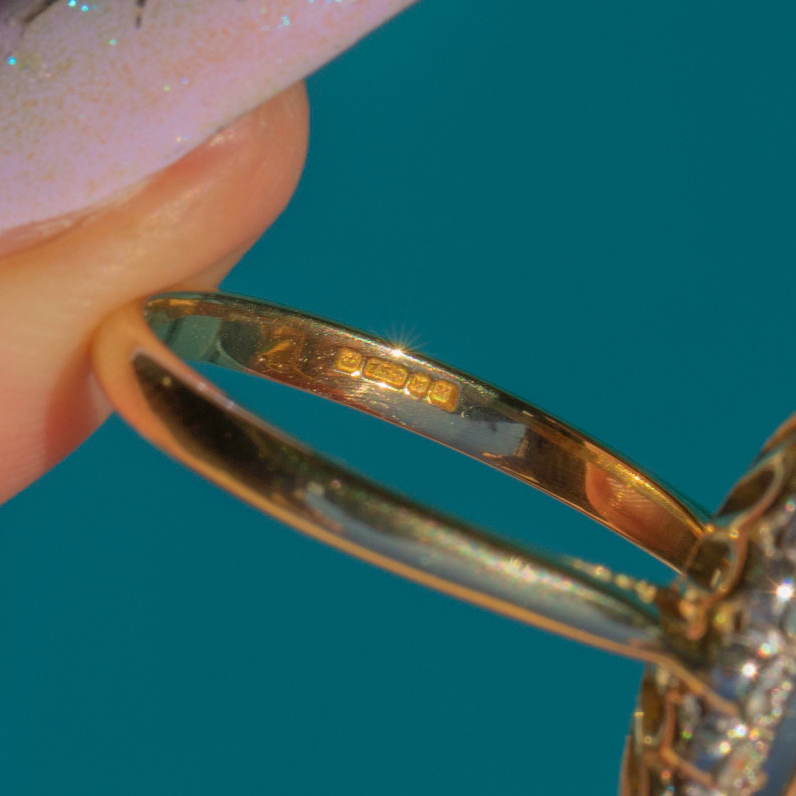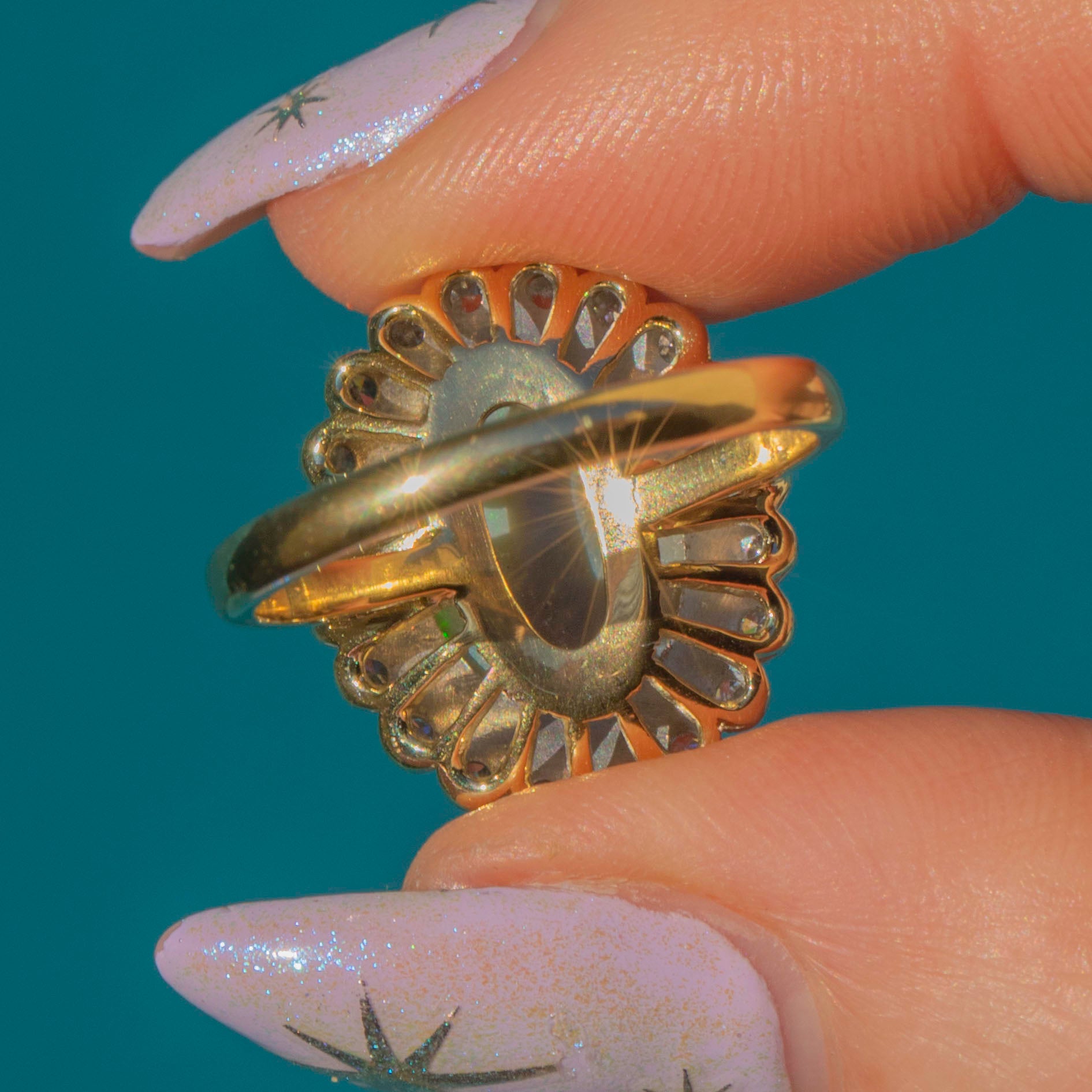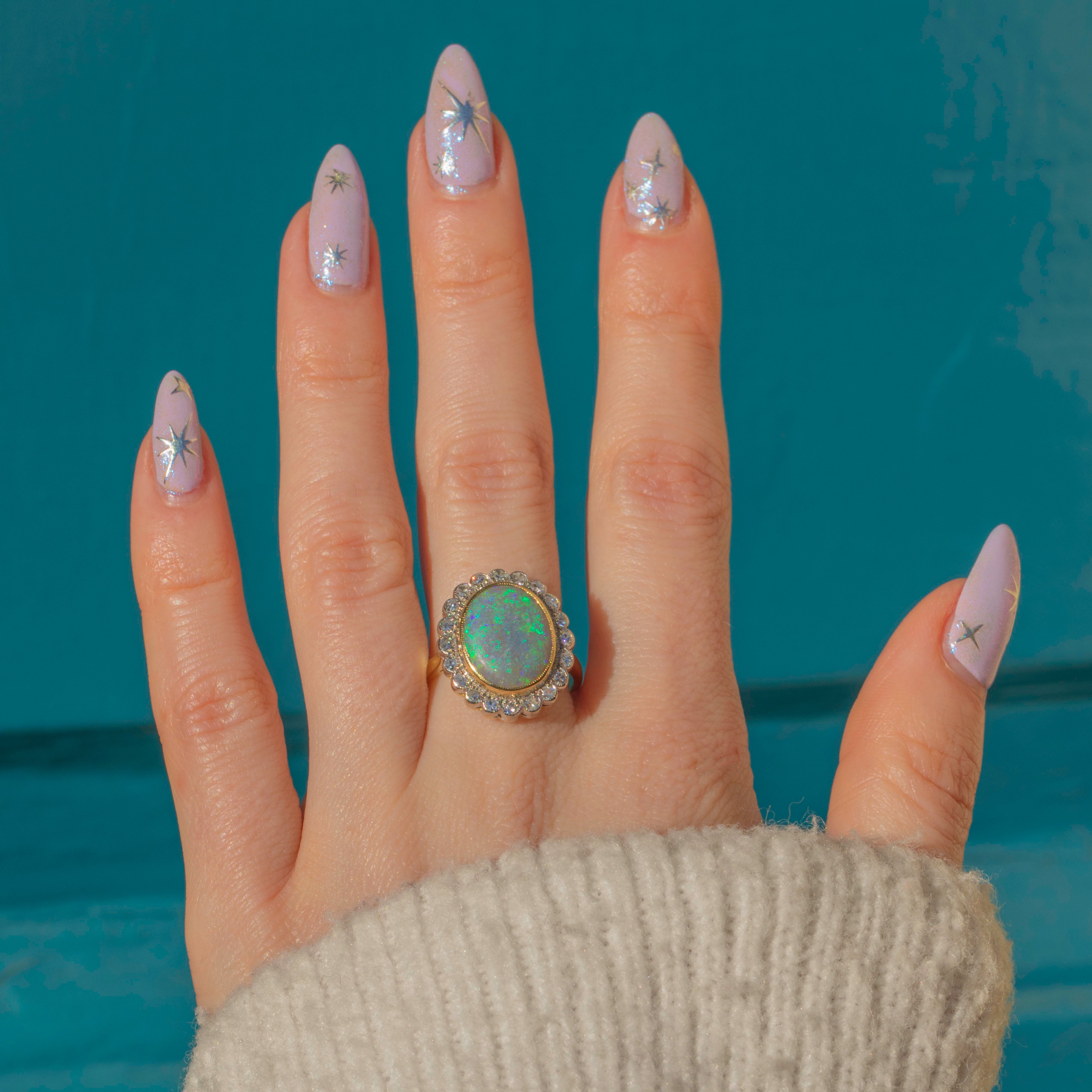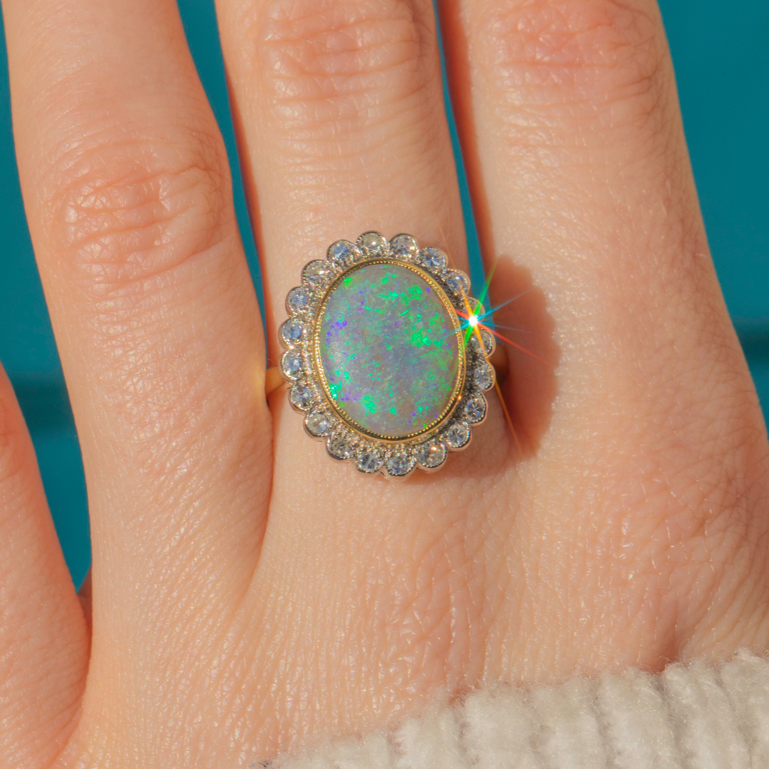 The Opal is haloed by a plethora of bright gleaming natural Diamonds, each possessing a delightful twinkle as they catch the light. Set into resplendent 18ct Gold, this piece is a true Vintage delight and undeniably regal in every way!
