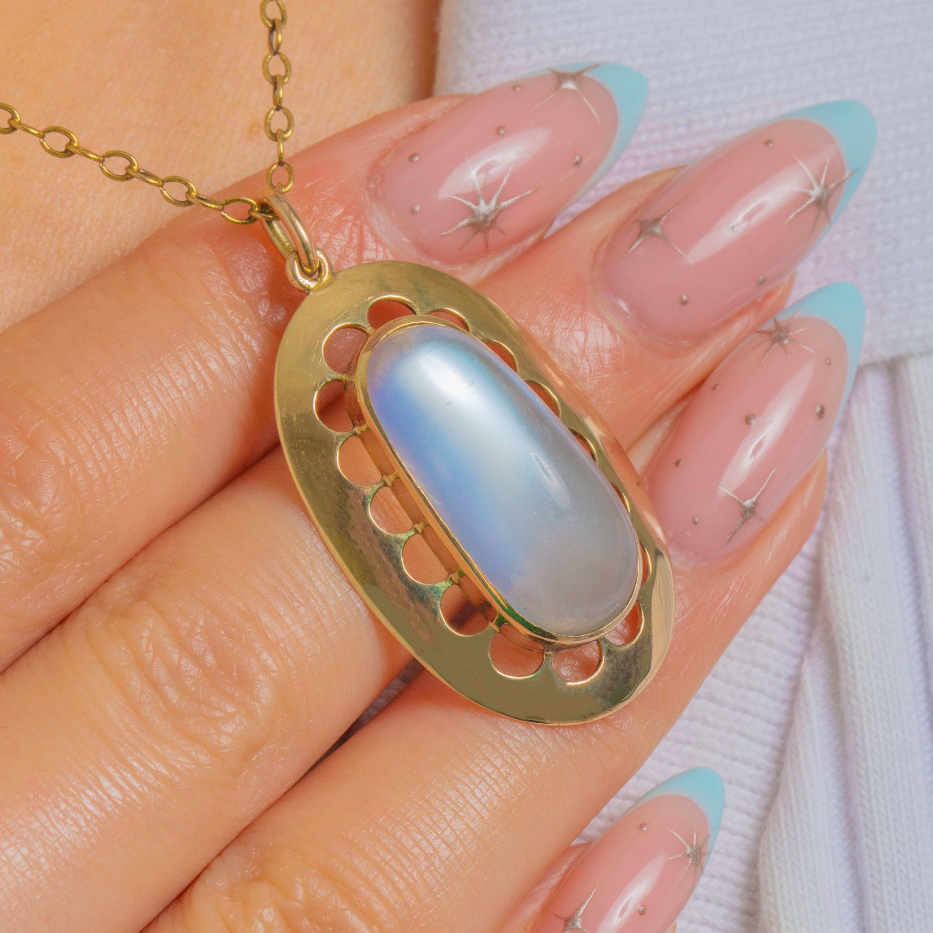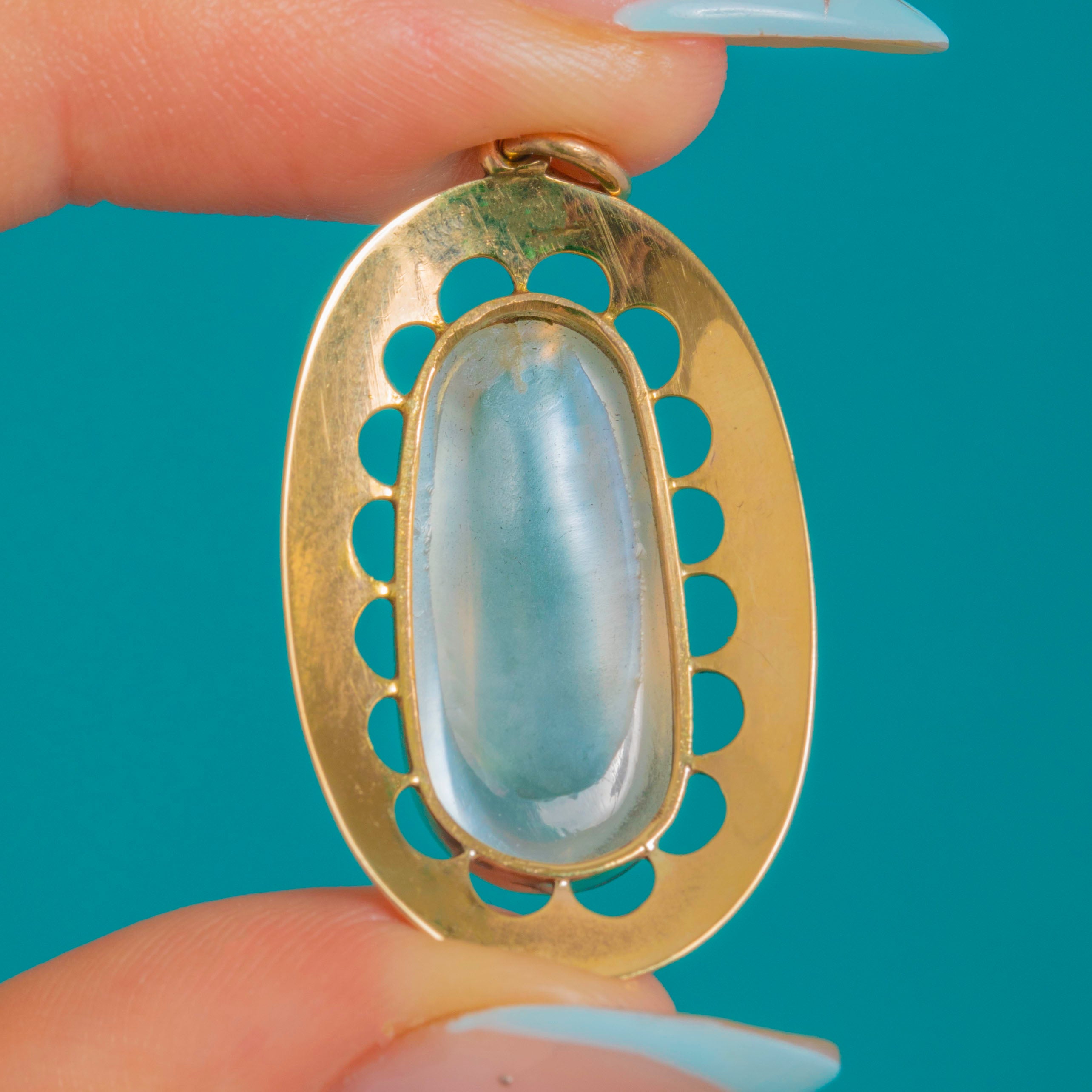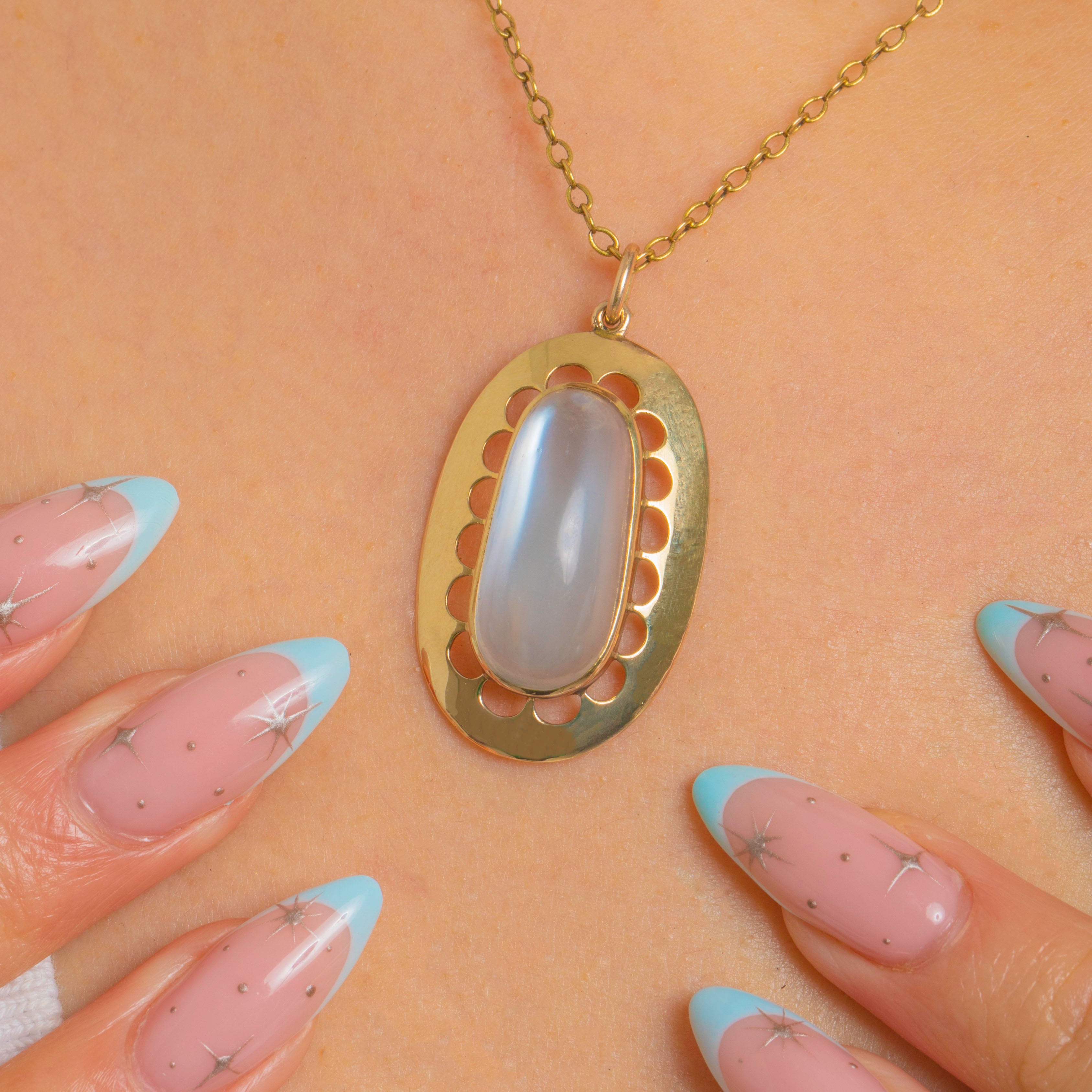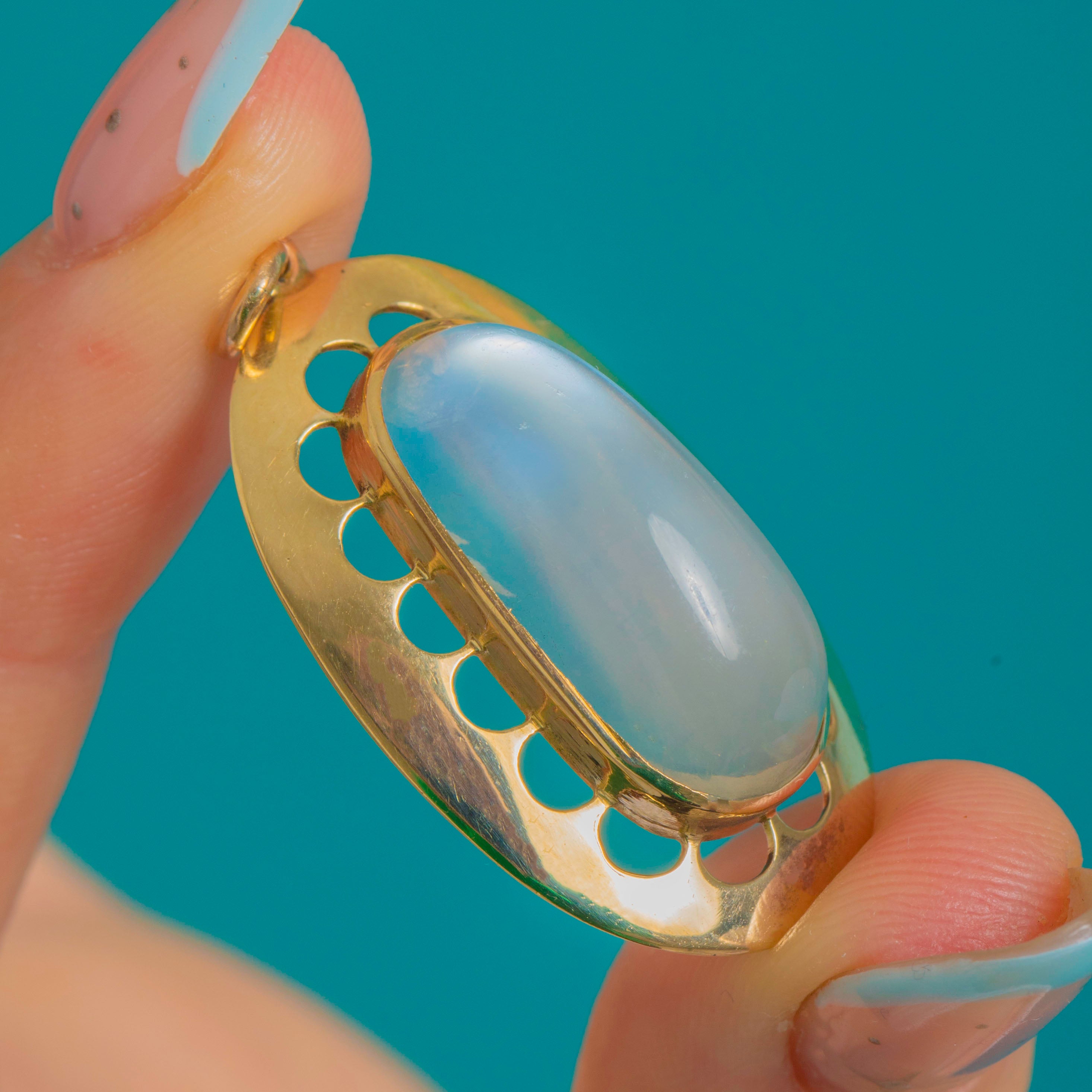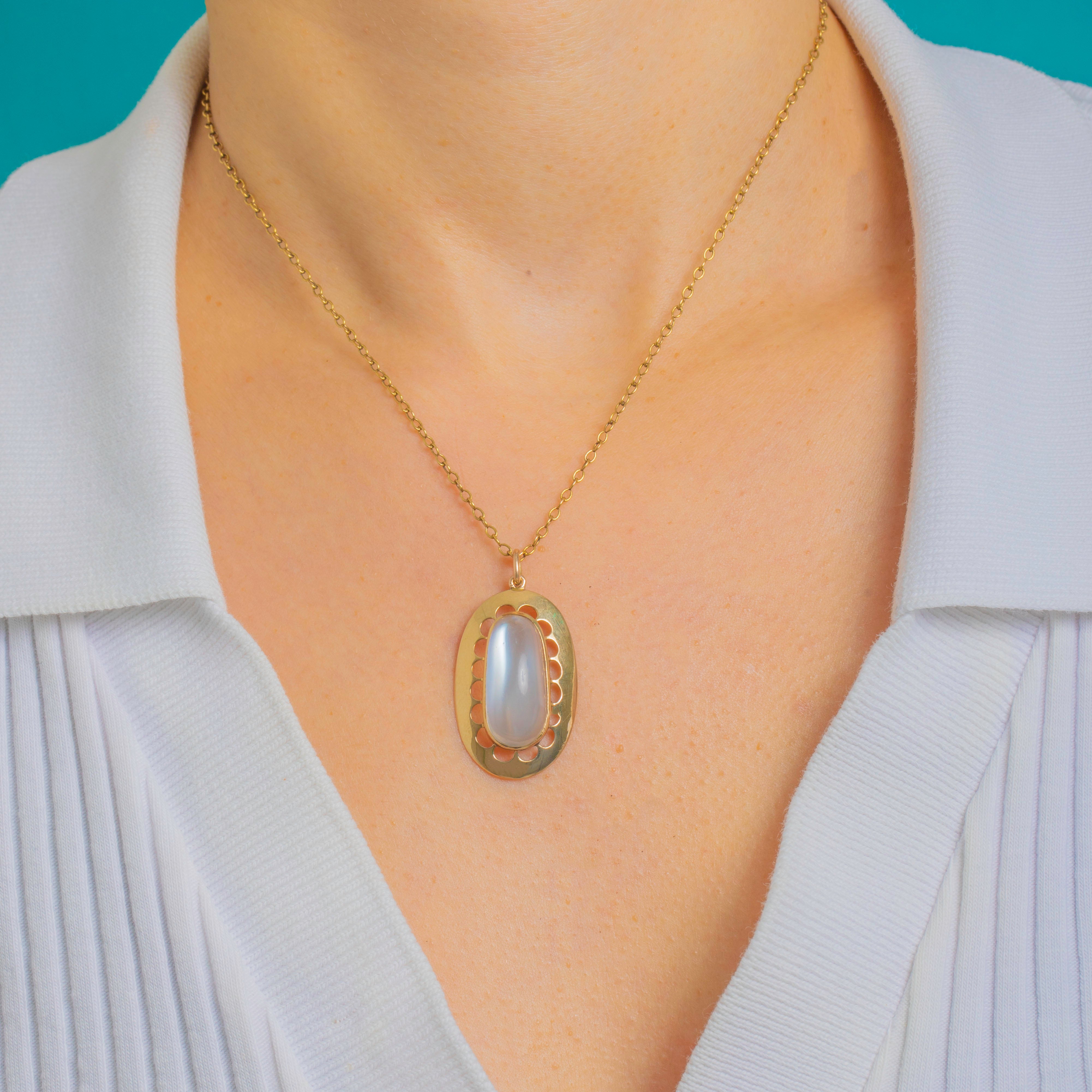Glowing with ethereal blue light, this Edwardian 9ct Gold pendant centres a sumptuous high-domed Moonstone of approximately 16.20 carats. The oval cabochon is framed by an elegant pierced oval plaque, its evenly spaced petal-like openings lending air and light to the design while drawing the eye to the gem’s soft adularescence.