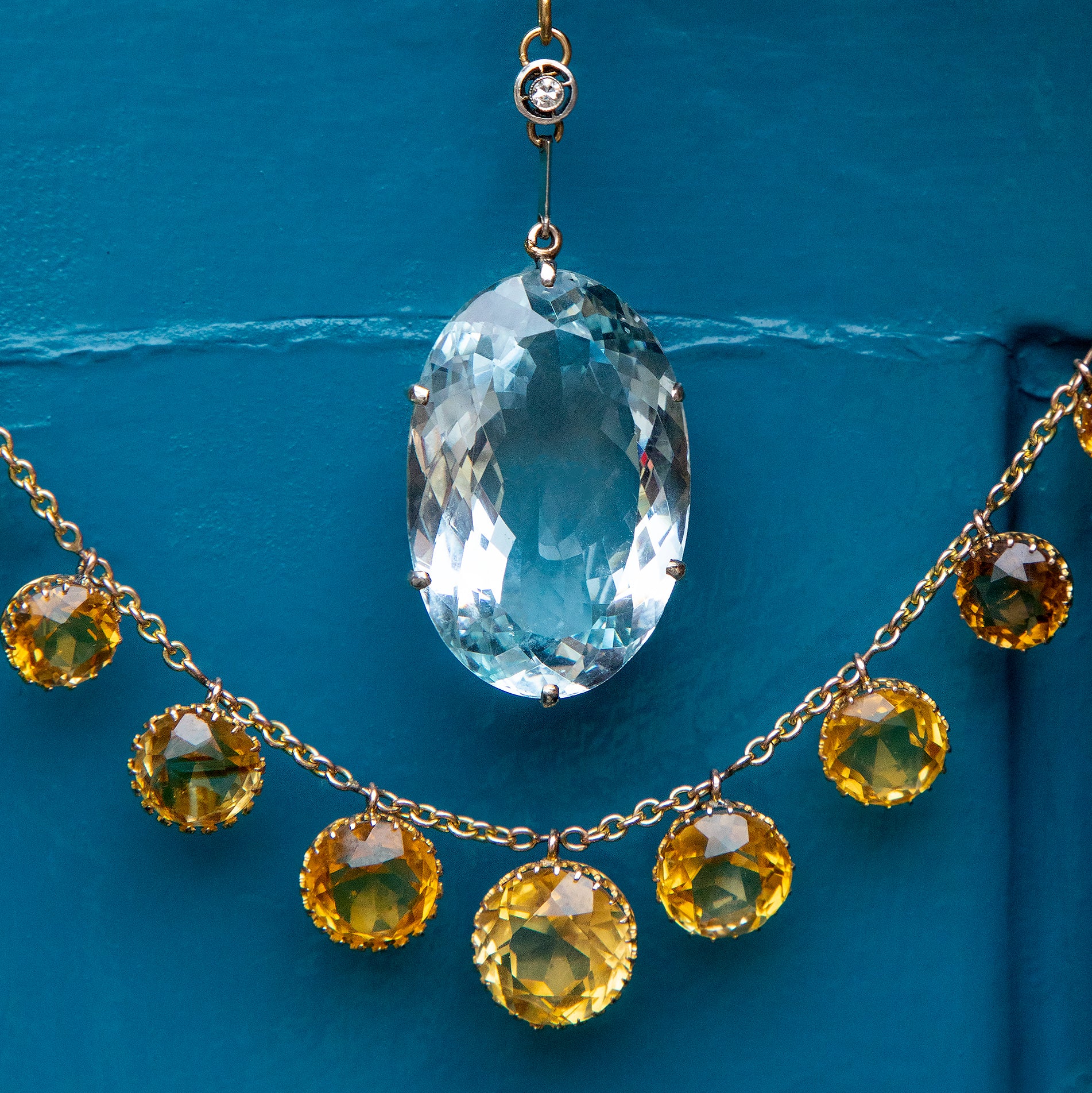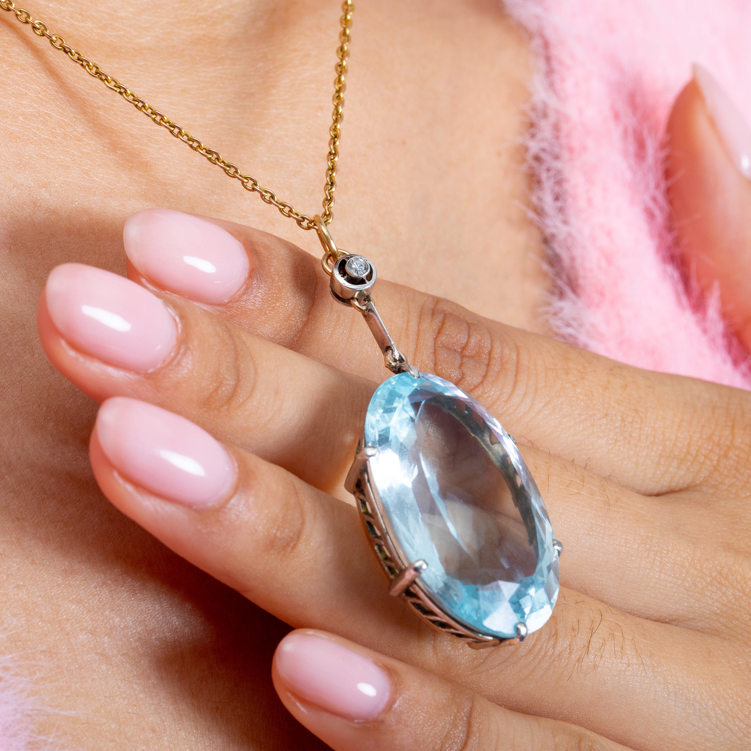 We simply adore this large antique Aquamarine oval pendant! Exuding glacial blue hues from every dazzling facet of her 39.00ct Aquamarine, this splendid Edwardian pendant will charm its way into being your new favourite piece.
