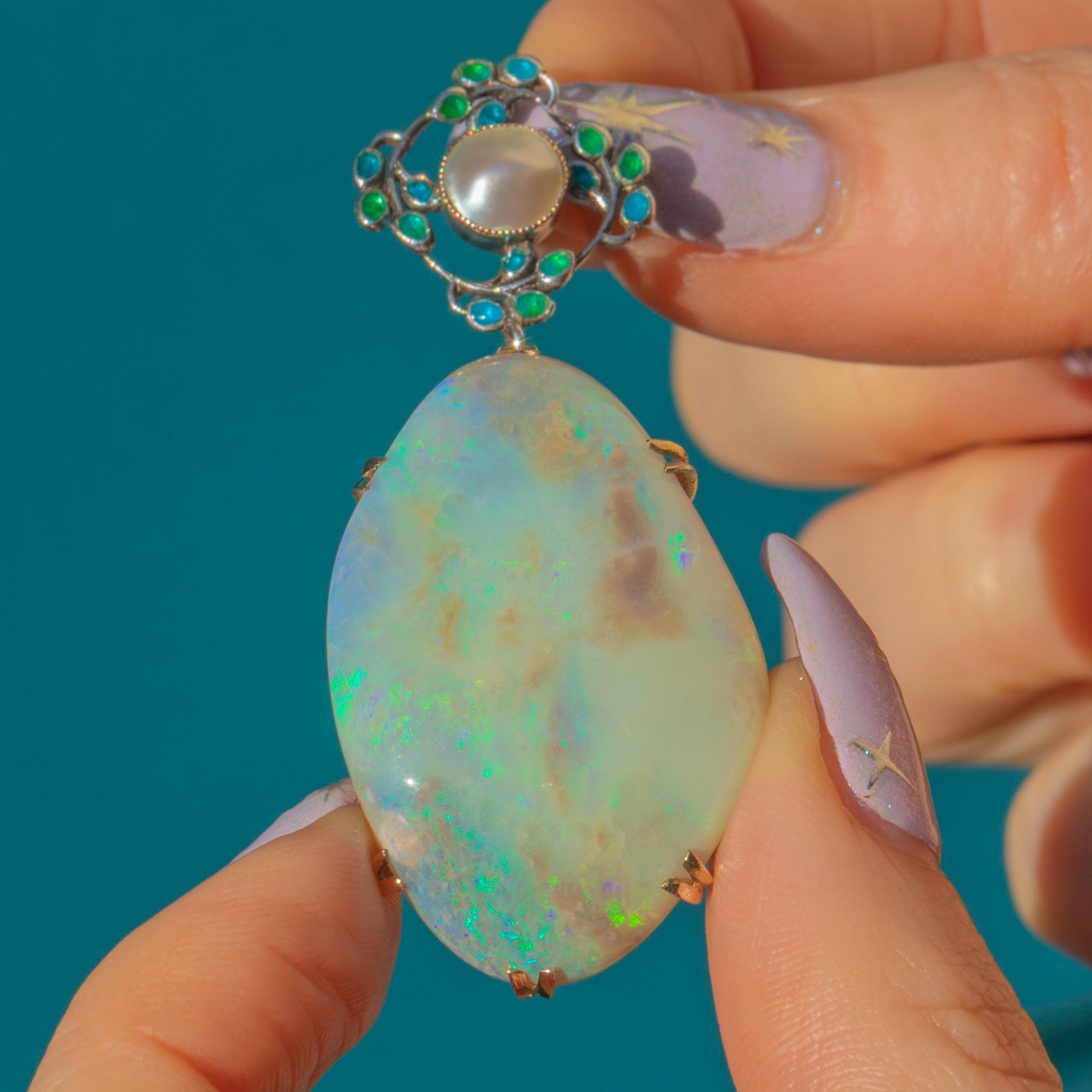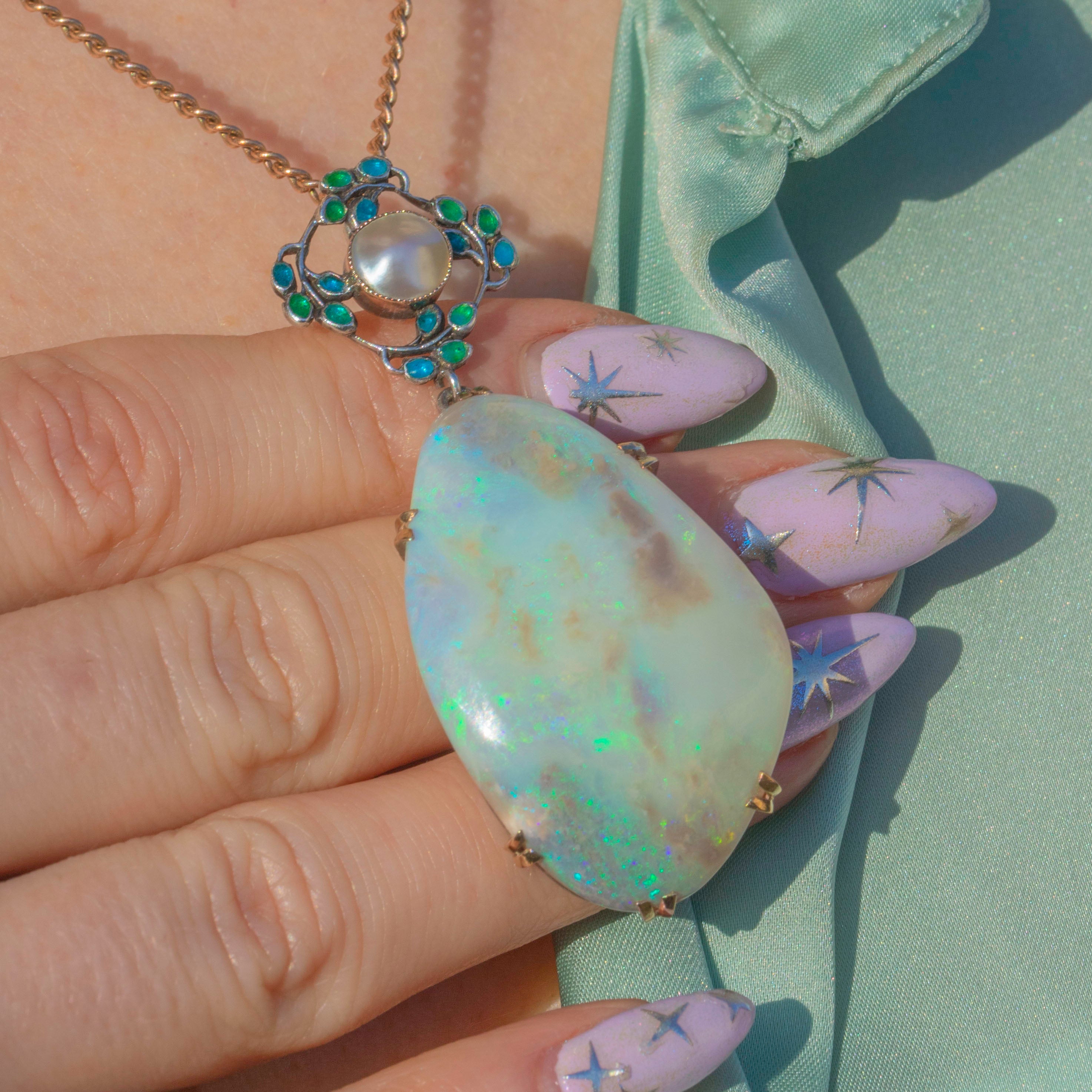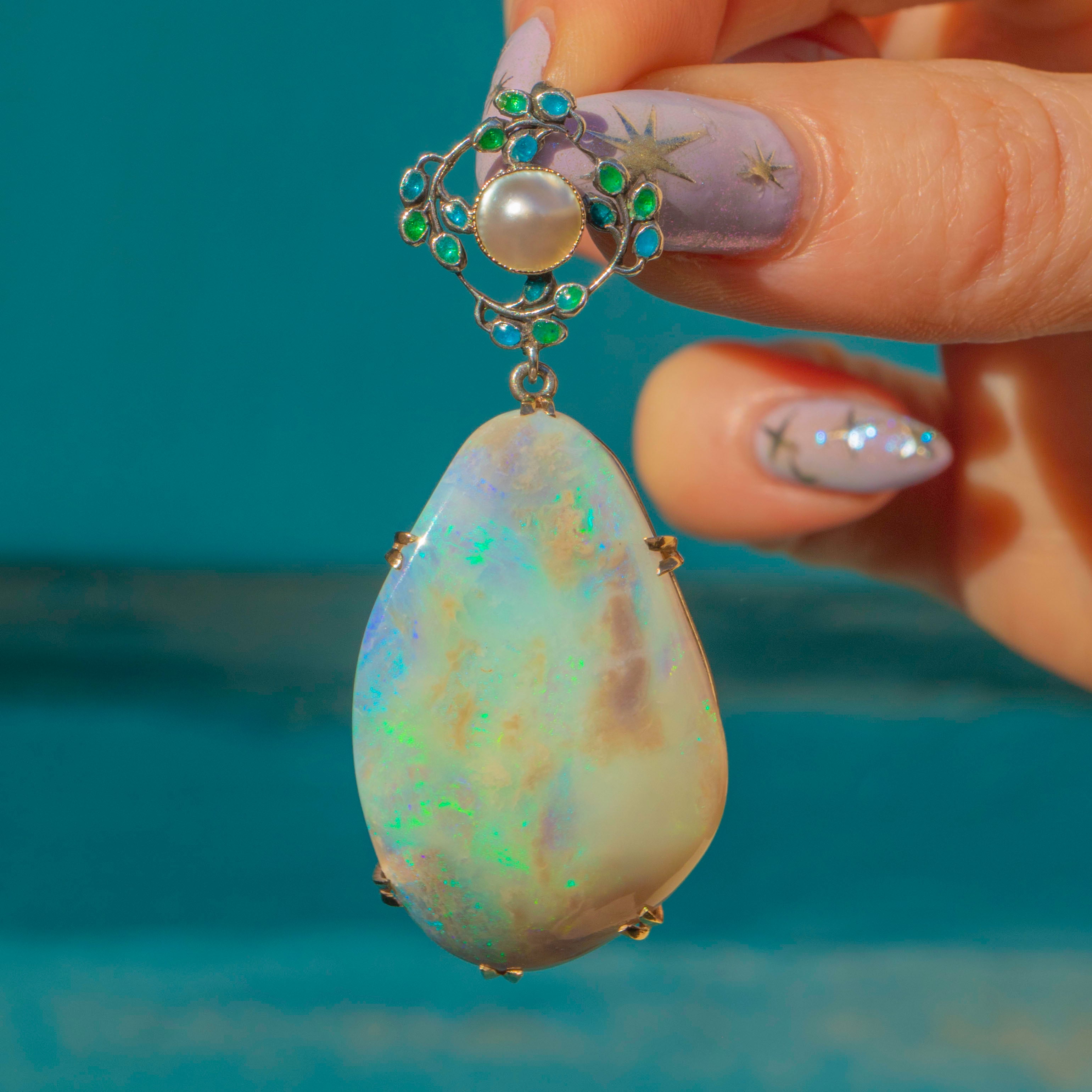 This large Arts & Crafts Enamel Opal pendant boasts a breathtaking 50.00ct boulder Opal, radiating galactic flashes of colour. Resting above this kaleidoscopic Opal is a delicate Mother-of-Pearl accent, adding an ethereal sea shimmer haloed by vibrant green and blue Enamel details, enhancing the pendant’s artistic and natural appeal.
