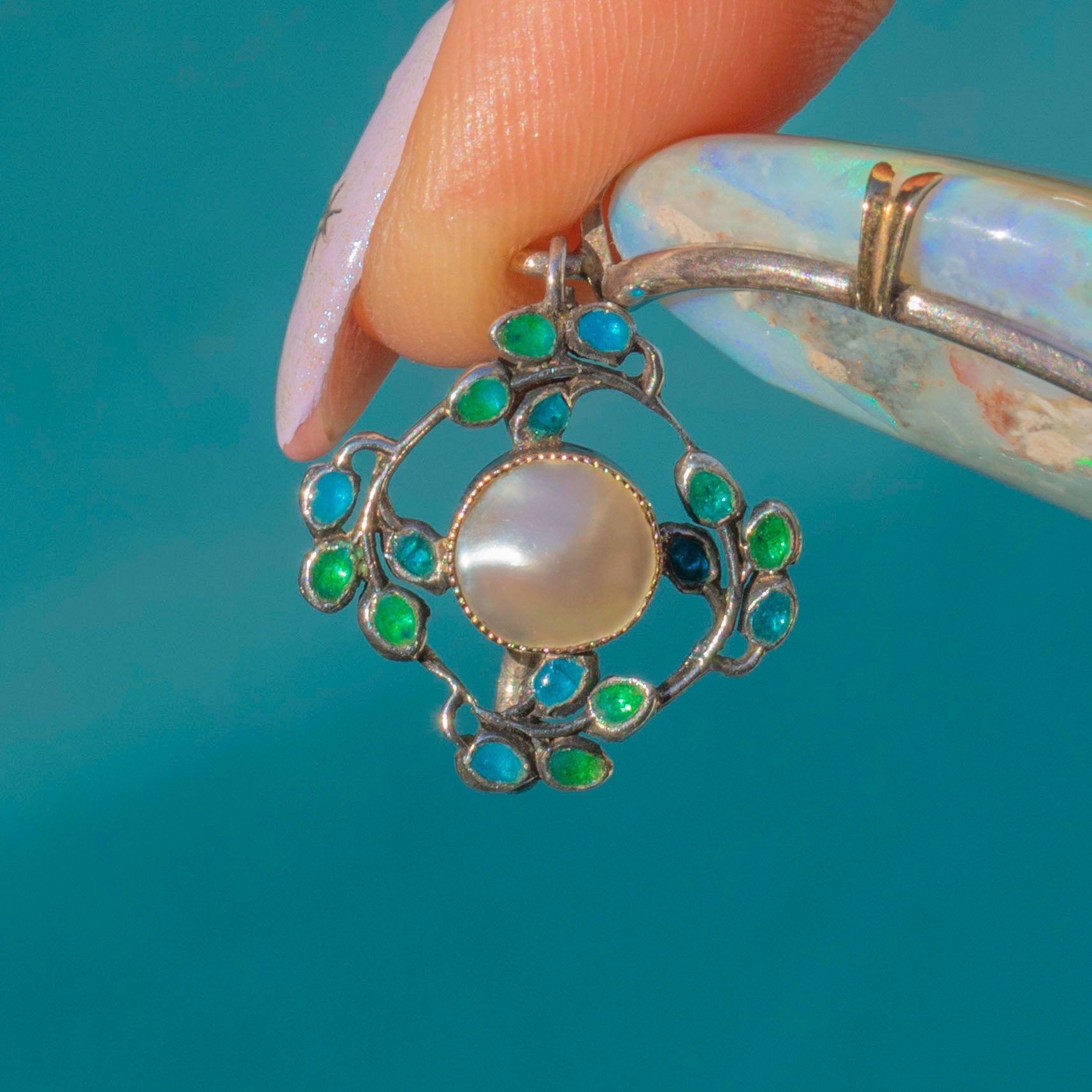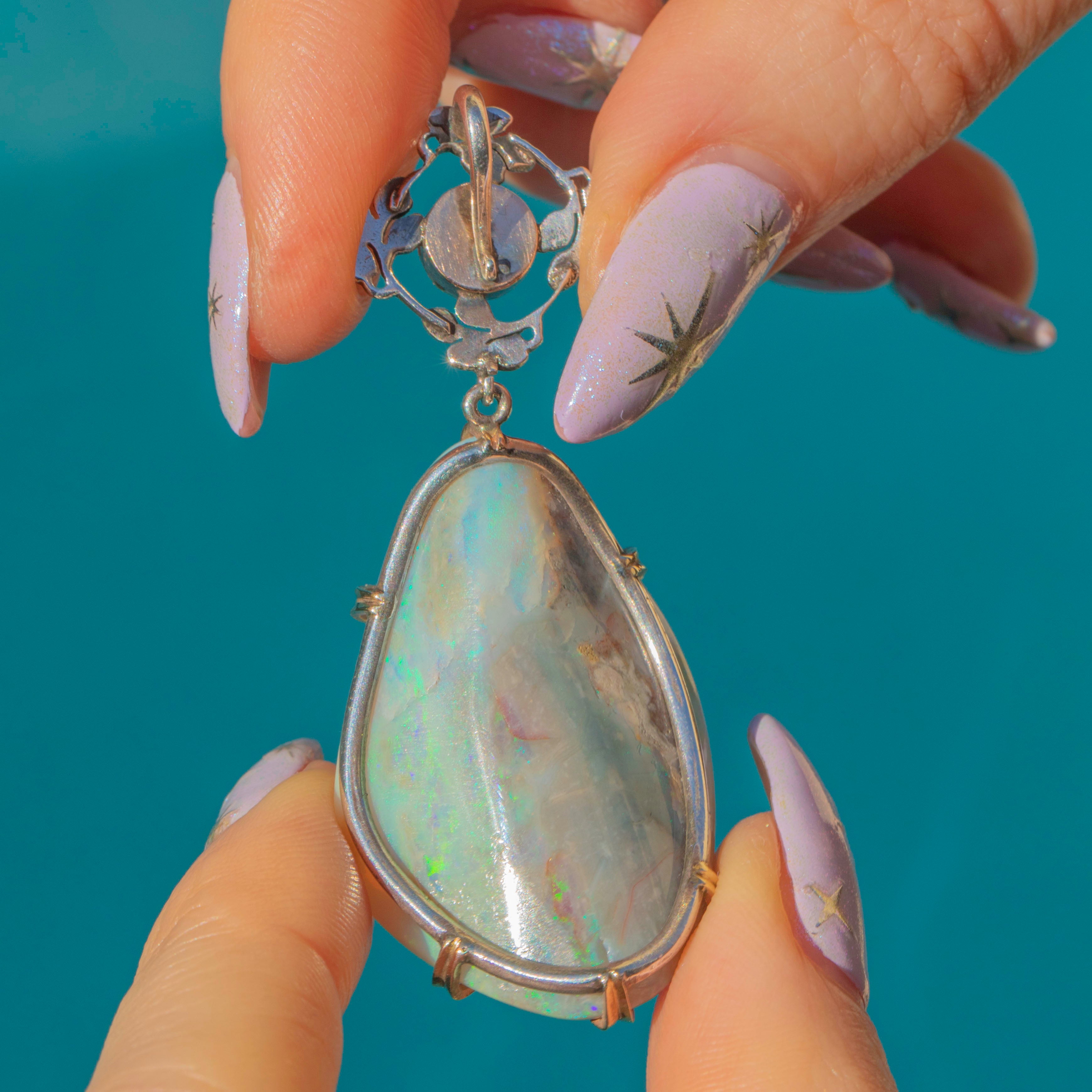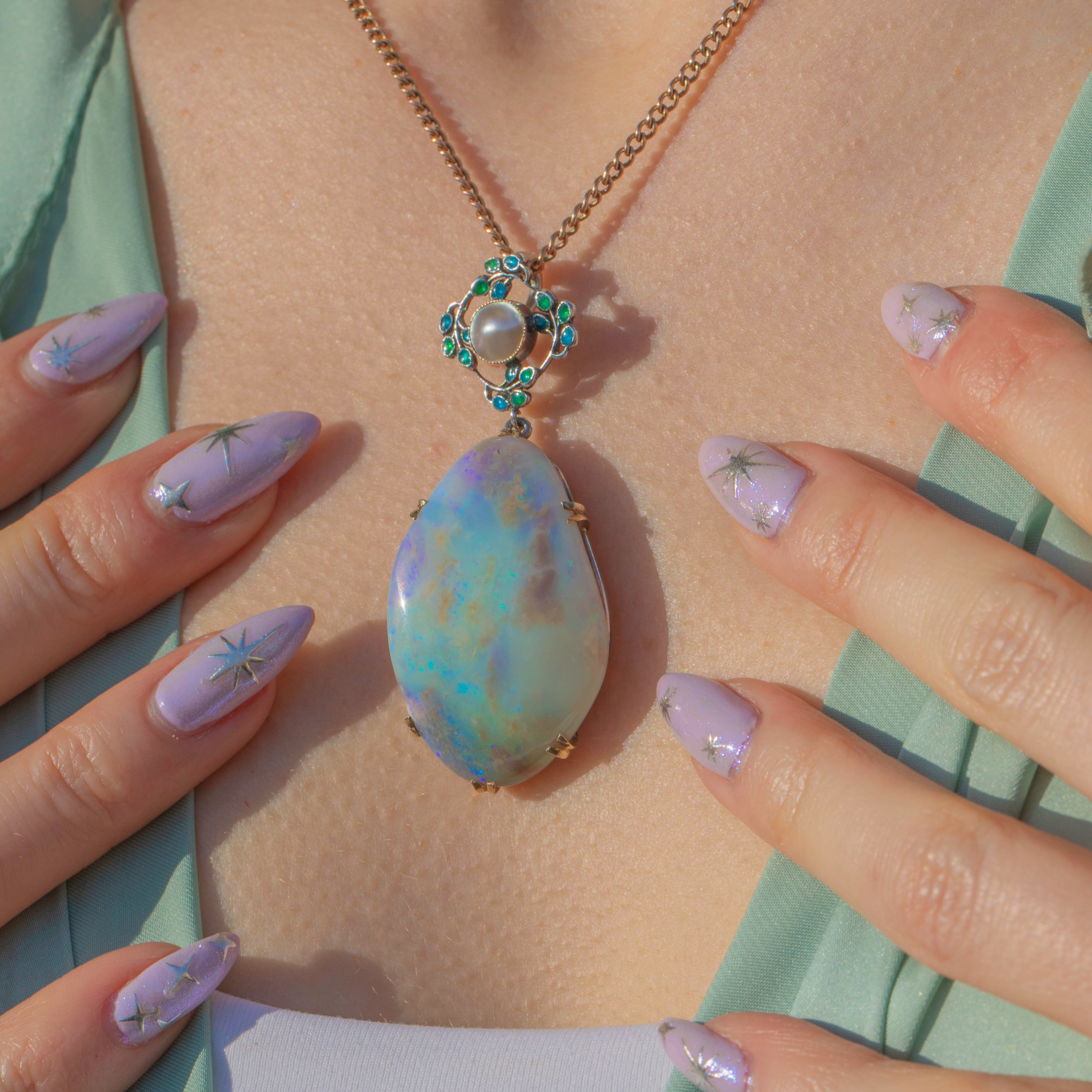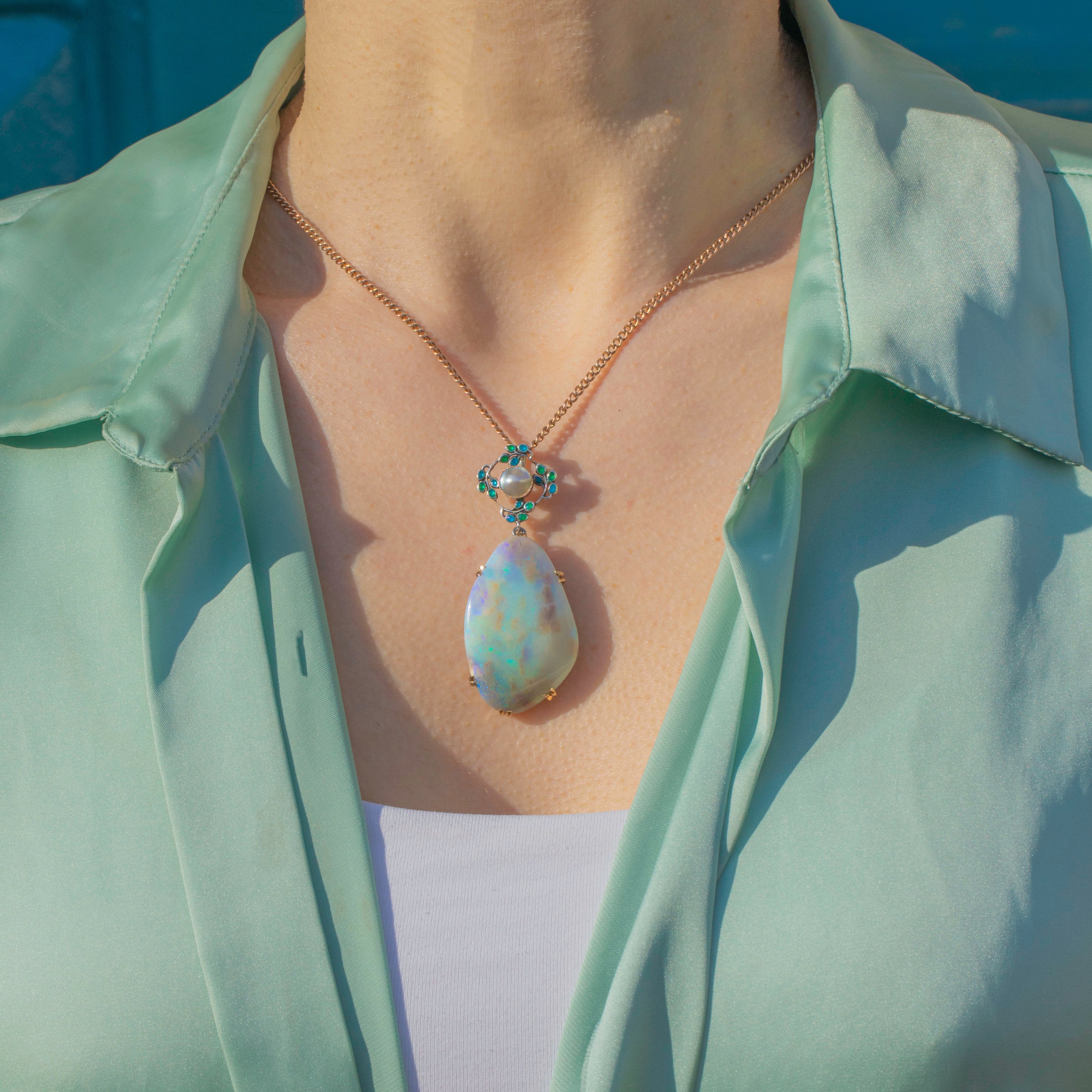 This large Arts & Crafts Enamel Opal pendant boasts a breathtaking 50.00ct boulder Opal, radiating galactic flashes of colour. Resting above this kaleidoscopic Opal is a delicate Mother-of-Pearl accent, adding an ethereal sea shimmer haloed by vibrant green and blue Enamel details, enhancing the pendant’s artistic and natural appeal.