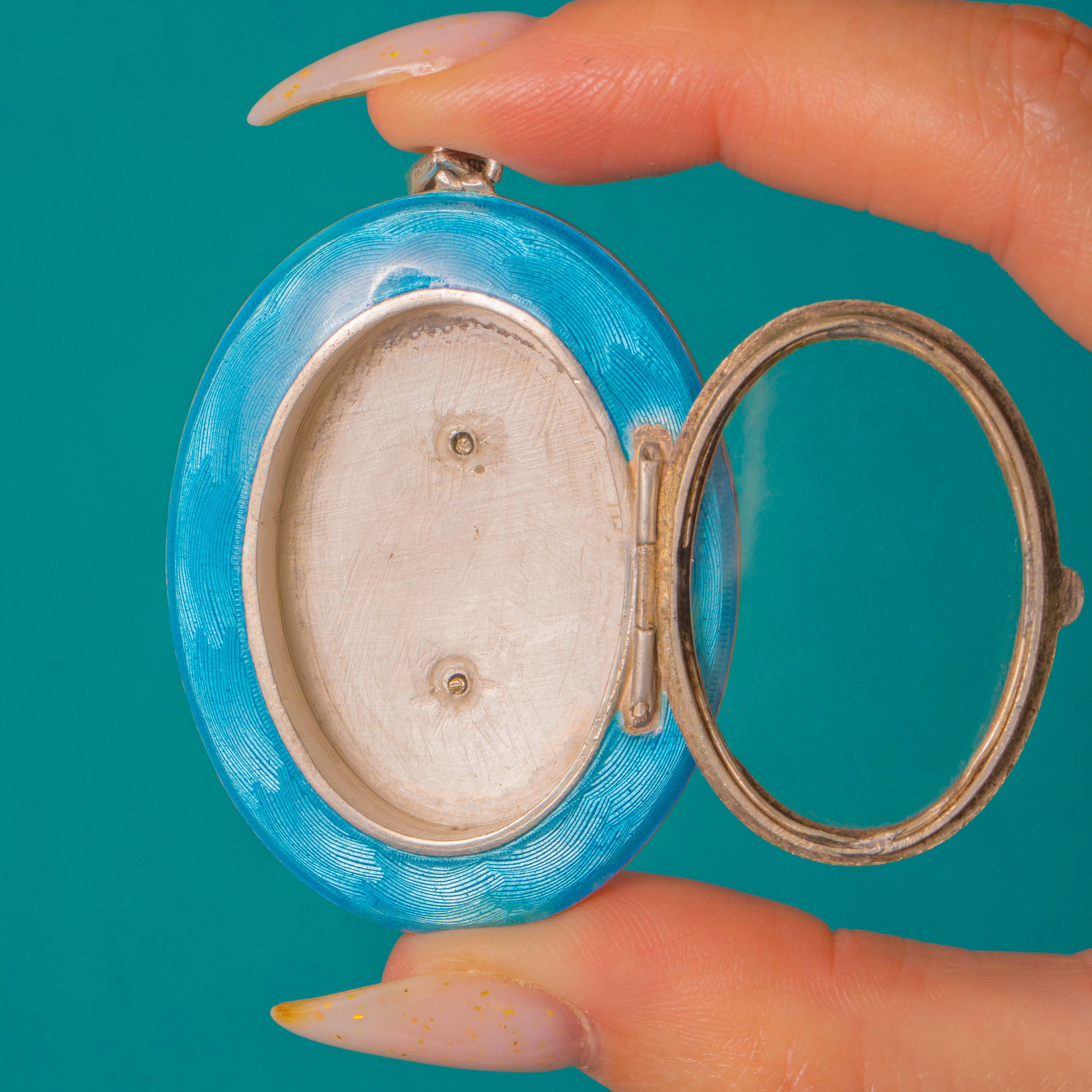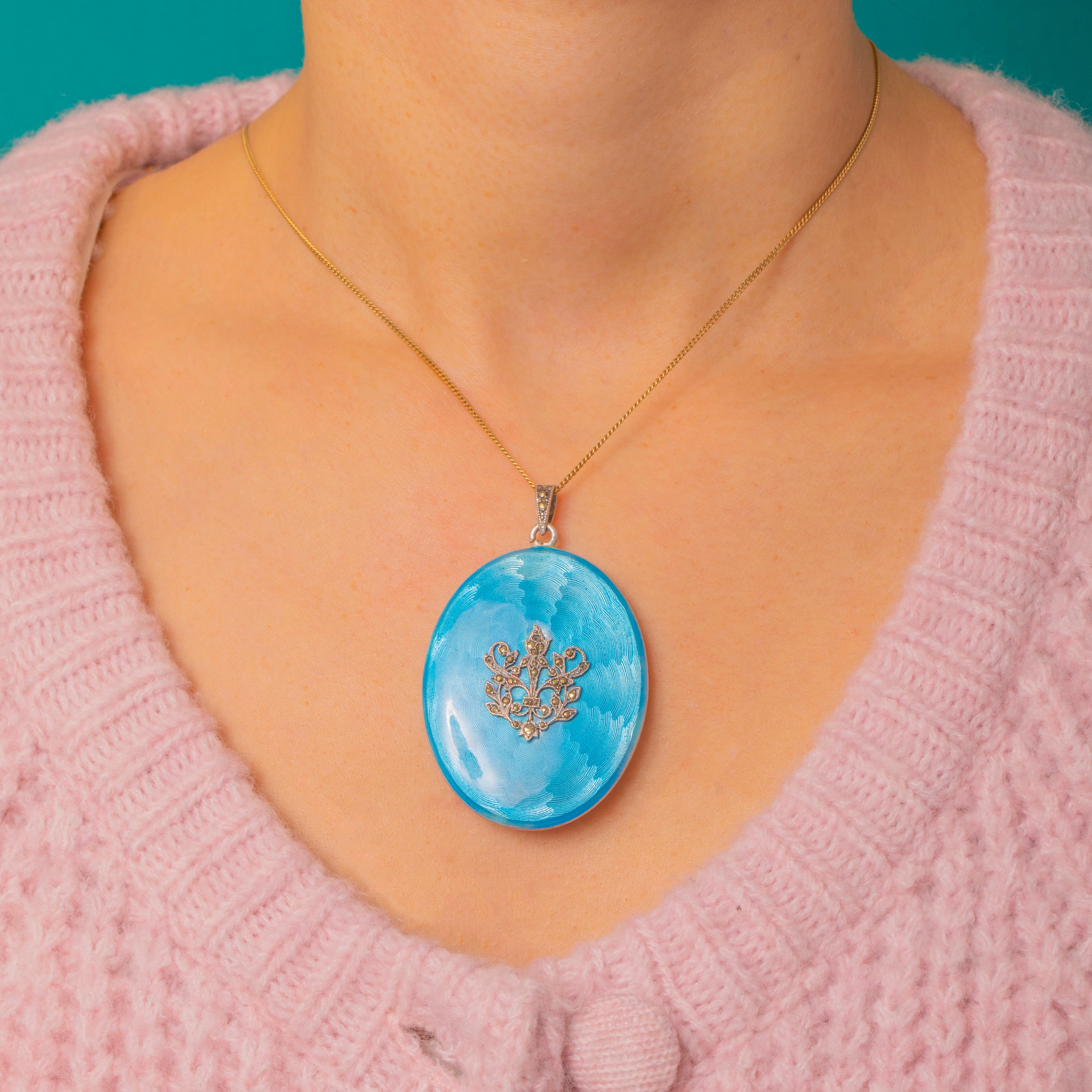 Large Edwardian Silver Baby Blue Enamel Marcasite Locket