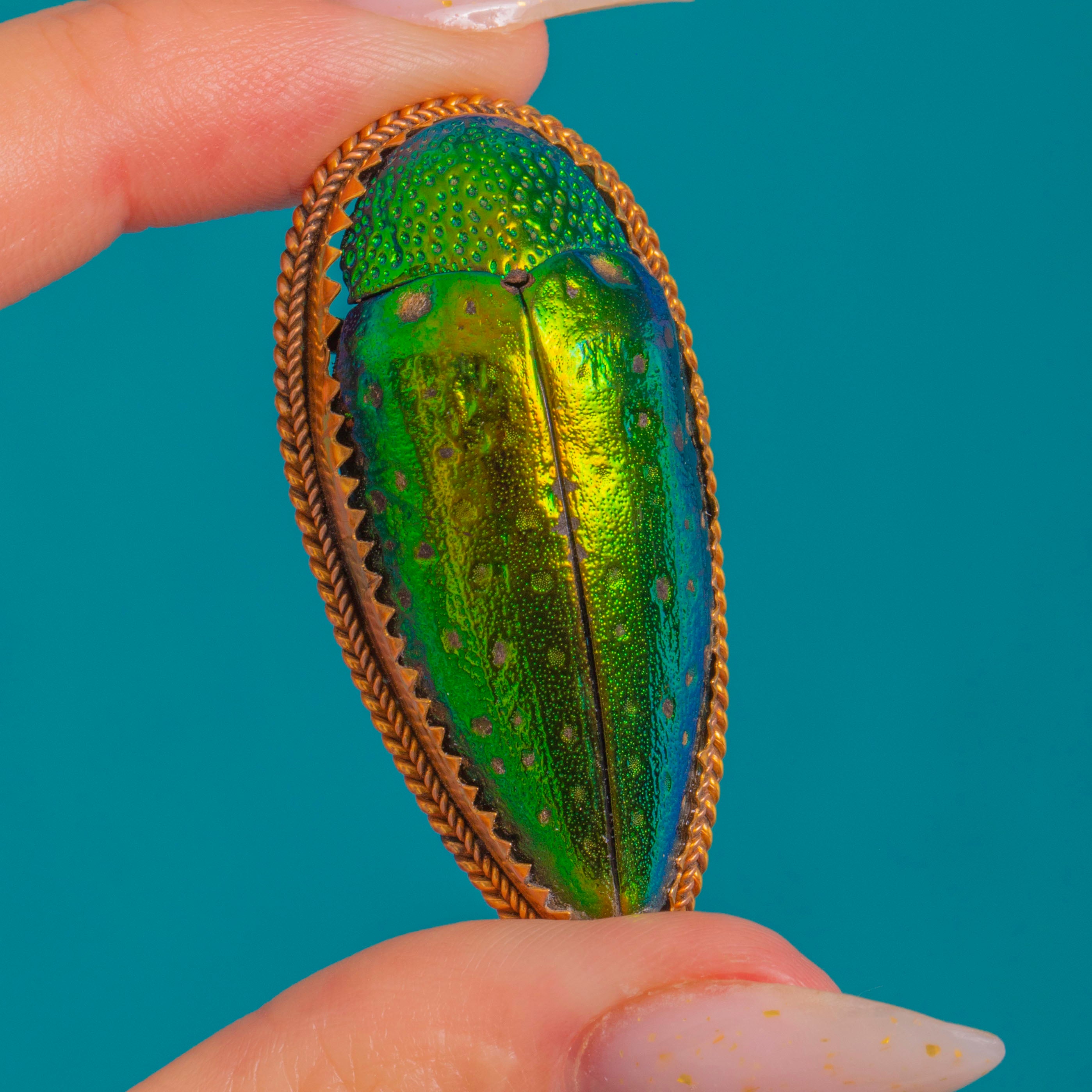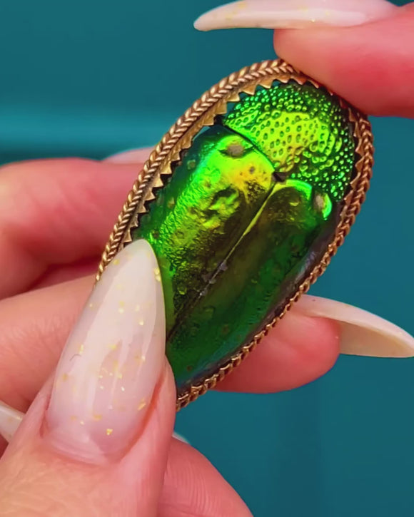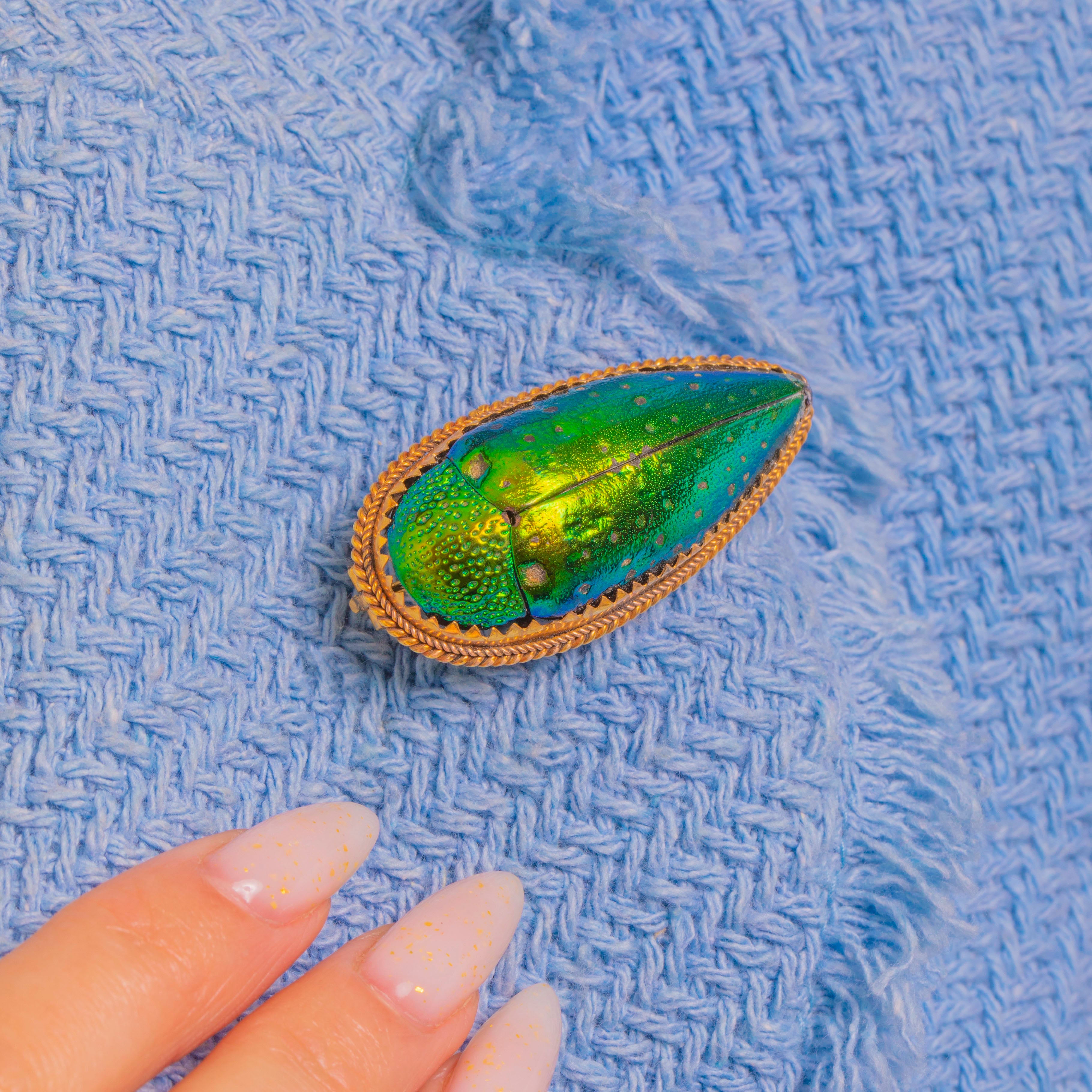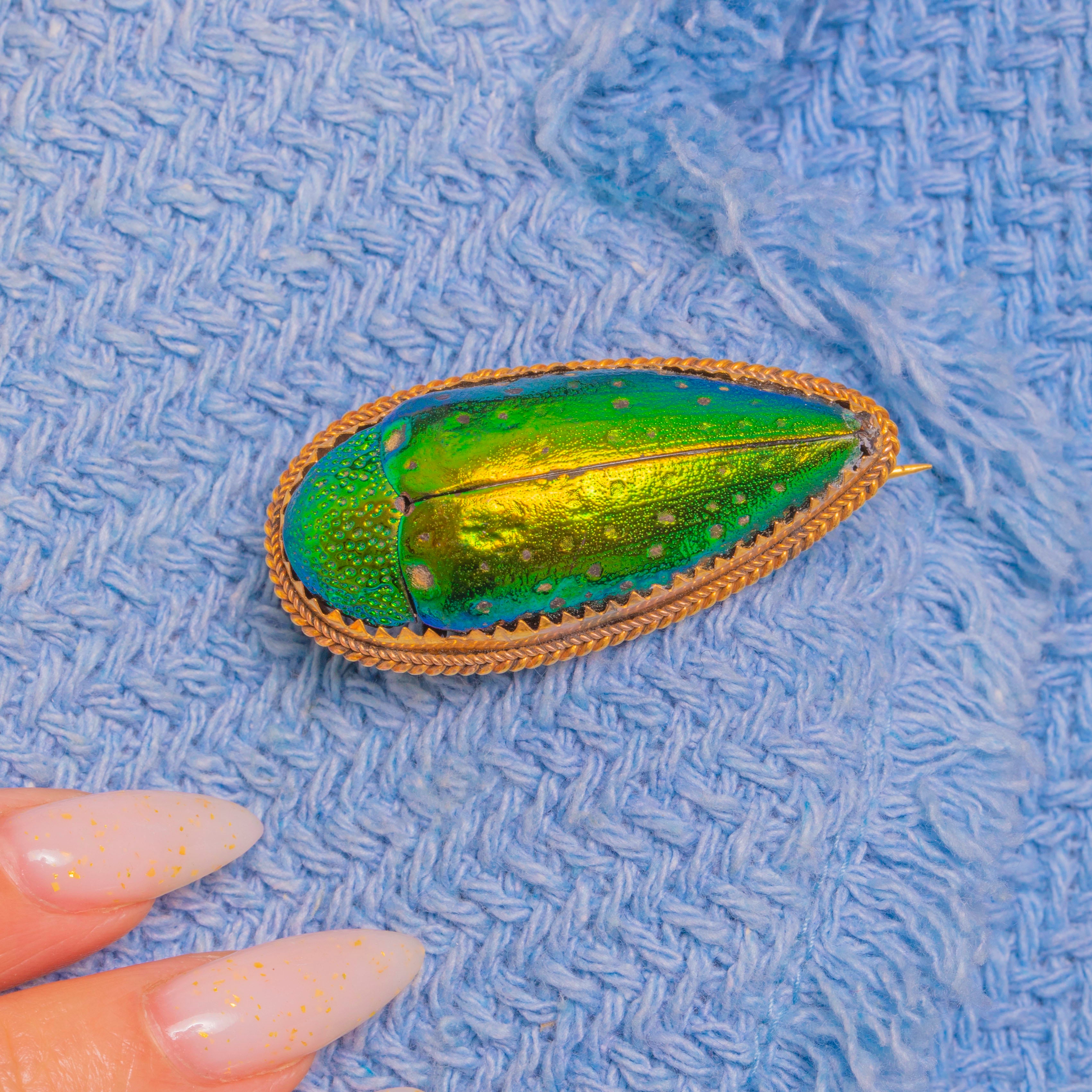 EXCELLENT: The elytra retains bright, even iridescence with only minor surface speckling and faint abrasions visible under close inspection. The 9ct Gold frame and rope‑twist border are crisp with gentle age-related patina; fittings are secure with a slightly bowed pin stem that operates smoothly in the C‑catch. No evidence of later repair, just honest antique wear consistent with age.
