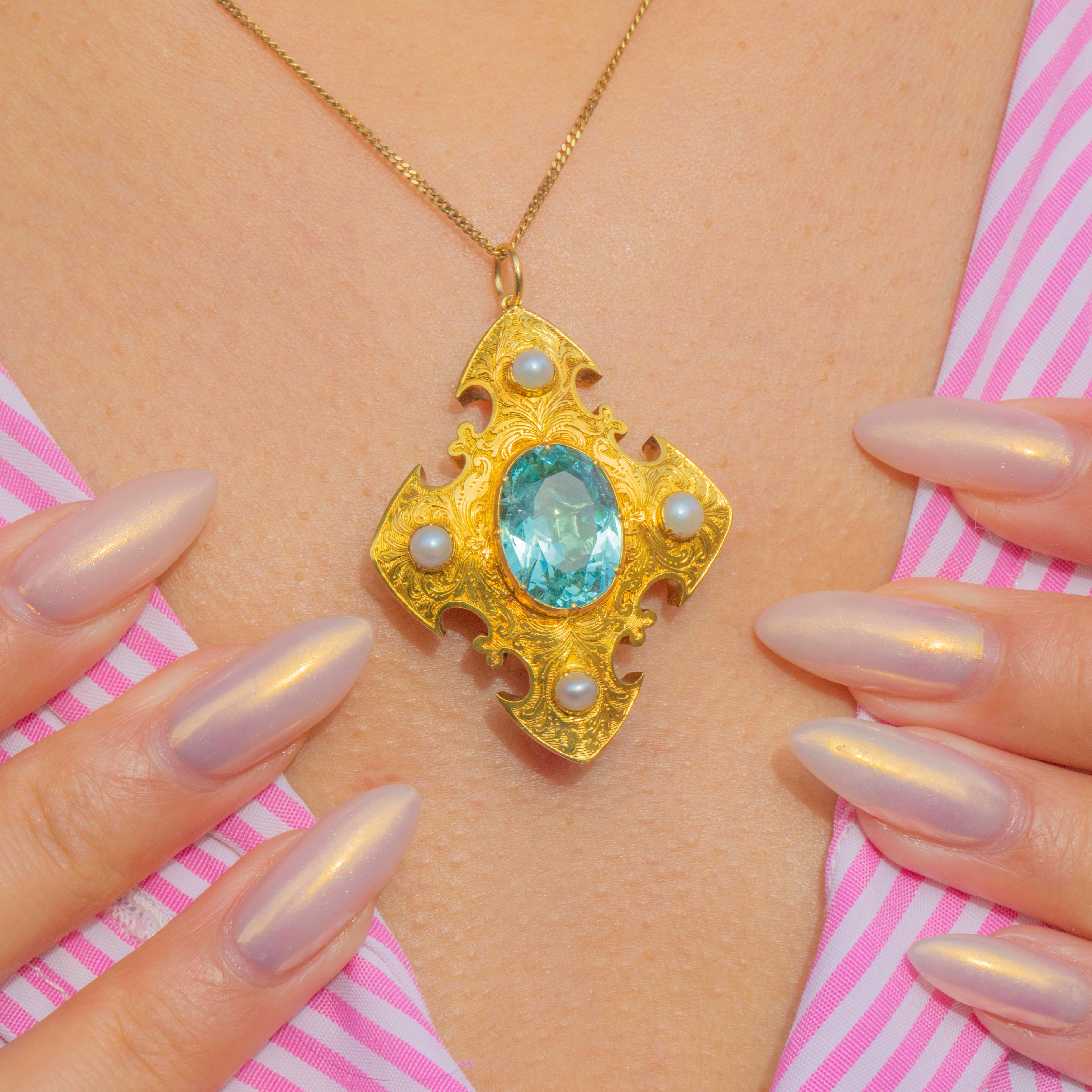EXCELLENT: The Aquamarine is bright and beautifully preserved, with no chips or surface wear visible. The Pearls retain a fine lustre, and the Gold engraving remains crisp and detailed. Overall, this pendant has been extremely well cared for and survives in remarkable condition for its age.