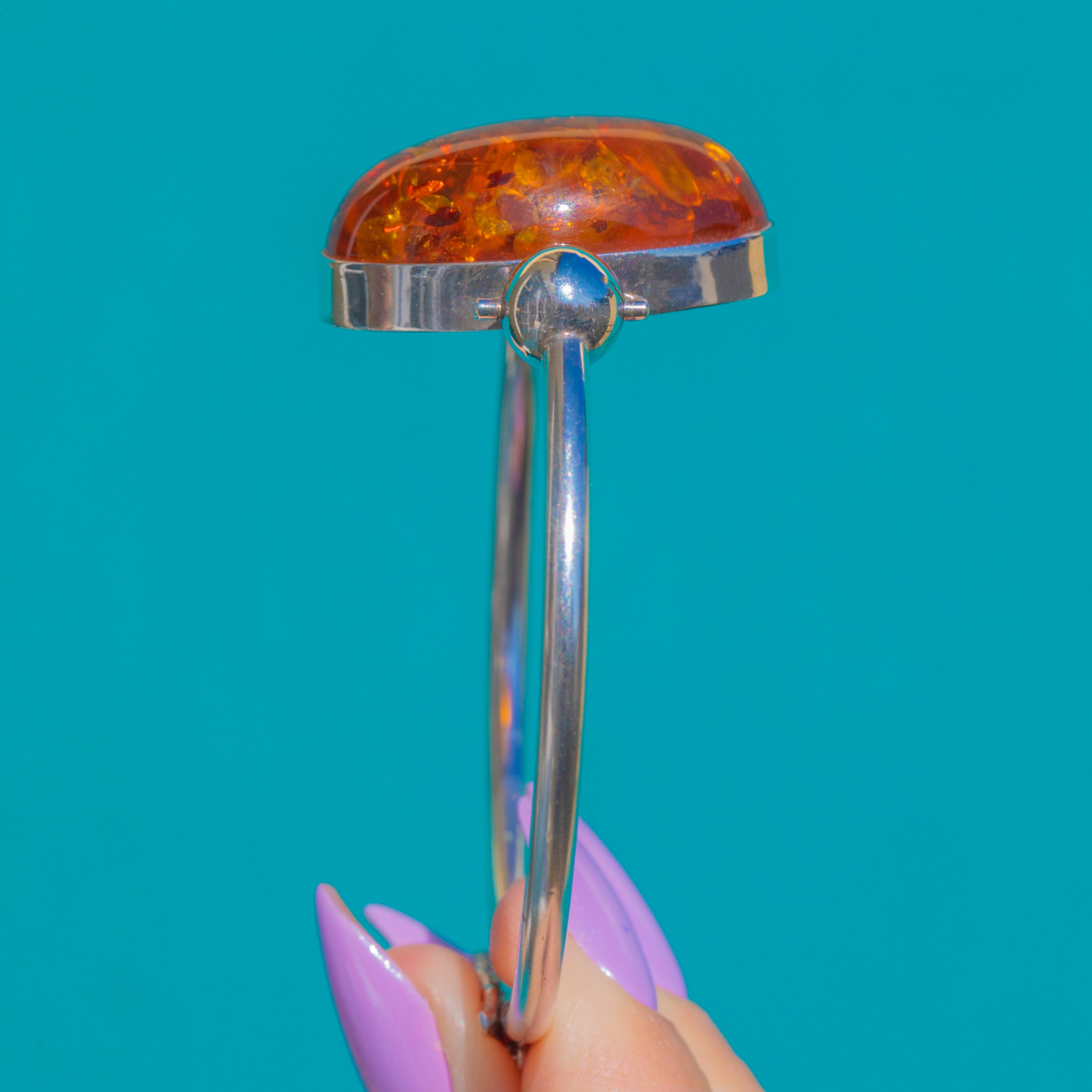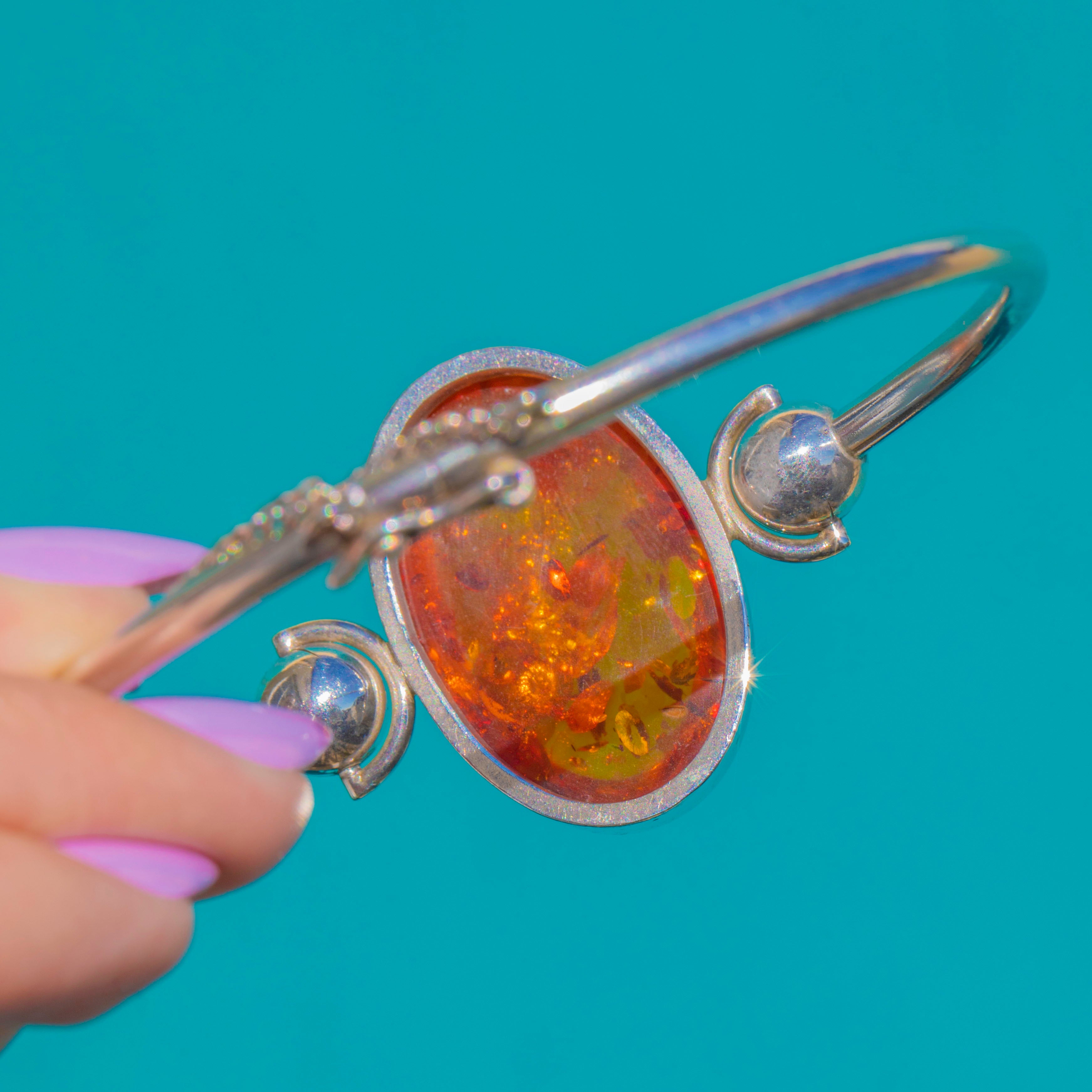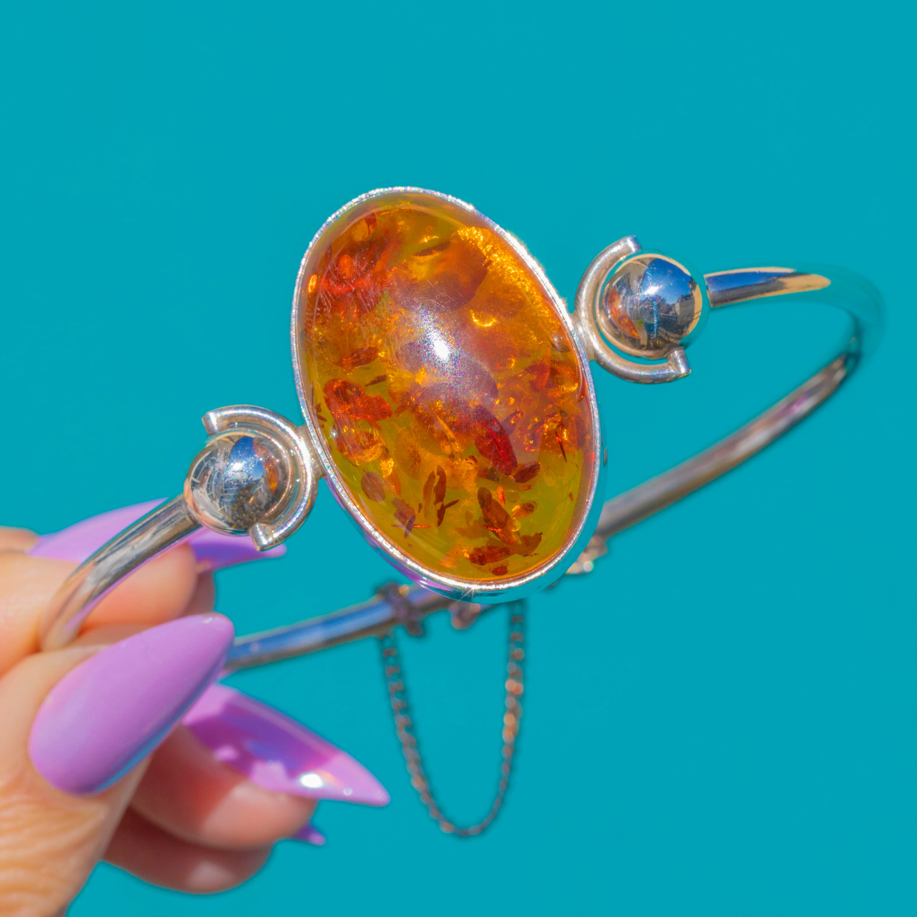 Glowing with rich honey-to-cognac tones, this Vintage 1990s bangle showcases a large high-domed Baltic Amber cabochon set in sleek Sterling Silver. The closed bezel frames the Amber’s natural inclusions and subtle iridescent flashes beautifully, creating a dramatic single-stone focal point.