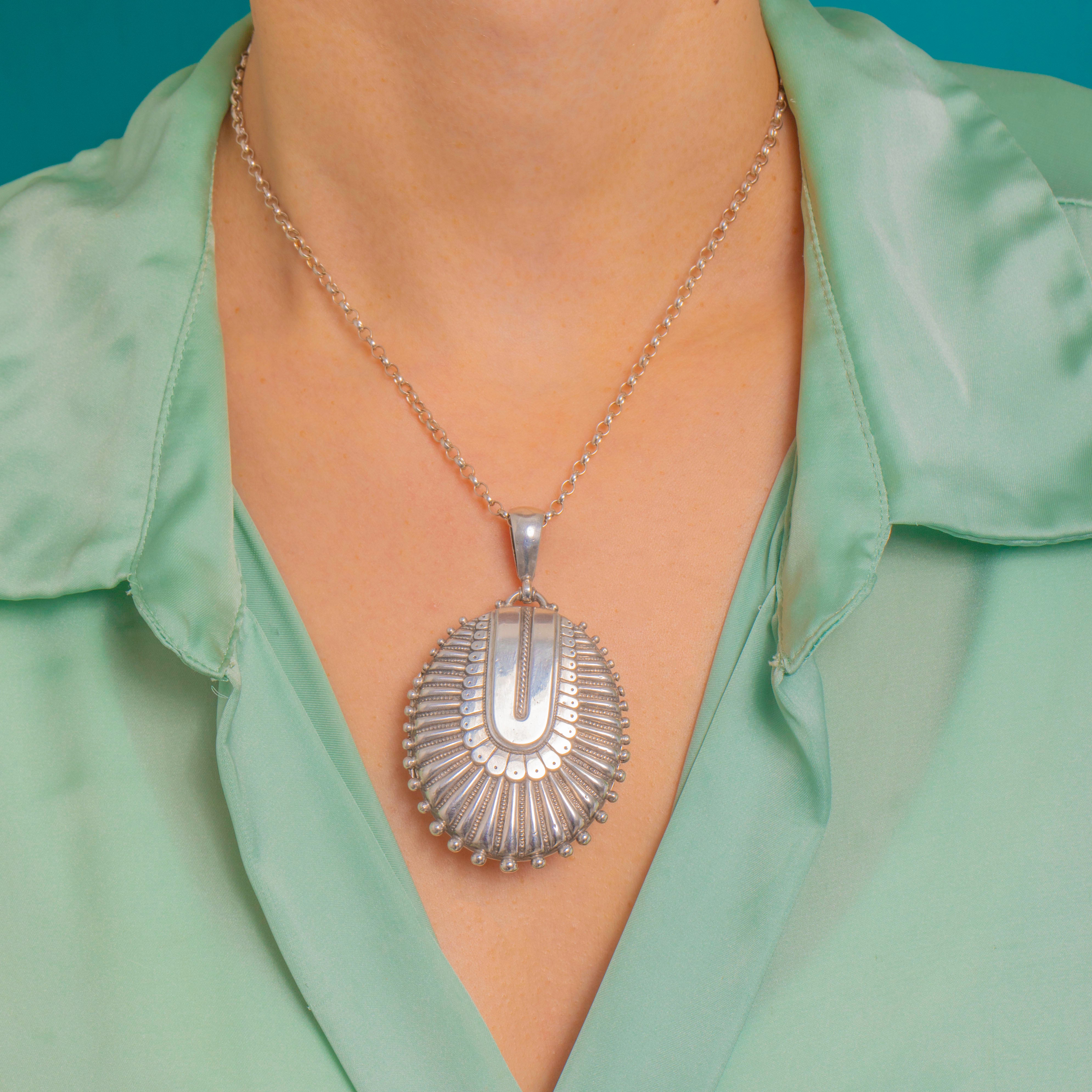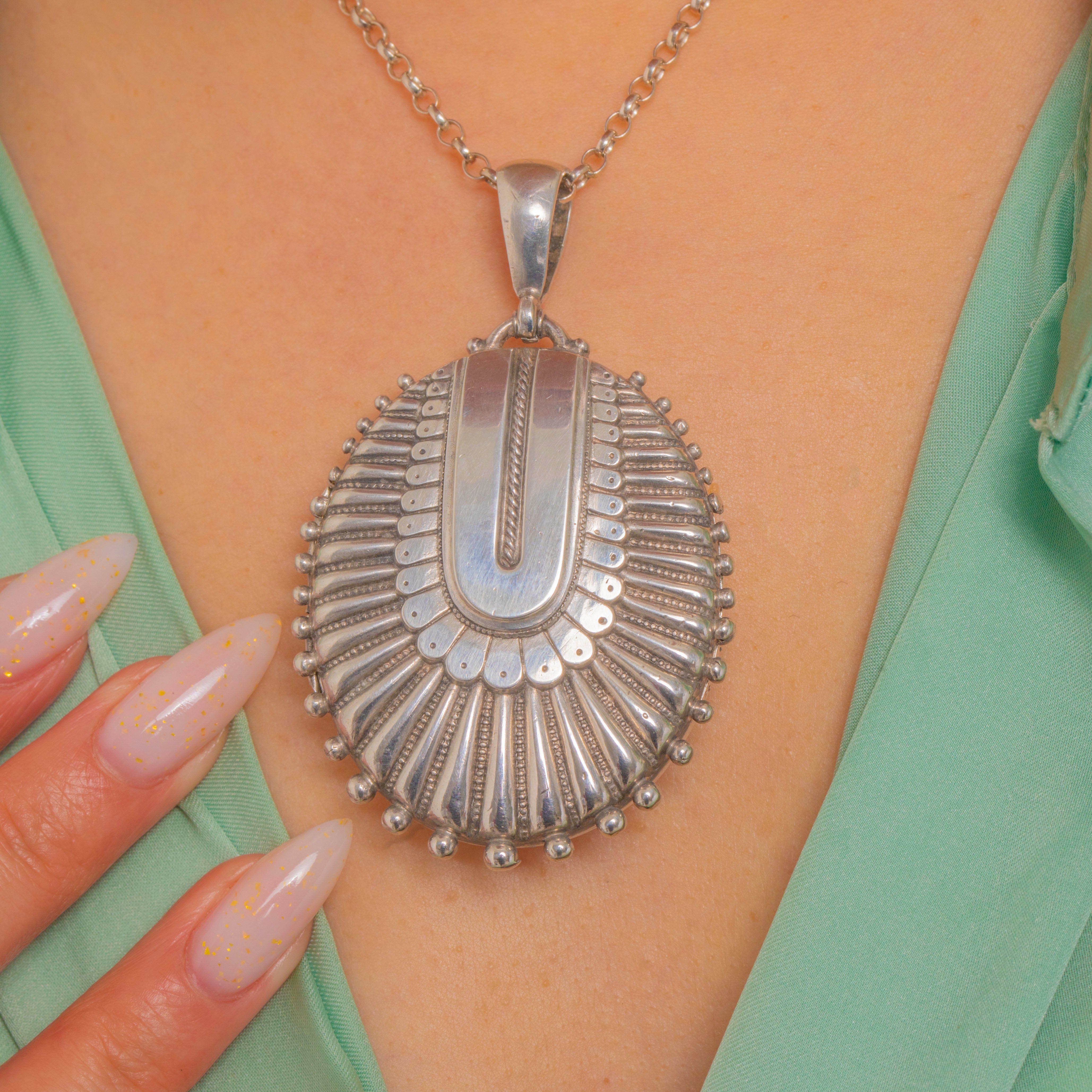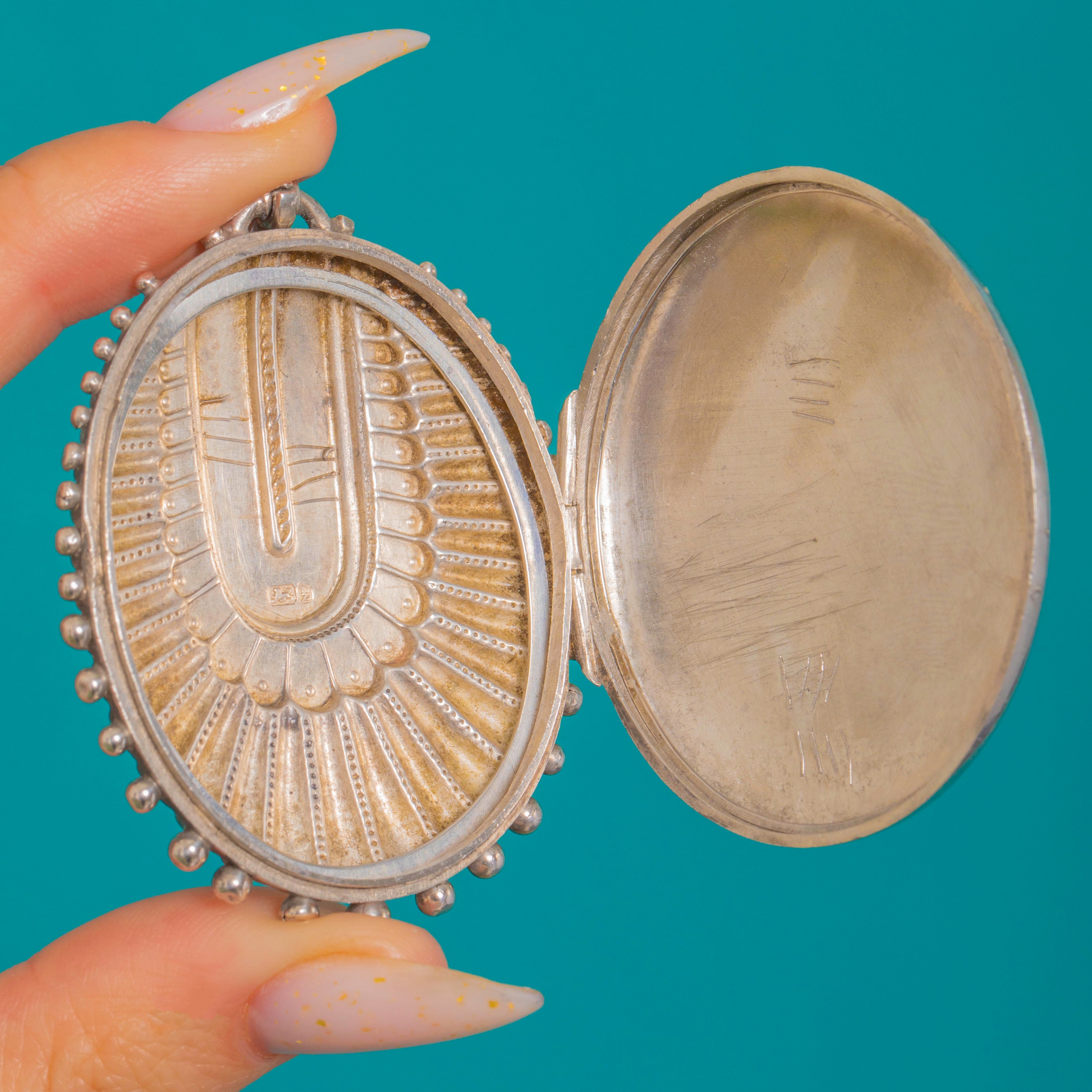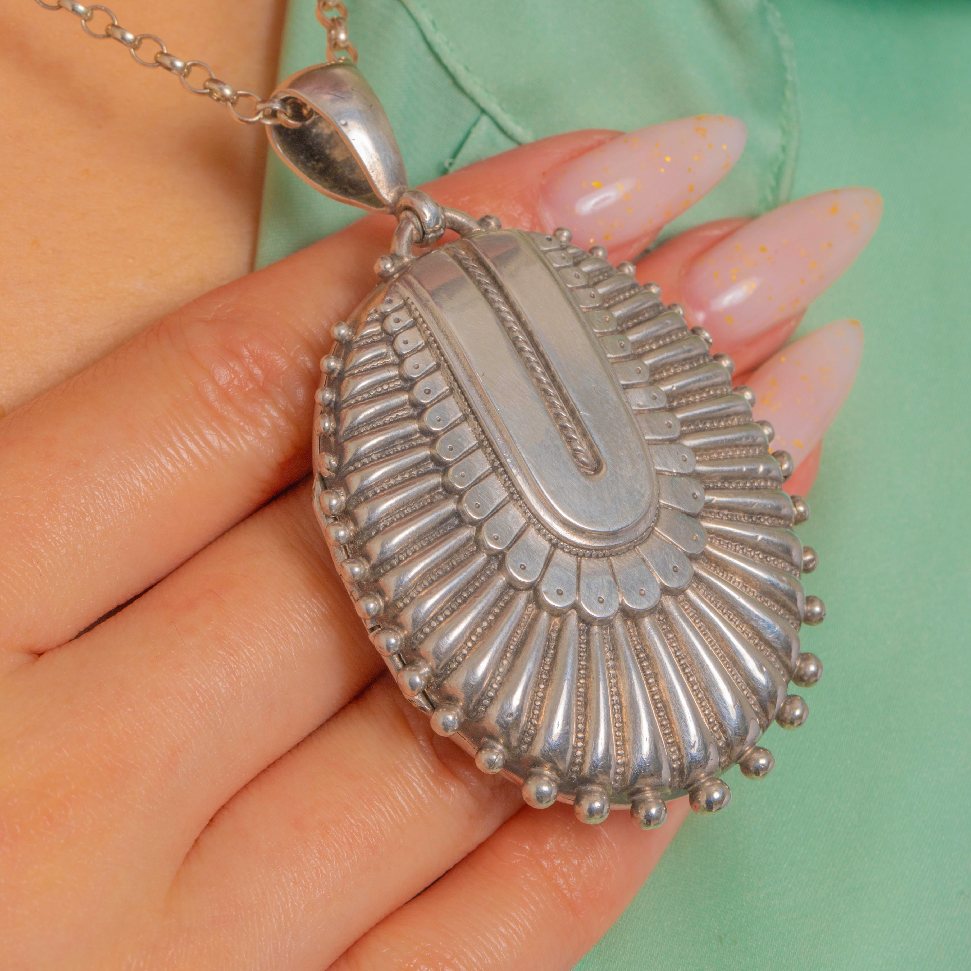 A bold and beautifully tactile Victorian locket, made in the Aesthetic era and decorated with crisp, architectural embossing. The front is all about texture and shine, with radiating panels and a beaded edge that catches the light from every angle.