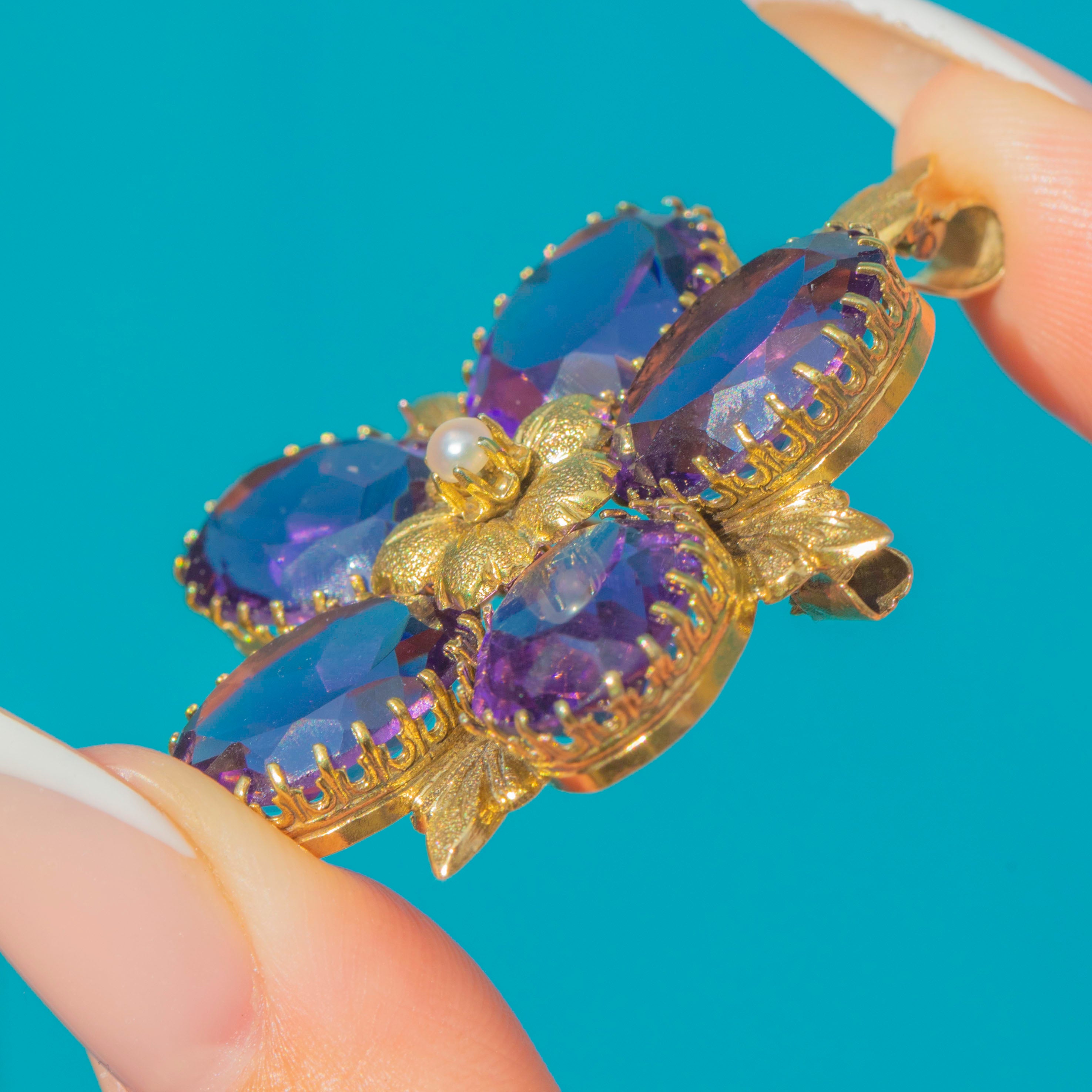 The design is textbook late-19th century — botanical, detailed and unapologetically decorative. The pin mechanism is made in metal for strength and durability while the visible surfaces retain the original gold bloom. This is a statement example of Victorian gem work, with excellent colour in the Amethysts and a delicate natural Pearl at the heart of the blossom.