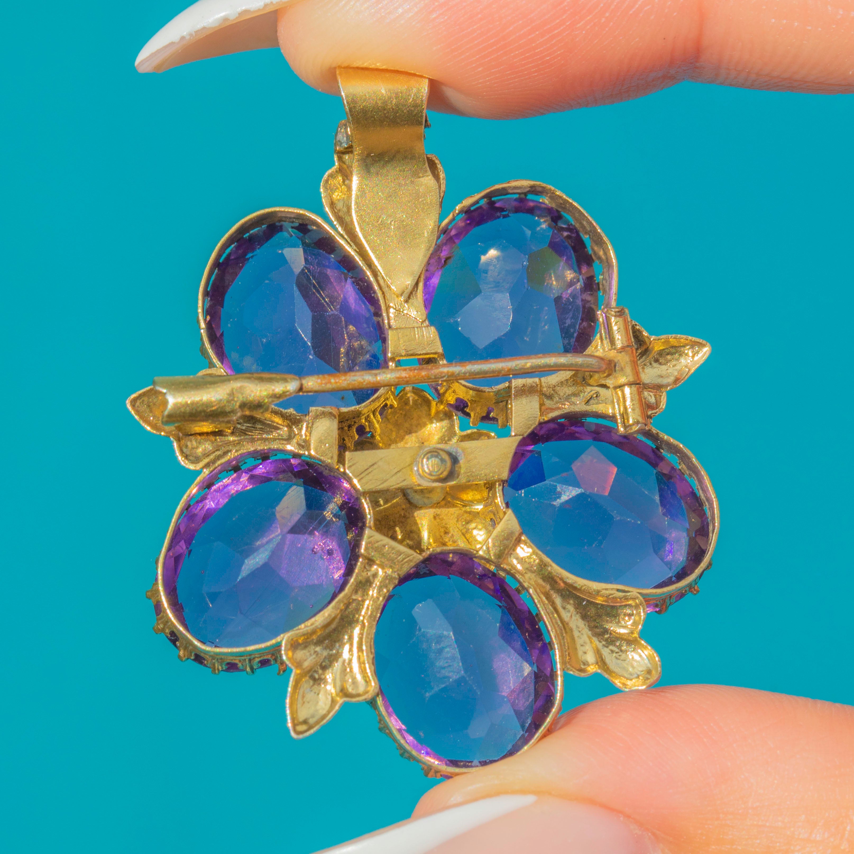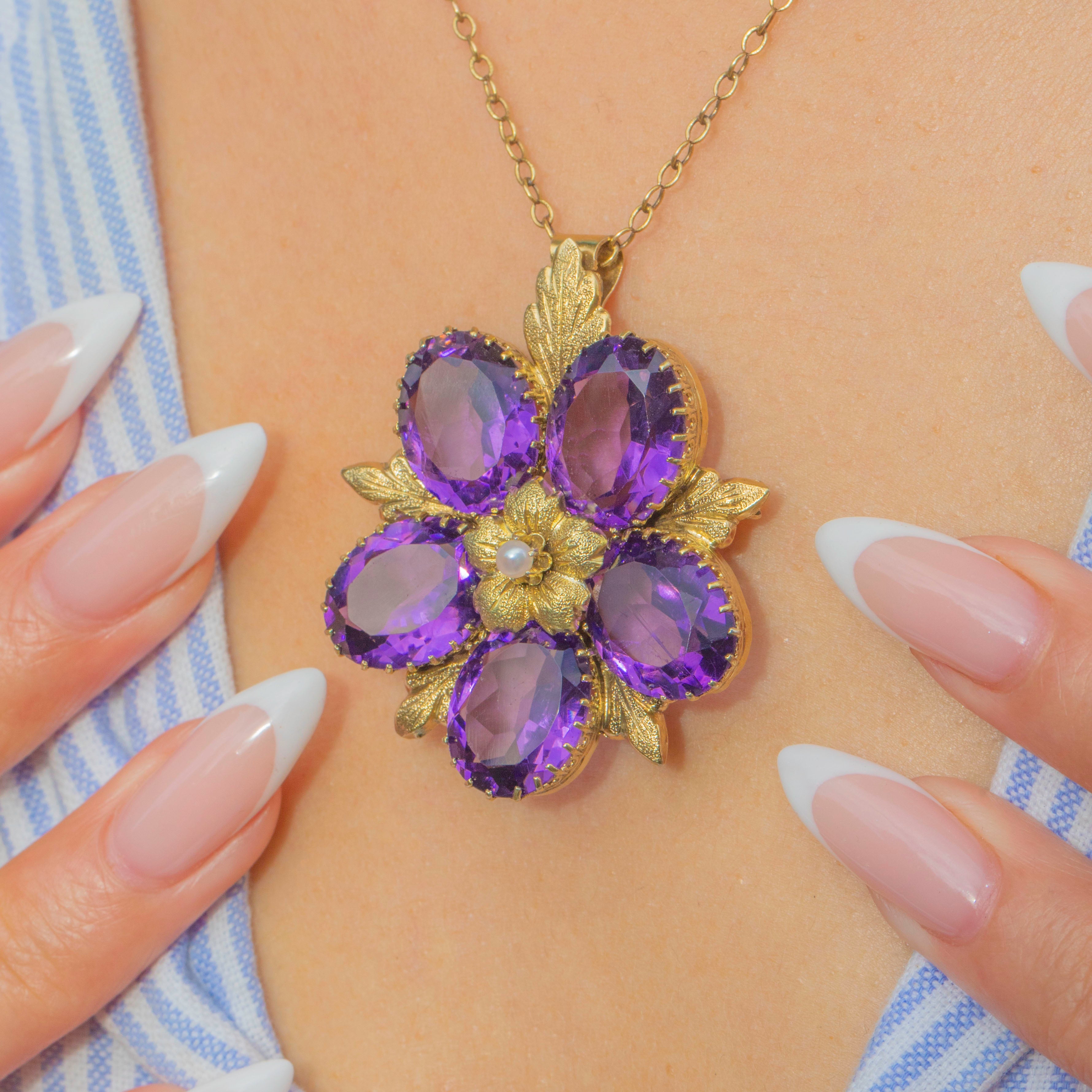 A sumptuous Victorian pendant-brooch, crafted into a striking floral cluster of deep, faceted Amethysts around a shimmering natural Pearl. The five oval Amethysts sit in textured, leaf borders over a Sterling Silver frame that has been richly gilded with 18ct Gold to give the piece the warm, burnished look. The piece comes complete with brooch fittings so it wears beautifully as a pendant on a chain or pinned to a lapel.