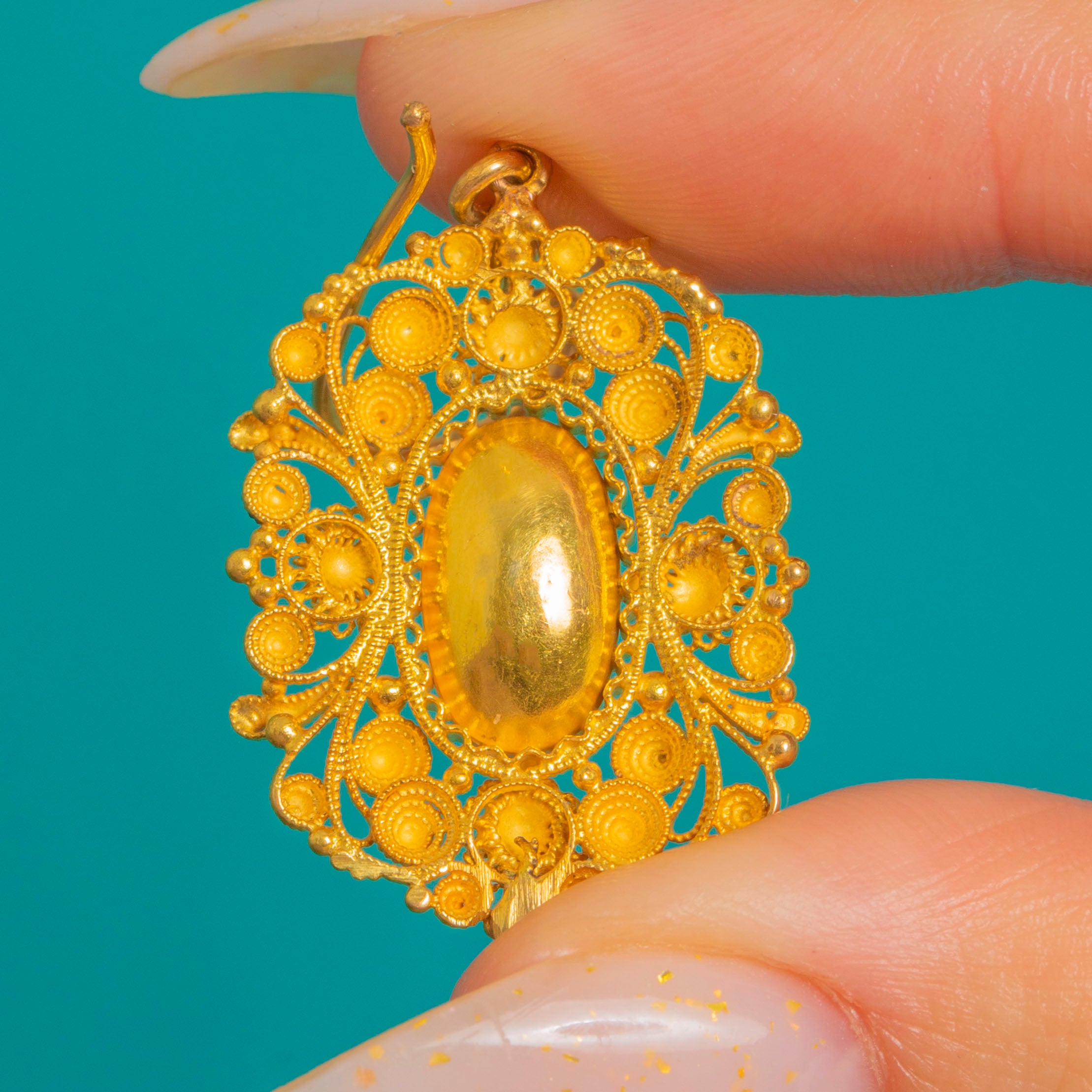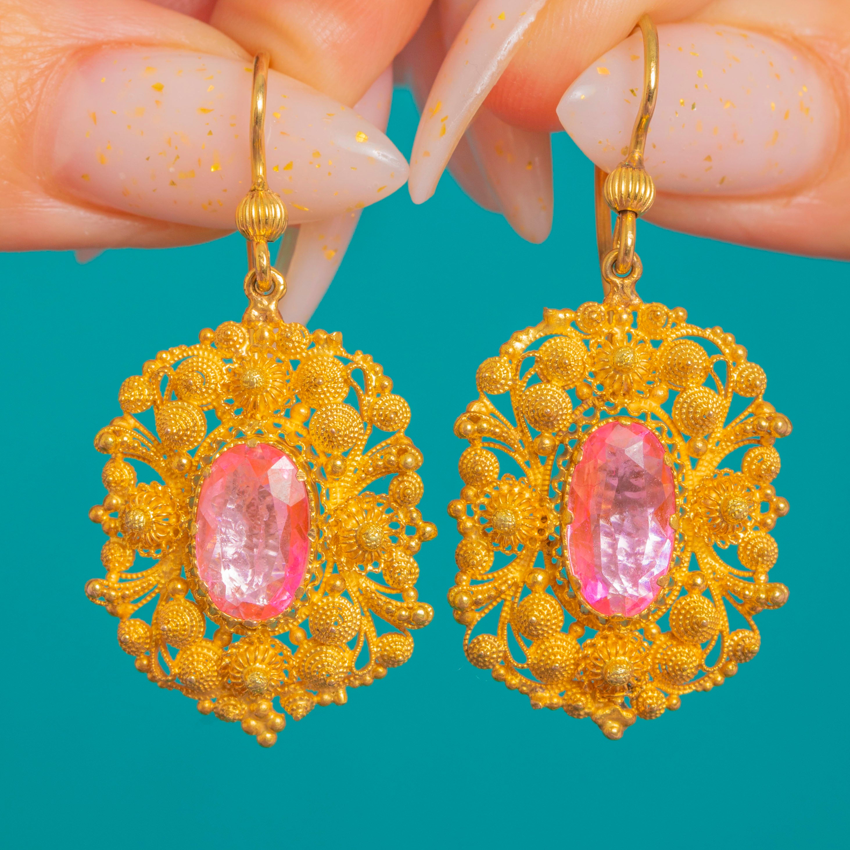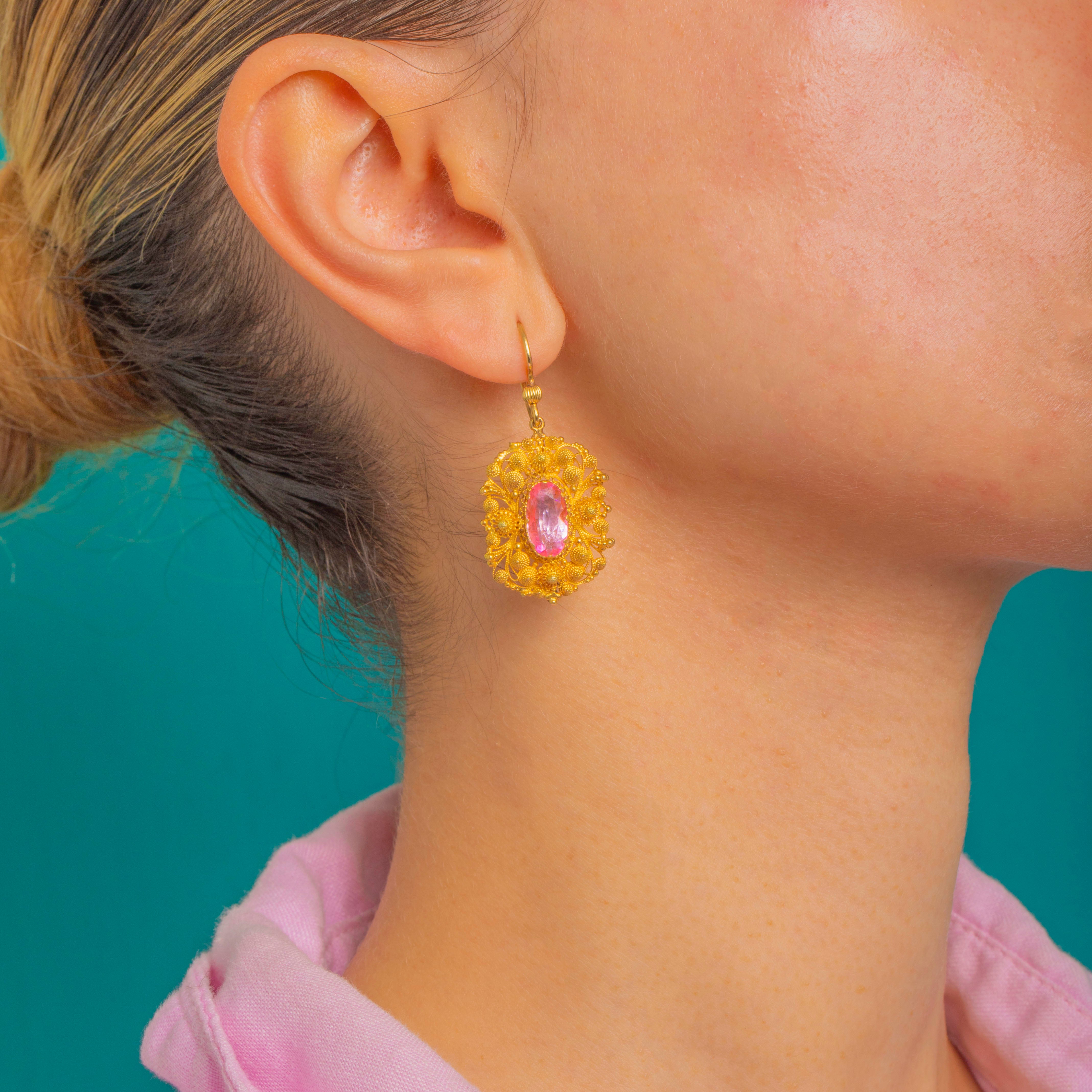 Lacy, luminous and wonderfully romantic, these Late Georgian cannetille drop earrings showcase vibrant foiled Pink Topaz in richly hued Gold. The oval stones glow in their beaded bezel settings, framed by an intricate tapestry of coiled wire, rosette clusters and tiny granules that dance with the light.