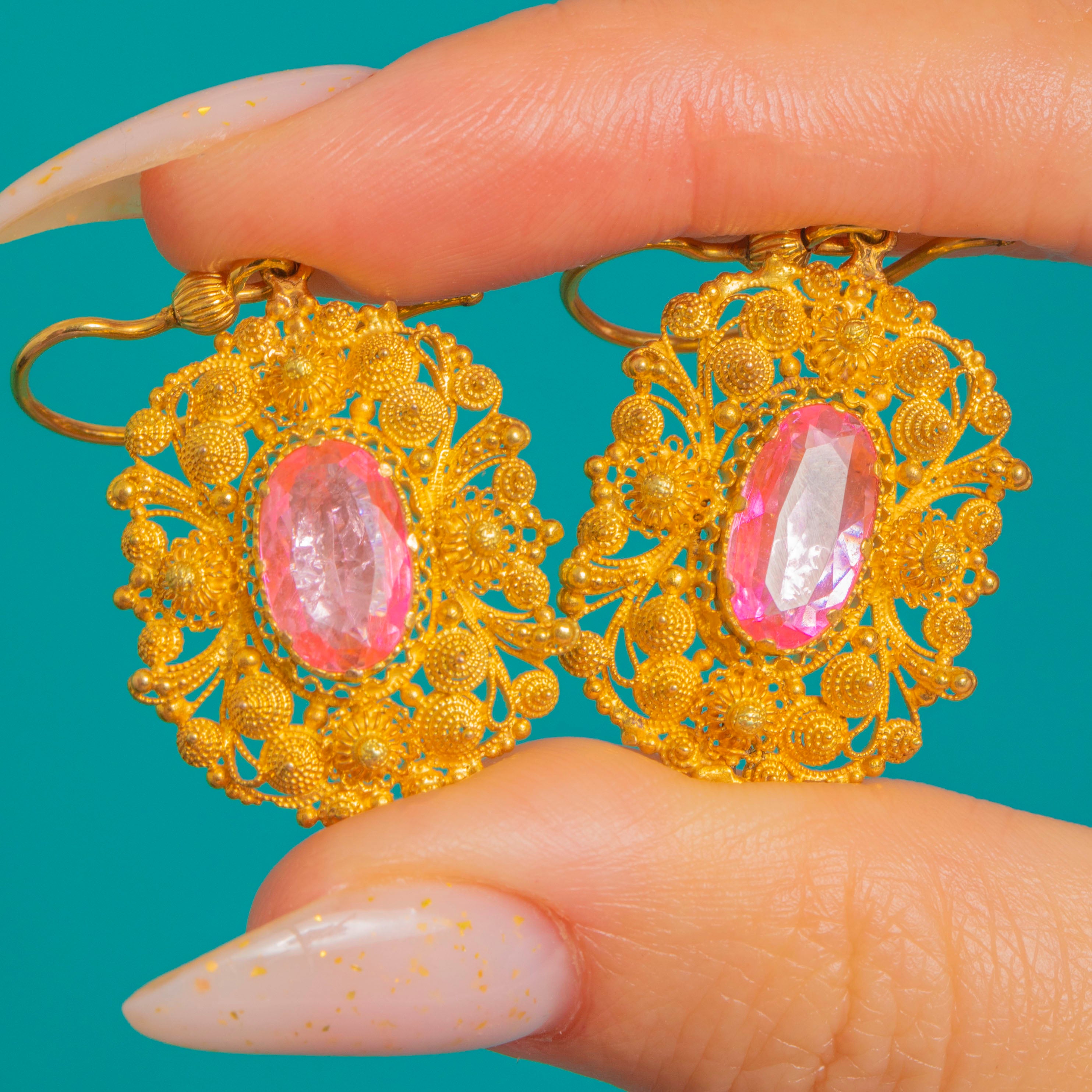 EXCELLENT: The Pink Topaz are bright with minor facet wear commensurate with age, visible under magnification. The cannetille Goldwork is crisp and intact with a gentle, age-appropriate patina; all applied wire and rosette details present and secure. Hooks are robust and function perfectly, with no visible repairs.