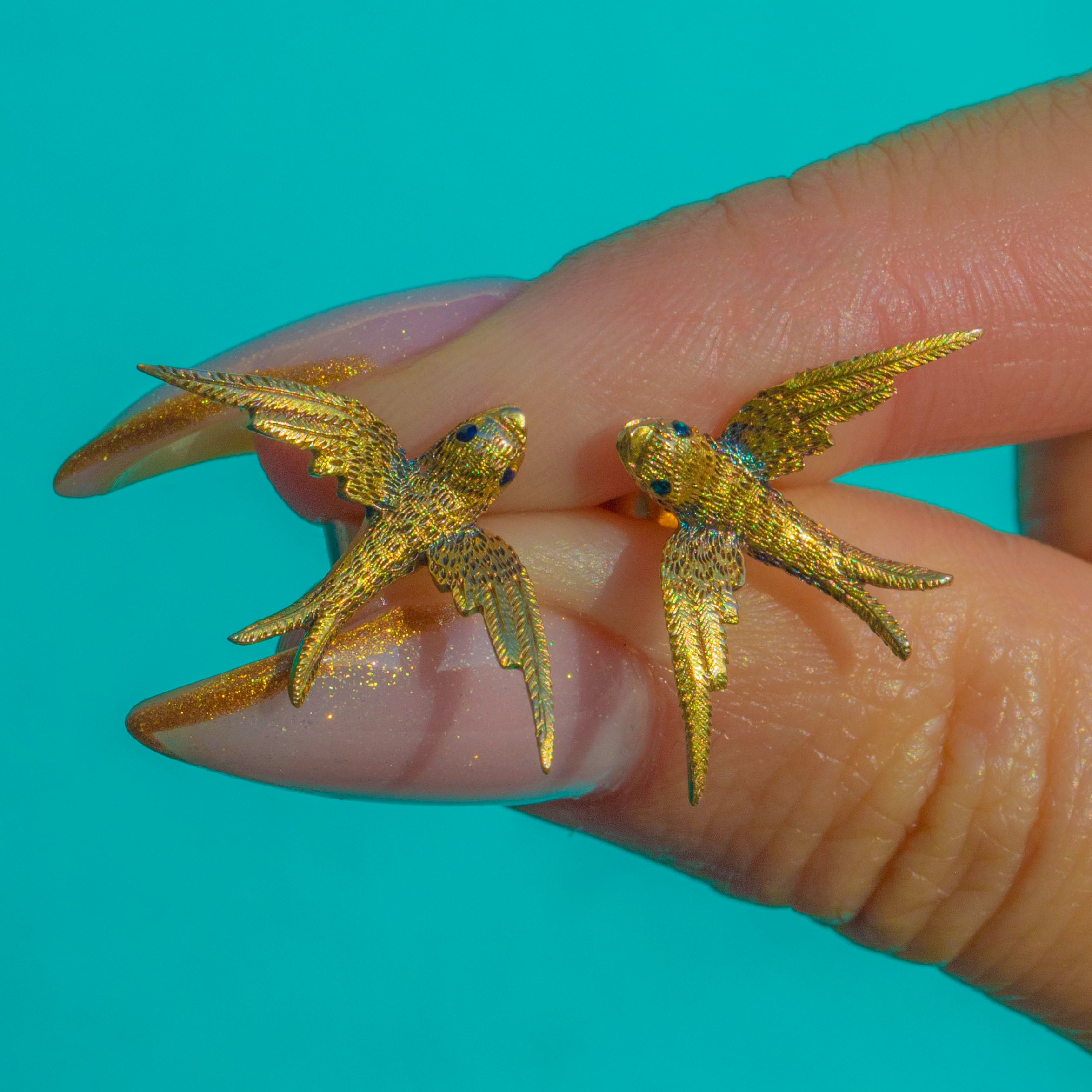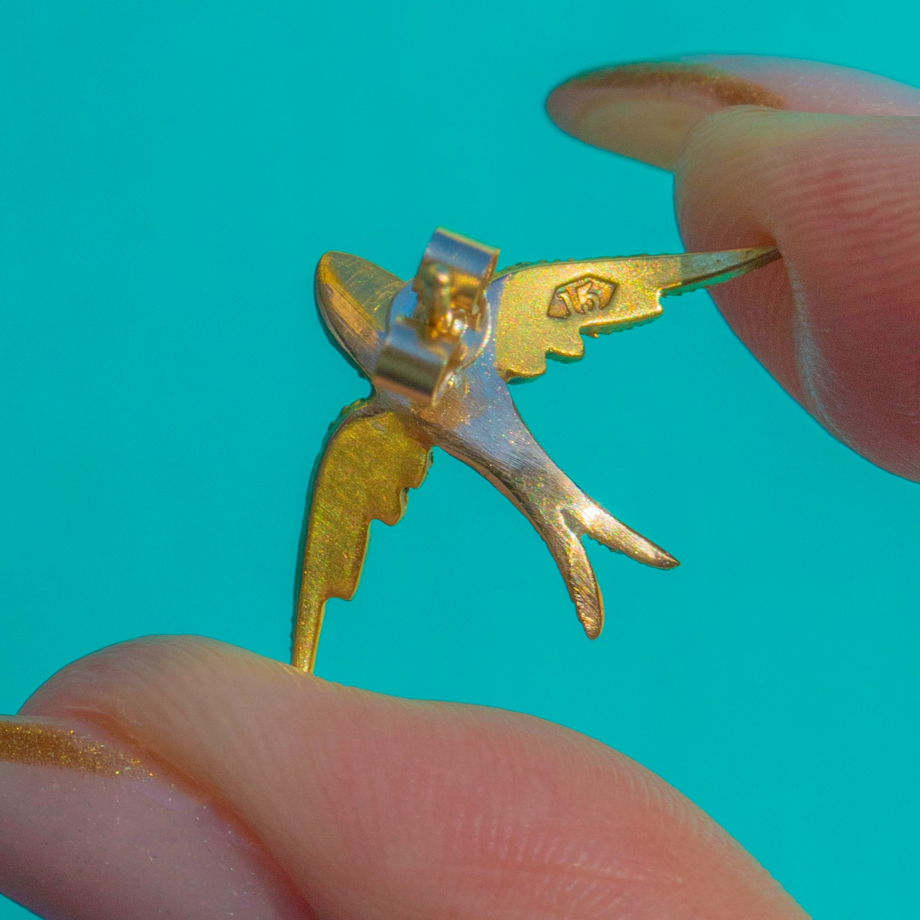 VERY GOOD: The Gold swallows remain nicely defined with crisp feather detailing and a lovely antique patina. The surfaces show light wear and a few tiny marks commensurate with age, visible on close inspection only. The posts and backs are secure, and the earrings are in very good, ready to wear condition.