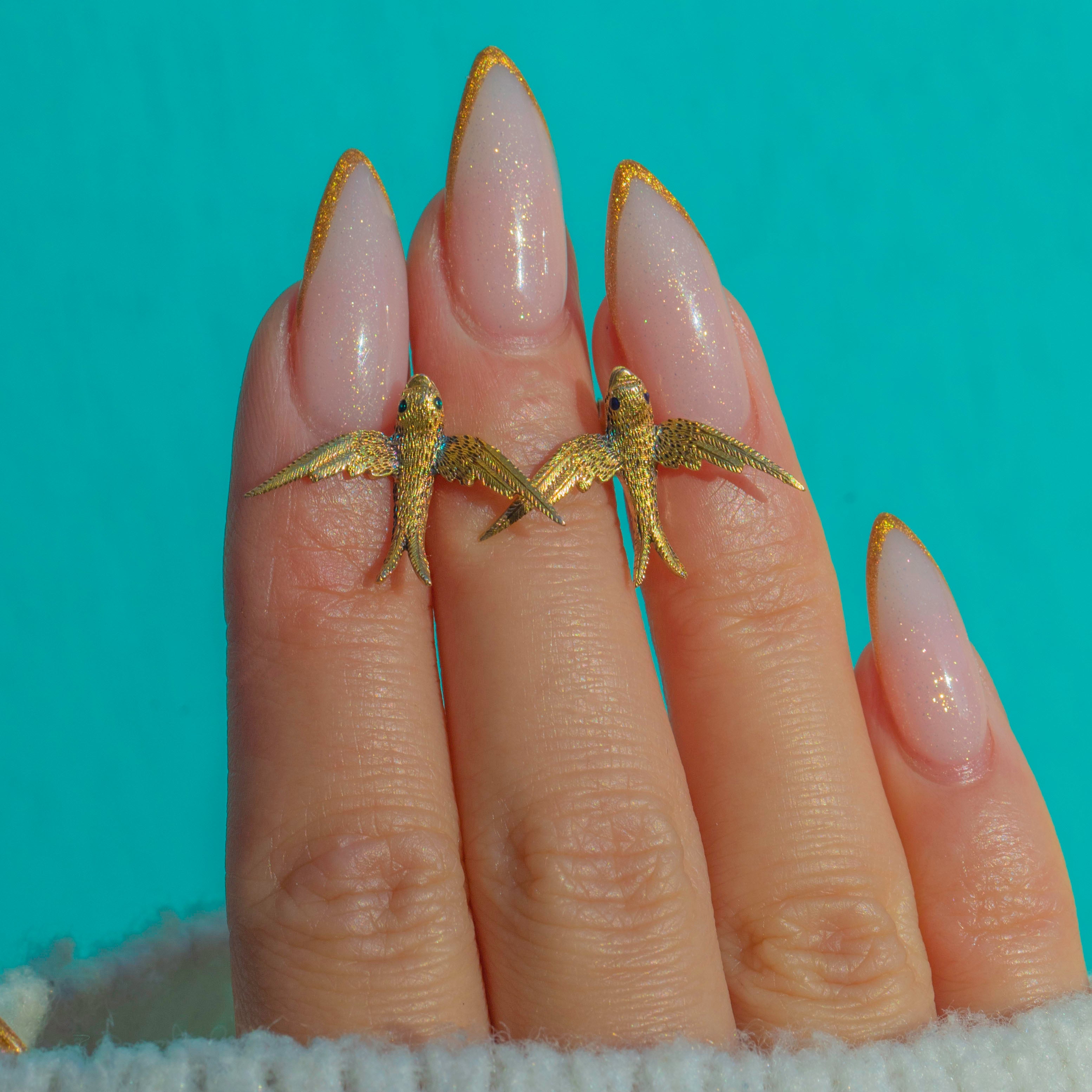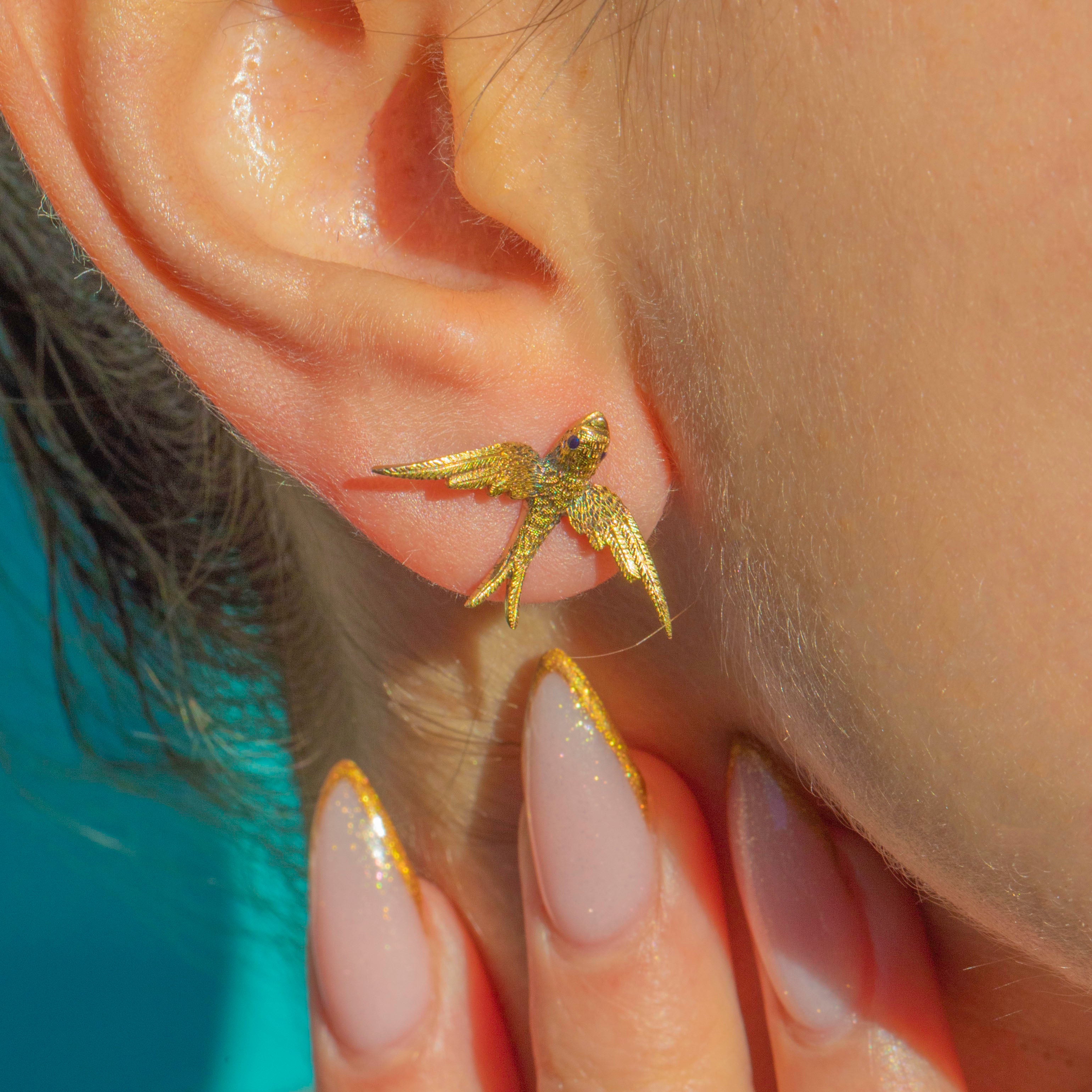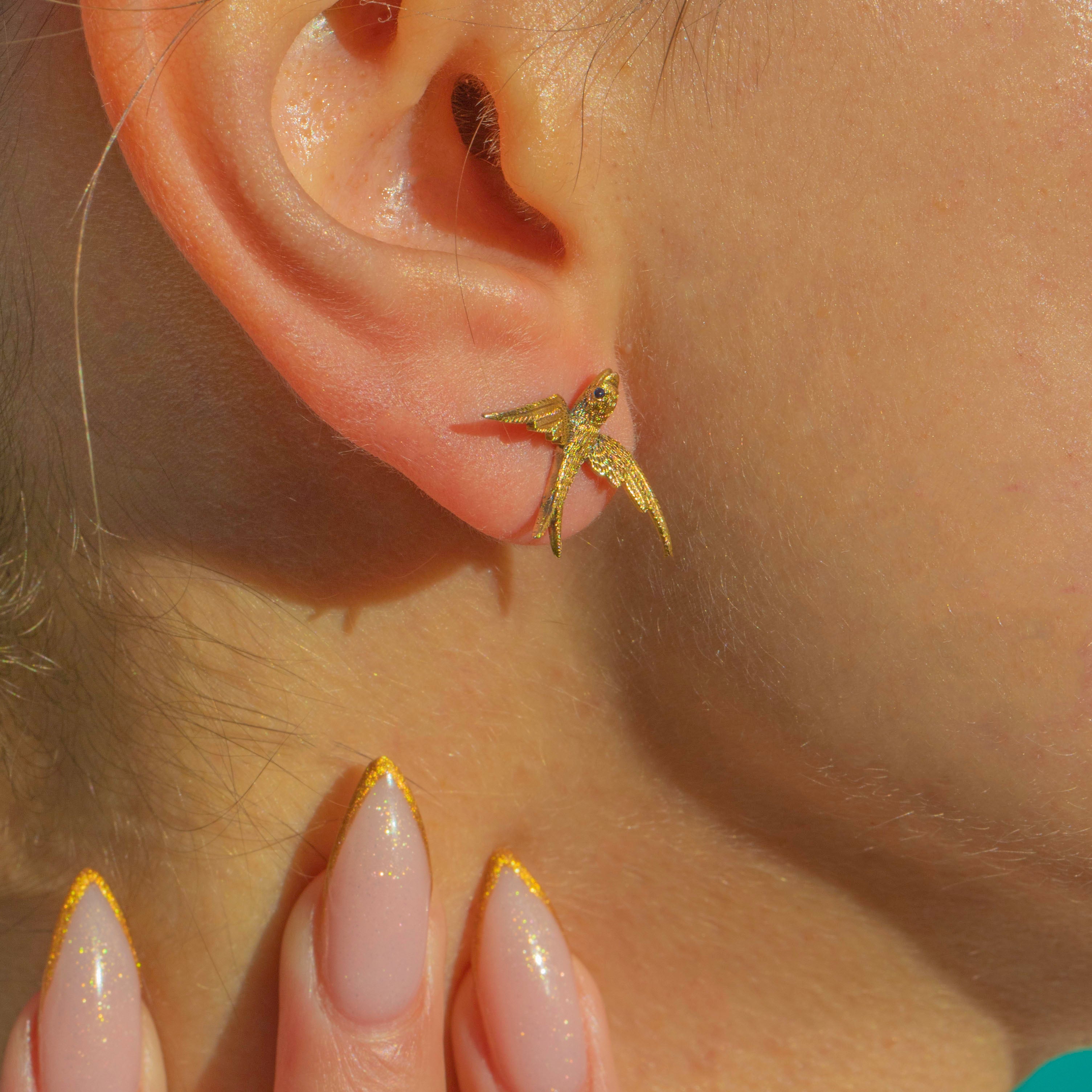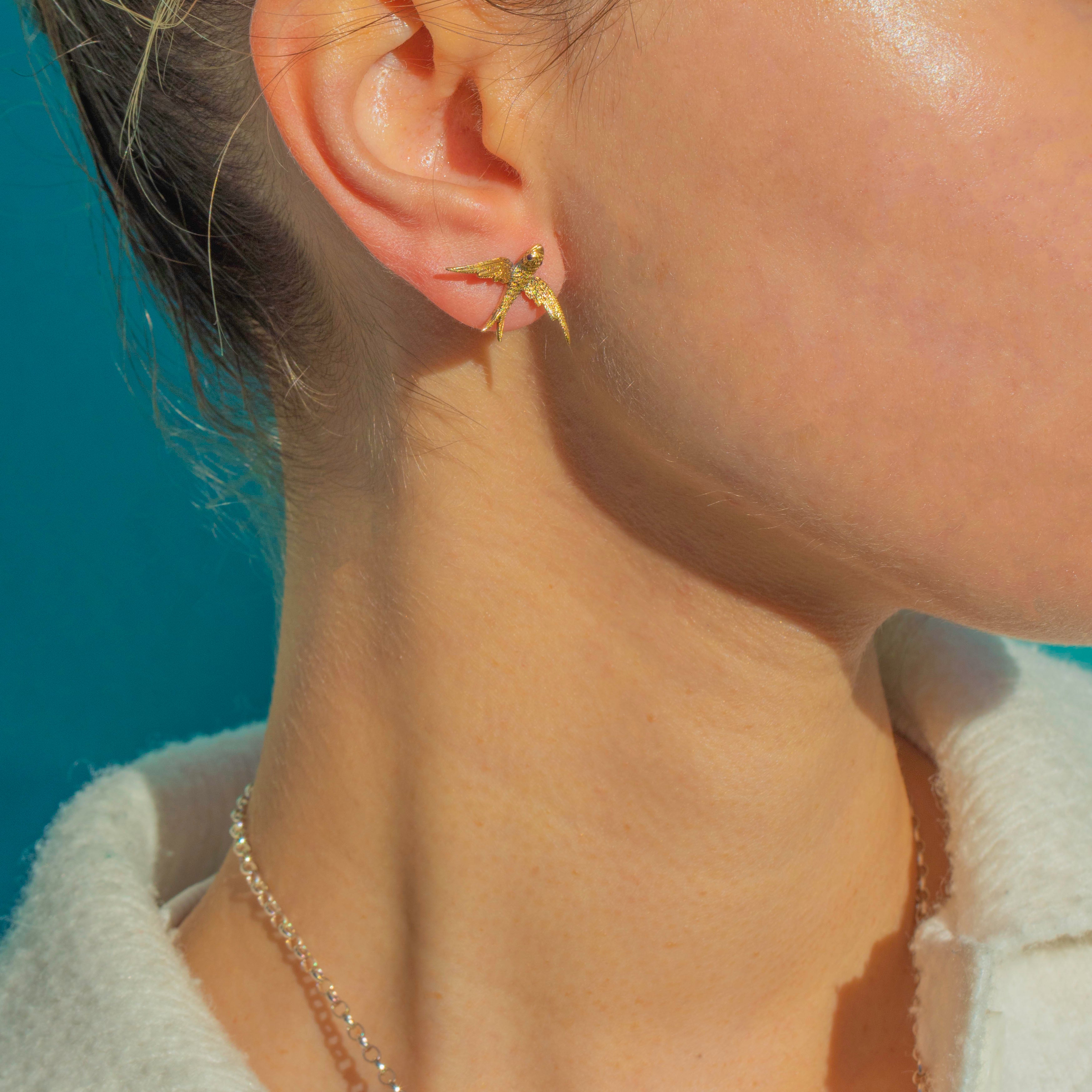 These late Victorian swallow earrings are a charming little love token, captured mid-flight in rich, buttery Gold. Each finely modelled bird is full of texture and detail, from the outstretched wings to the elegantly forked tail, giving them a wonderful sense of movement on the ear.